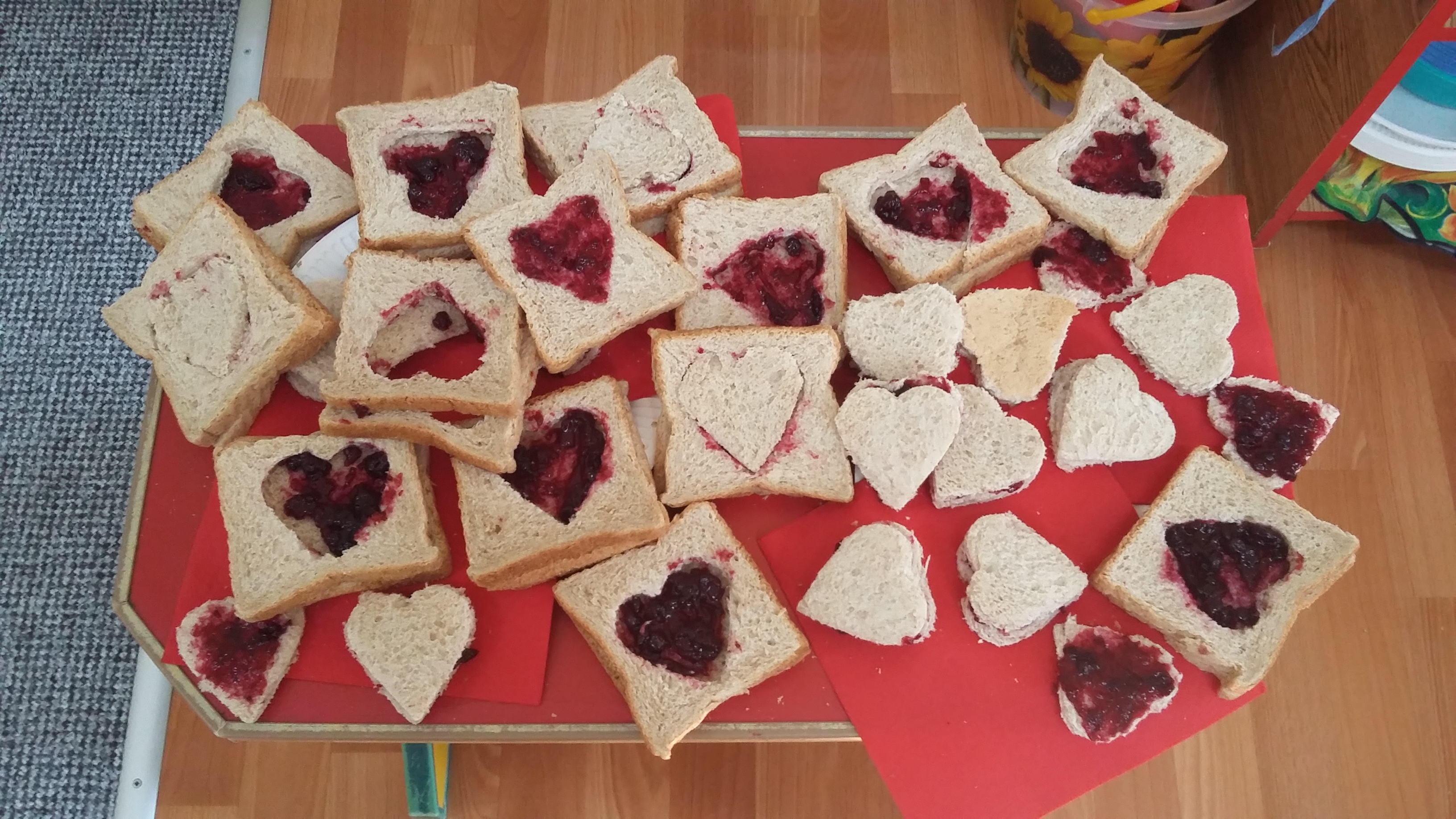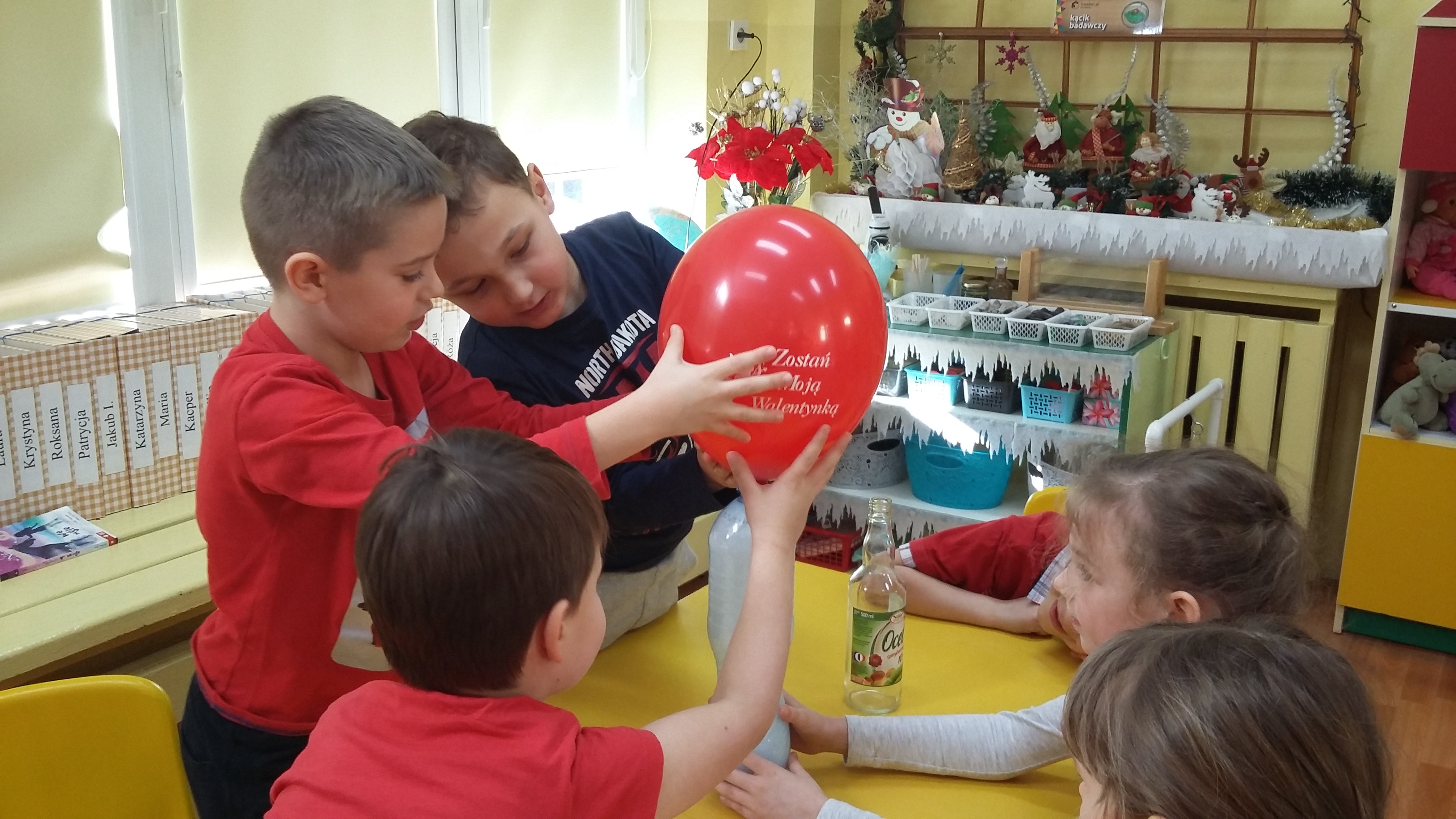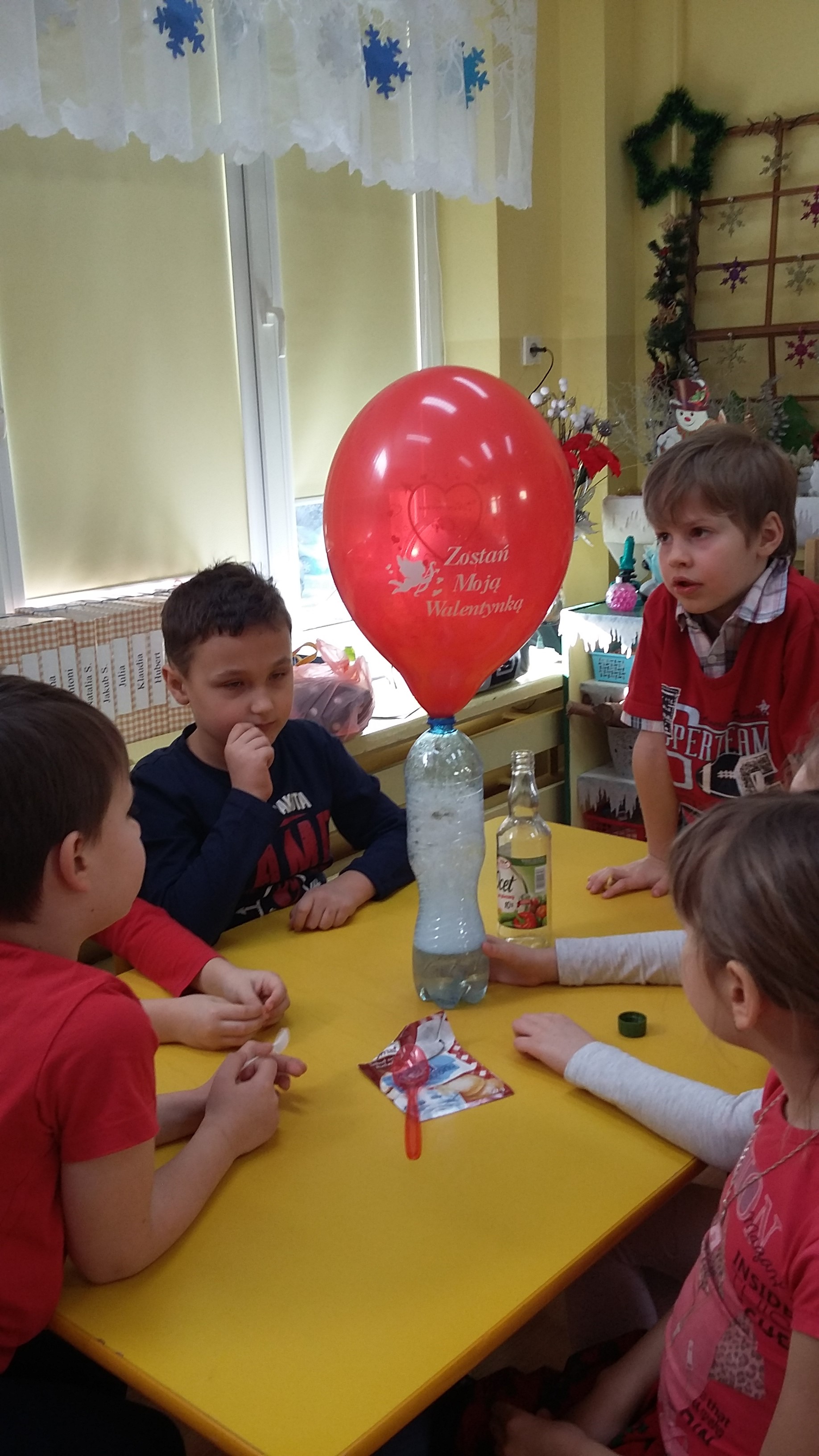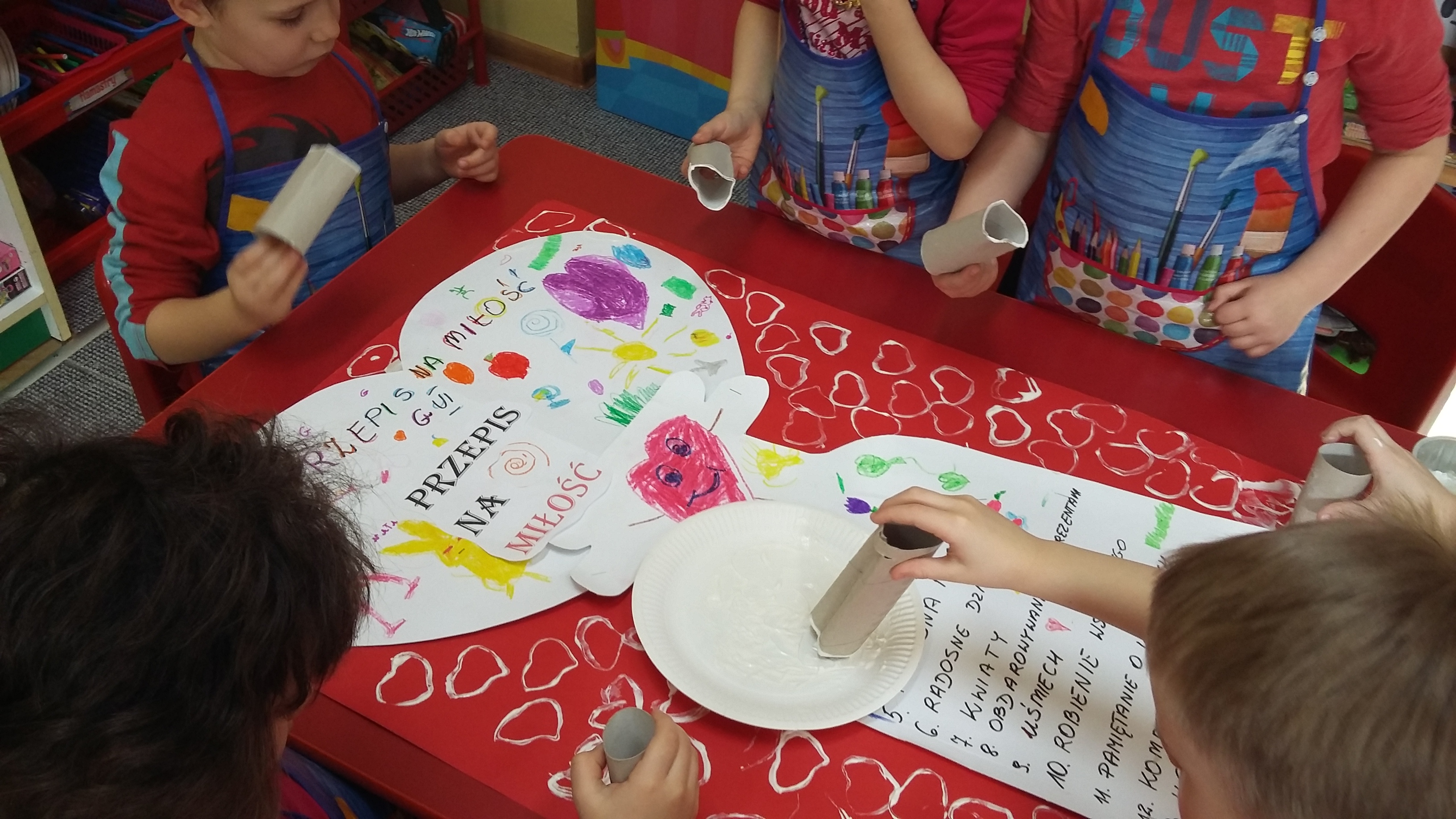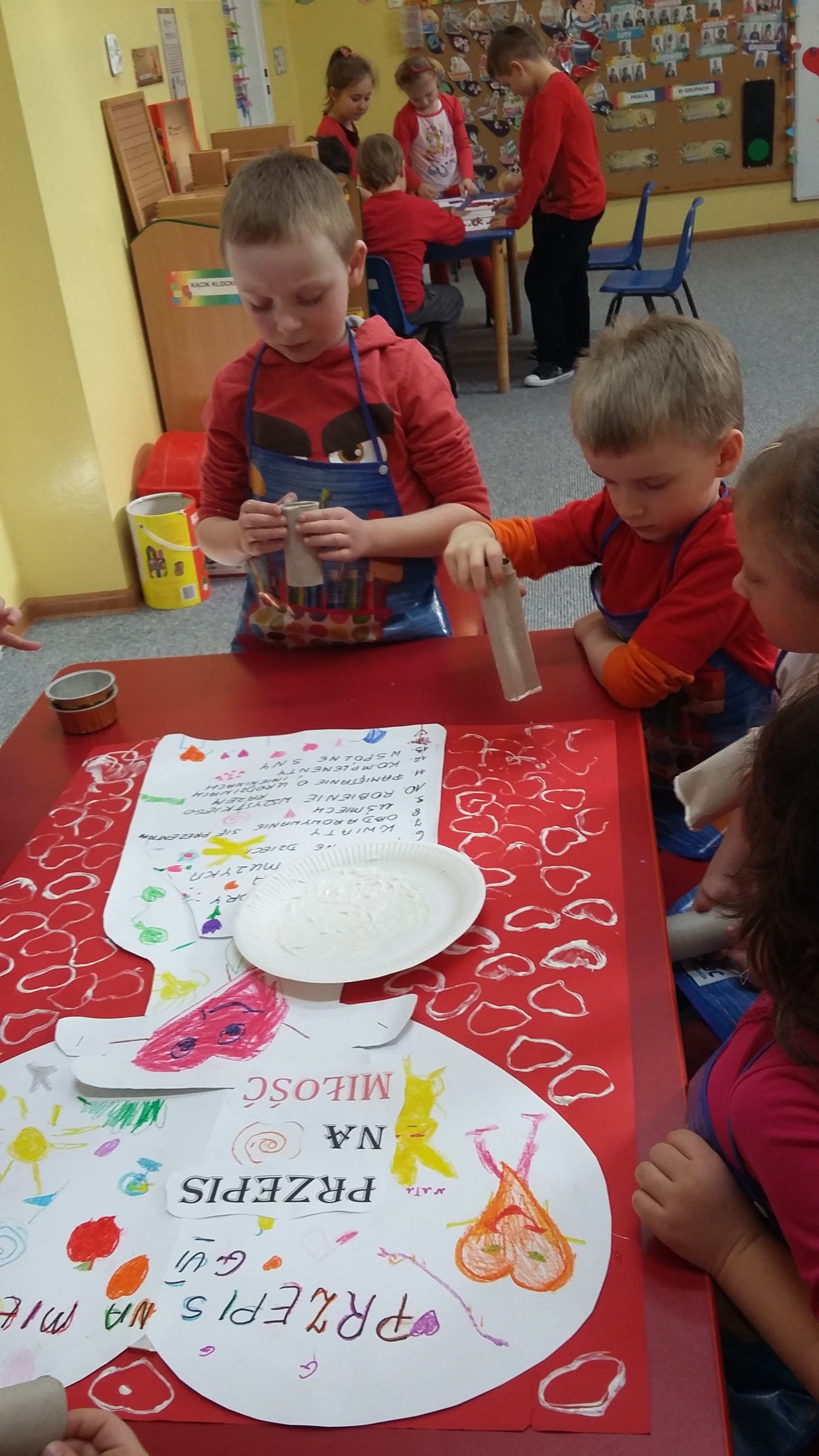 W tym dniu bawiliśmy się w kącikach froeblowskich. W kąciku darów przedszkolaki układały z darów sercowe kompozycje. W kąciku twórczym ozdabialiśmy wykonany wcześniej plakat z „Przepisem na miłość” sercowymi stemplami uformowanymi z rolek po papierze toaletowym. W kąciku badawczym pompowaliśmy walentynkowy balon w nietypowy sposób. Wykorzystaliśmy eksperyment z octem i sodą oczyszczoną i jak się okazało, udało się napompować ogromny balon. W kąciku gospodarczym przygotowaliśmy słodkie przekąski dla zakochanych z wykorzystaniem chleba tostowego, foremki w kształcie serca i marmolady wiśniowej. Powstały przepyszne kanapki o różnych kształtach.