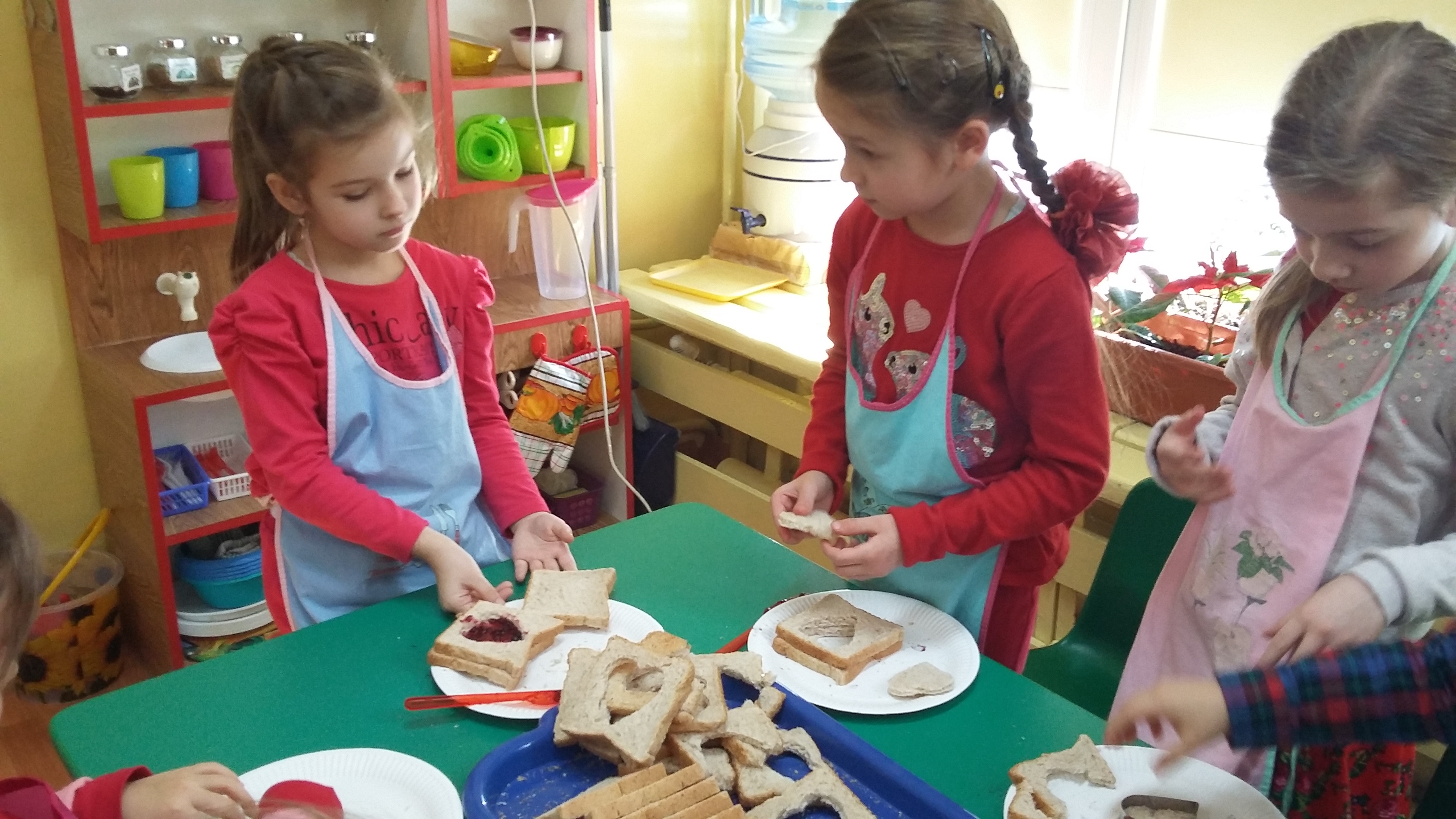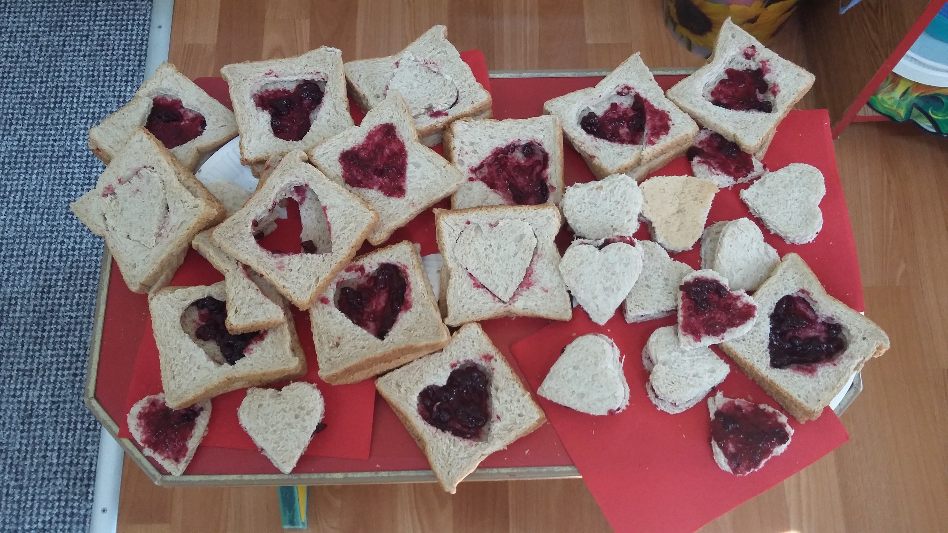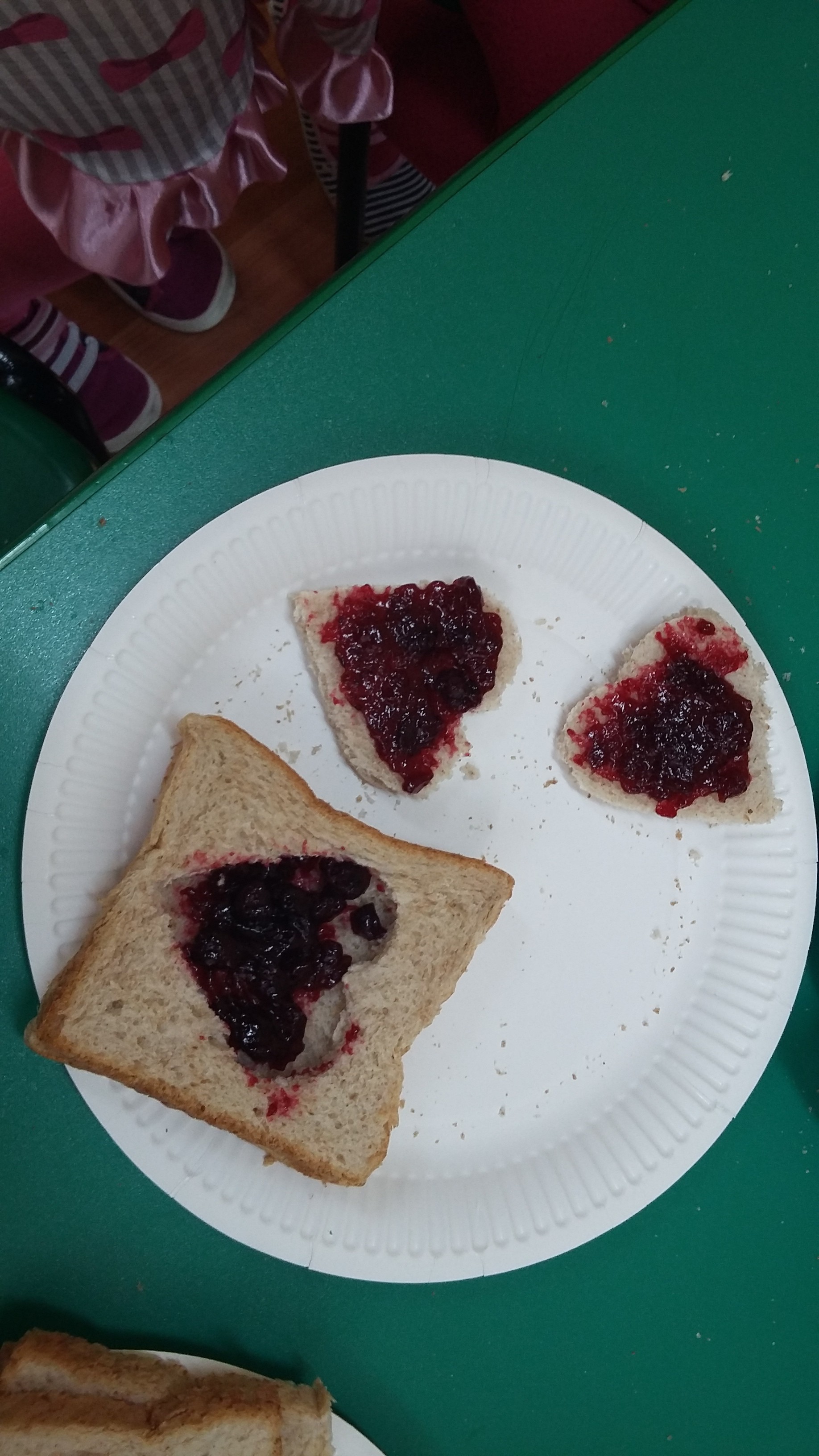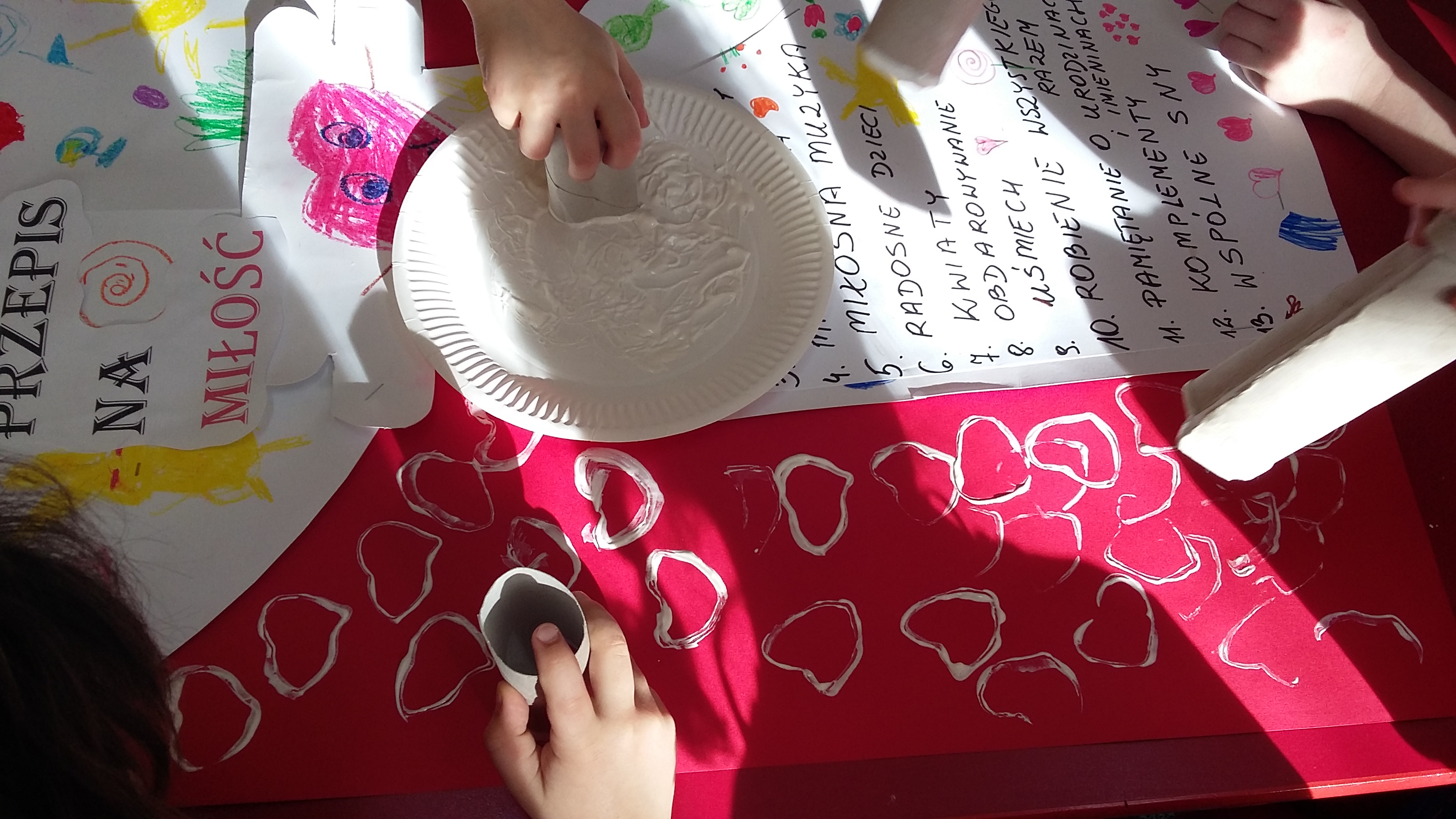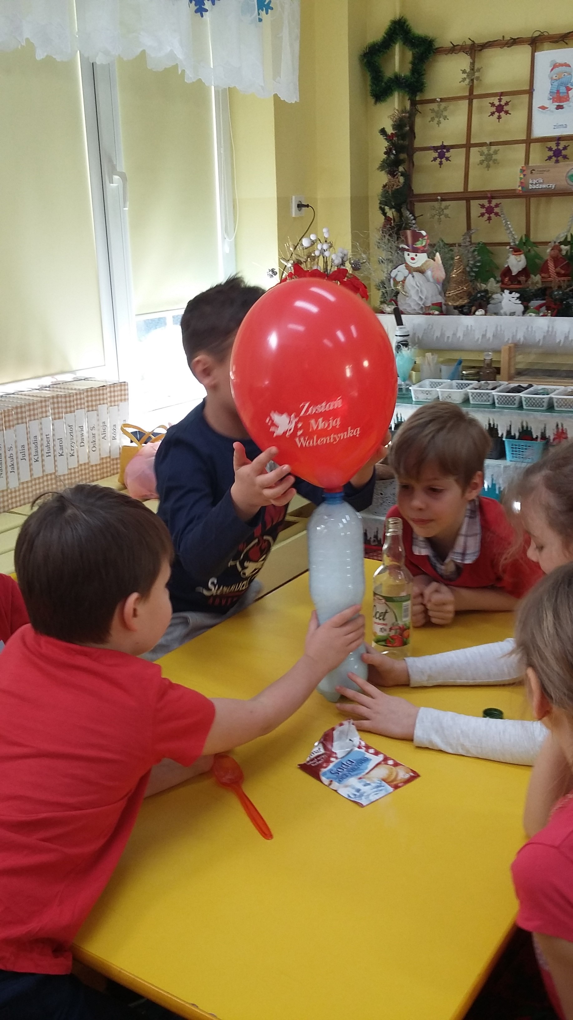 W tym dniu bawiliśmy się w kącikach froeblowskich. W kąciku darów przedszkolaki układały z darów sercowe kompozycje. W kąciku twórczym ozdabialiśmy wykonany wcześniej plakat z „Przepisem na miłość” sercowymi stemplami uformowanymi z rolek po papierze toaletowym. W kąciku badawczym pompowaliśmy walentynkowy balon w nietypowy sposób. Wykorzystaliśmy eksperyment z octem i sodą oczyszczoną i jak się okazało, udało się napompować ogromny balon. W kąciku gospodarczym przygotowaliśmy słodkie przekąski dla zakochanych z wykorzystaniem chleba tostowego, foremki w kształcie serca i marmolady wiśniowej. Powstały przepyszne kanapki o różnych kształtach.