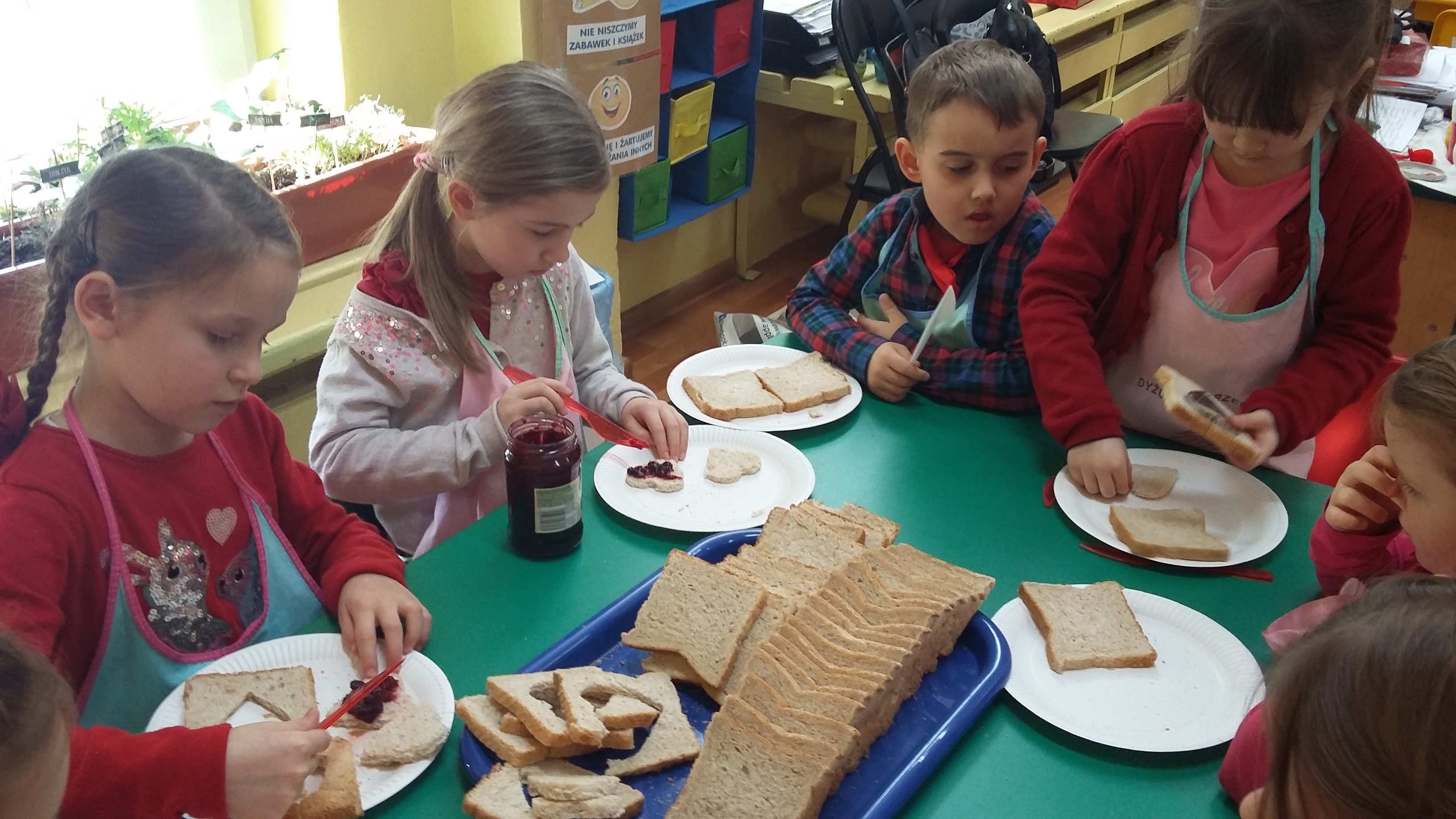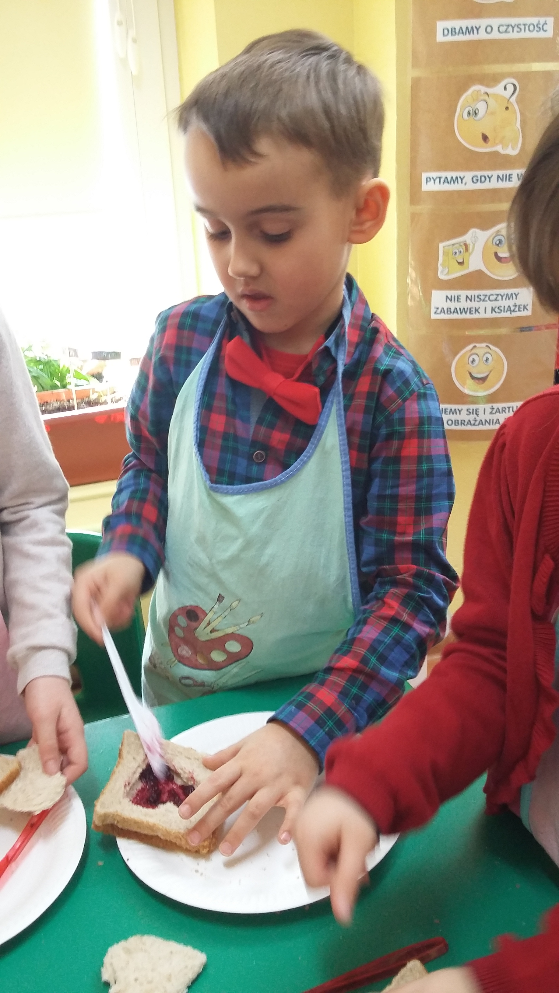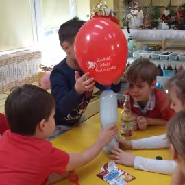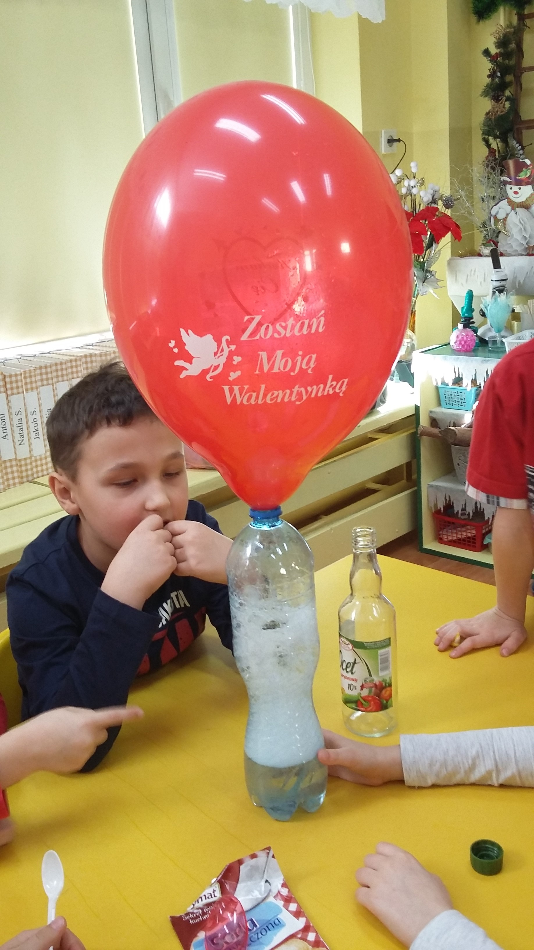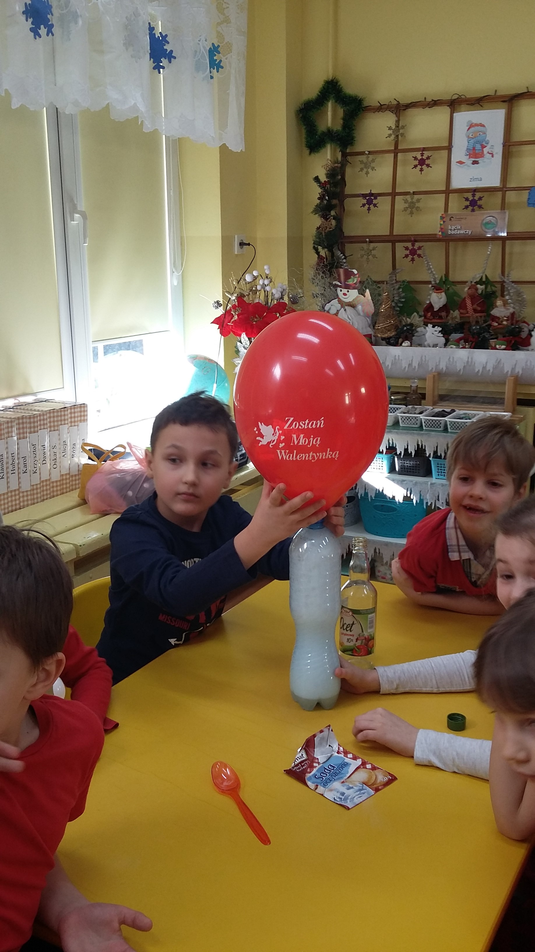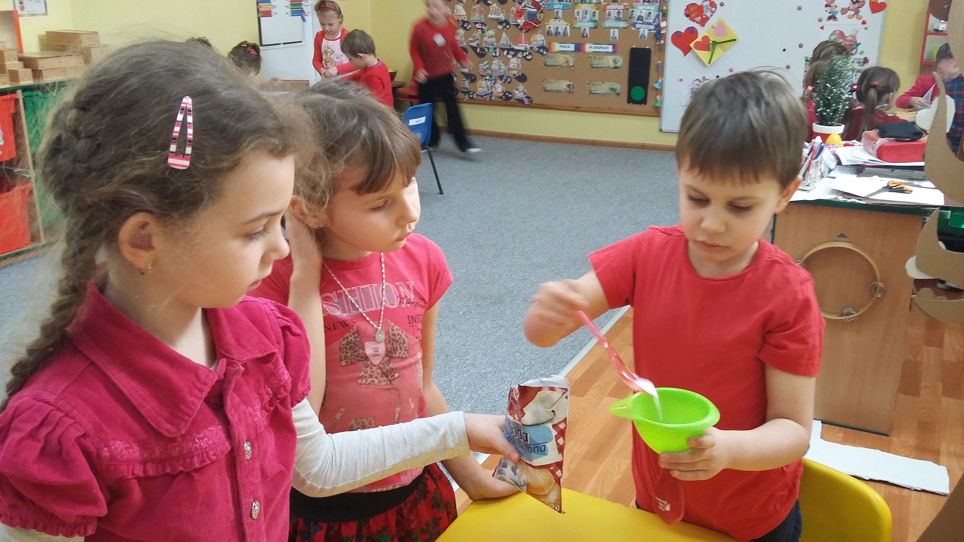 W tym dniu bawiliśmy się w kącikach froeblowskich. W kąciku darów przedszkolaki układały z darów sercowe kompozycje. W kąciku twórczym ozdabialiśmy wykonany wcześniej plakat z „Przepisem na miłość” sercowymi stemplami uformowanymi z rolek po papierze toaletowym. W kąciku badawczym pompowaliśmy walentynkowy balon w nietypowy sposób. Wykorzystaliśmy eksperyment z octem i sodą oczyszczoną i jak się okazało, udało się napompować ogromny balon. W kąciku gospodarczym przygotowaliśmy słodkie przekąski dla zakochanych z wykorzystaniem chleba tostowego, foremki w kształcie serca i marmolady wiśniowej. Powstały przepyszne kanapki o różnych kształtach.