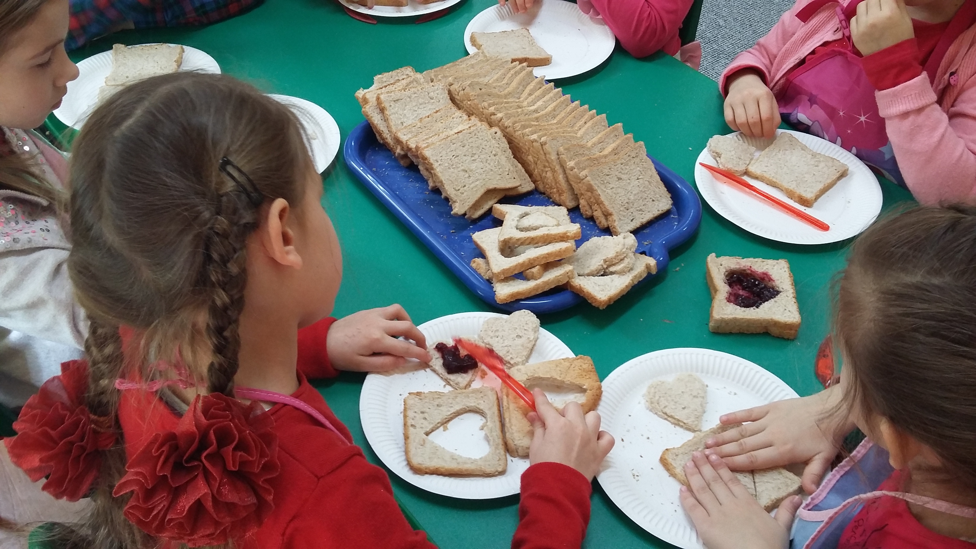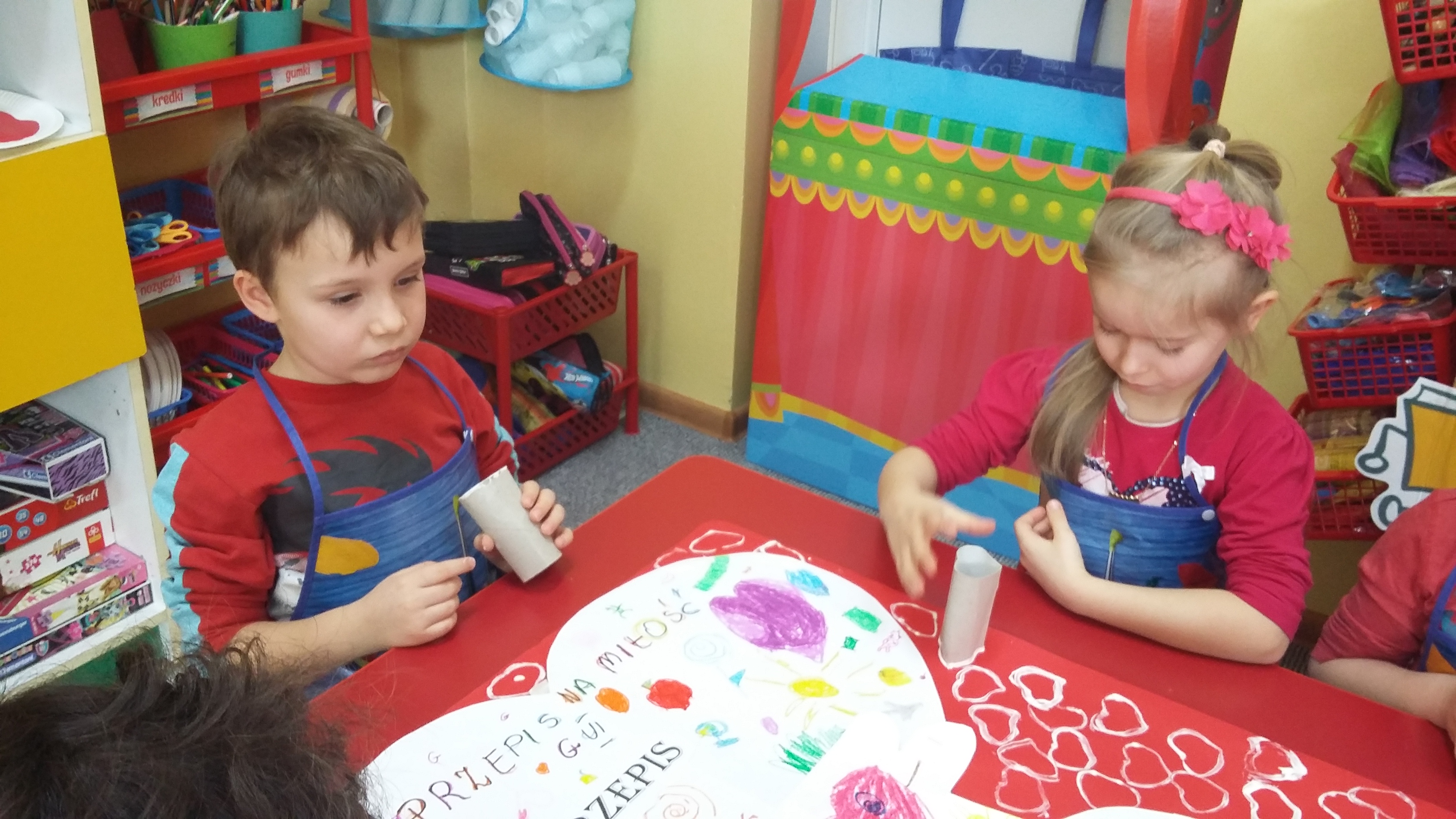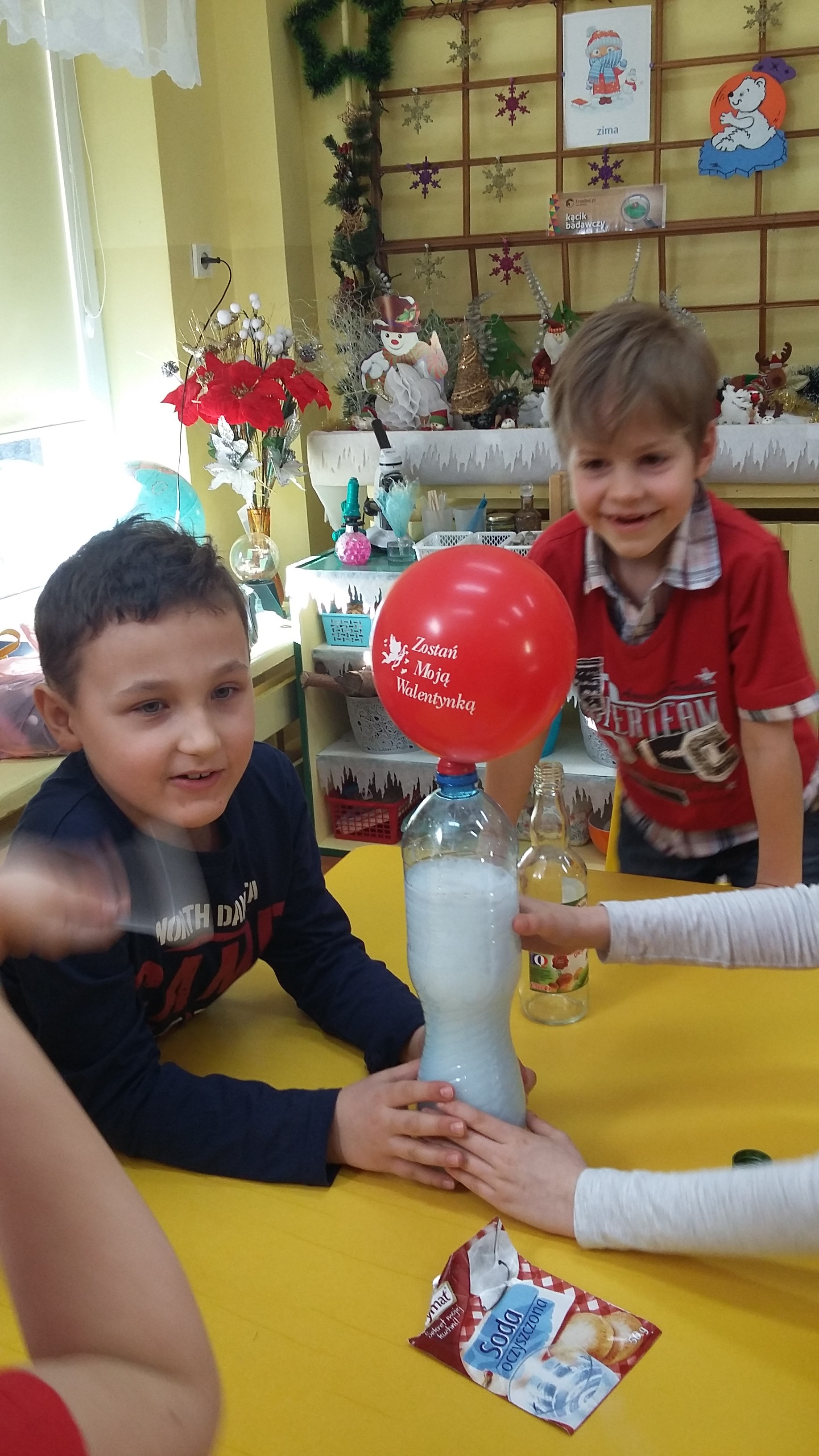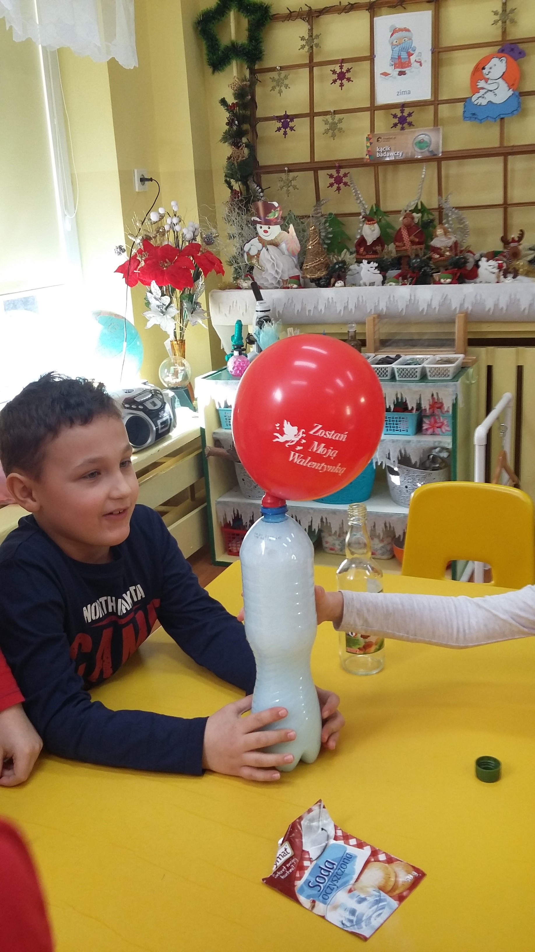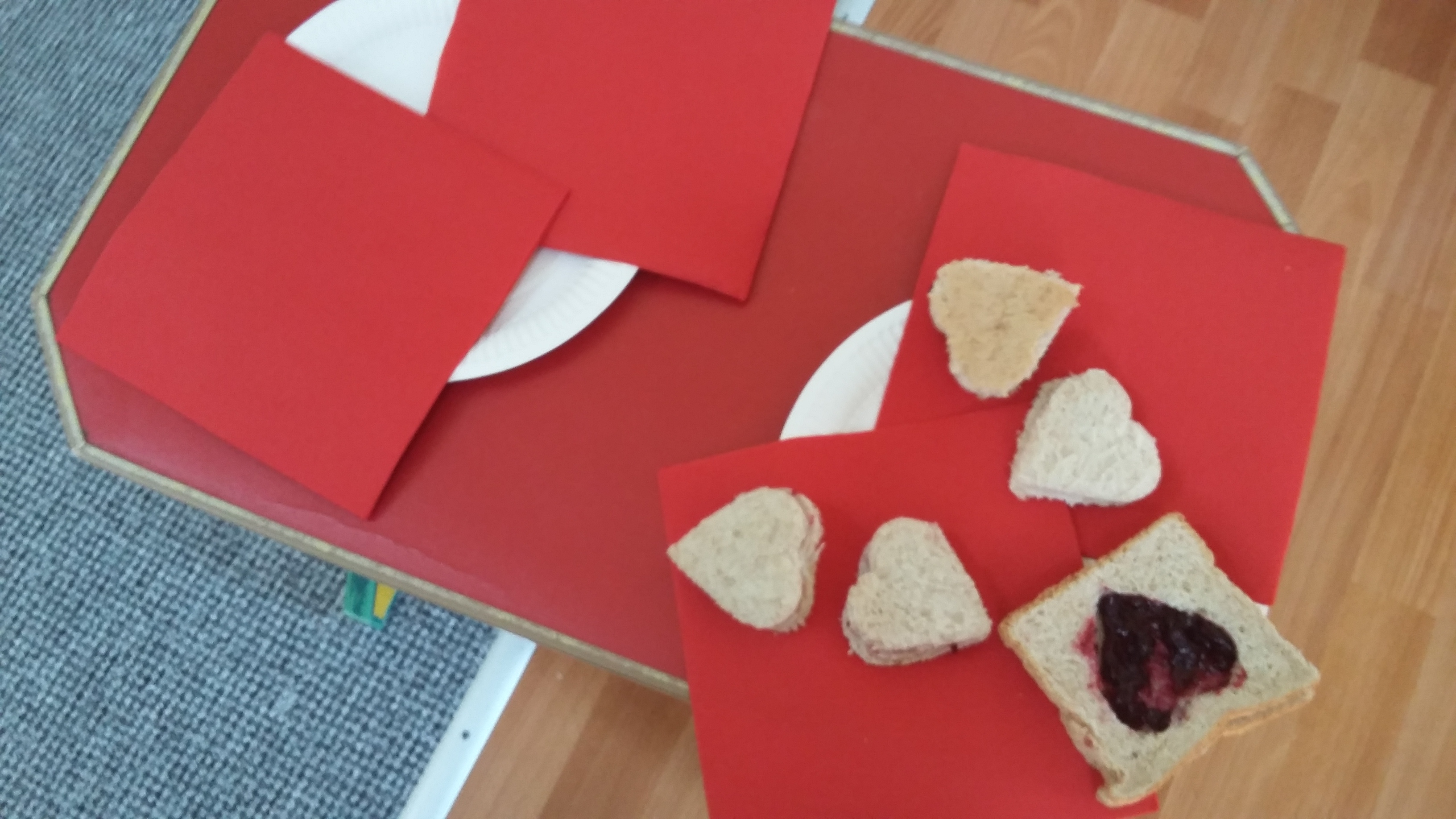 W tym dniu bawiliśmy się w kącikach froeblowskich. W kąciku darów przedszkolaki układały z darów sercowe kompozycje. W kąciku twórczym ozdabialiśmy wykonany wcześniej plakat z „Przepisem na miłość” sercowymi stemplami uformowanymi z rolek po papierze toaletowym. W kąciku badawczym pompowaliśmy walentynkowy balon w nietypowy sposób. Wykorzystaliśmy eksperyment z octem i sodą oczyszczoną i jak się okazało, udało się napompować ogromny balon. W kąciku gospodarczym przygotowaliśmy słodkie przekąski dla zakochanych z wykorzystaniem chleba tostowego, foremki w kształcie serca i marmolady wiśniowej. Powstały przepyszne kanapki o różnych kształtach.
