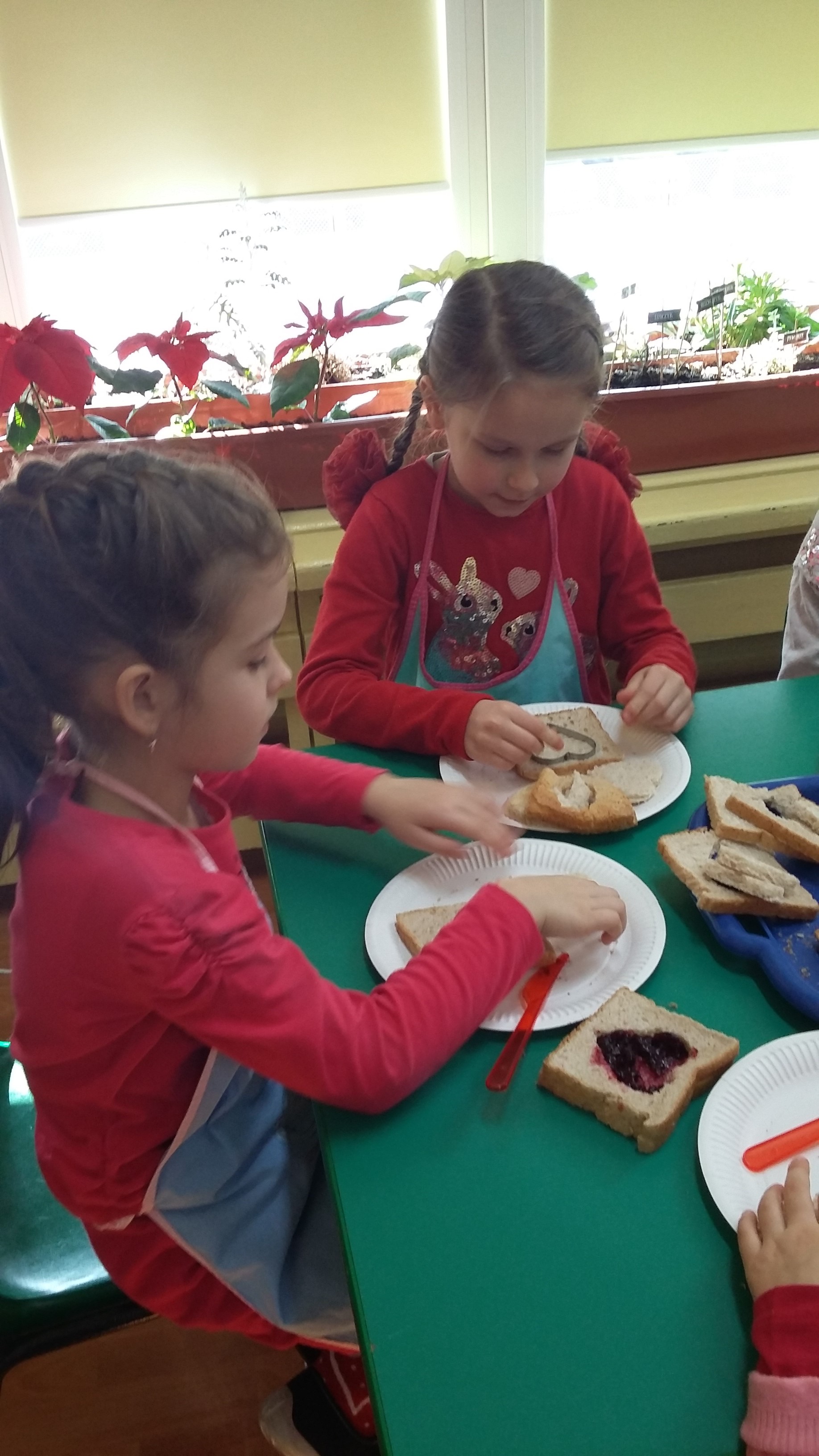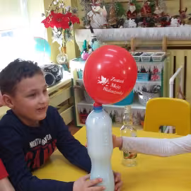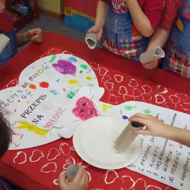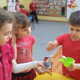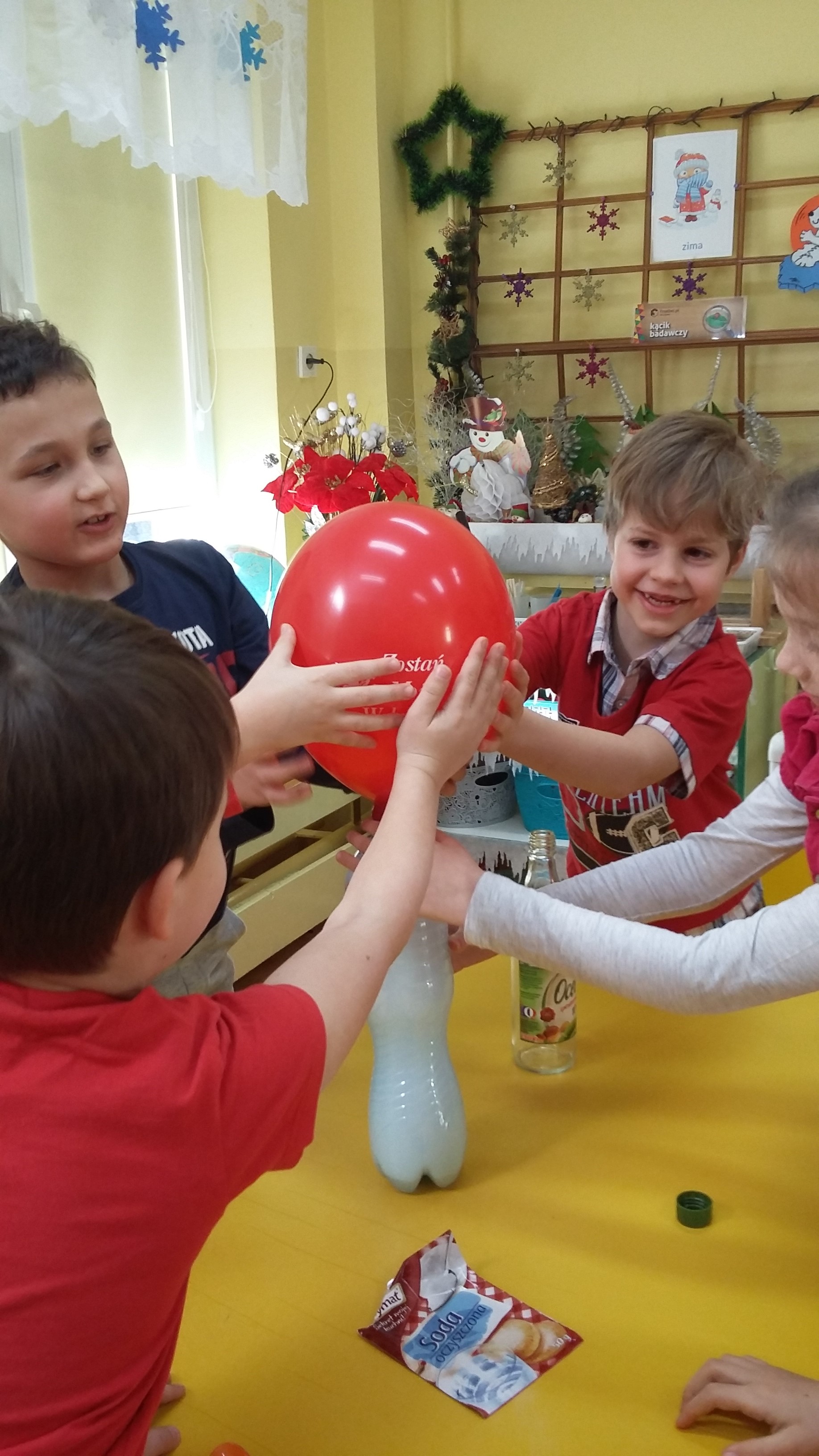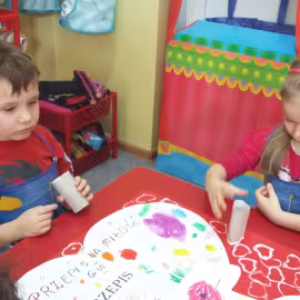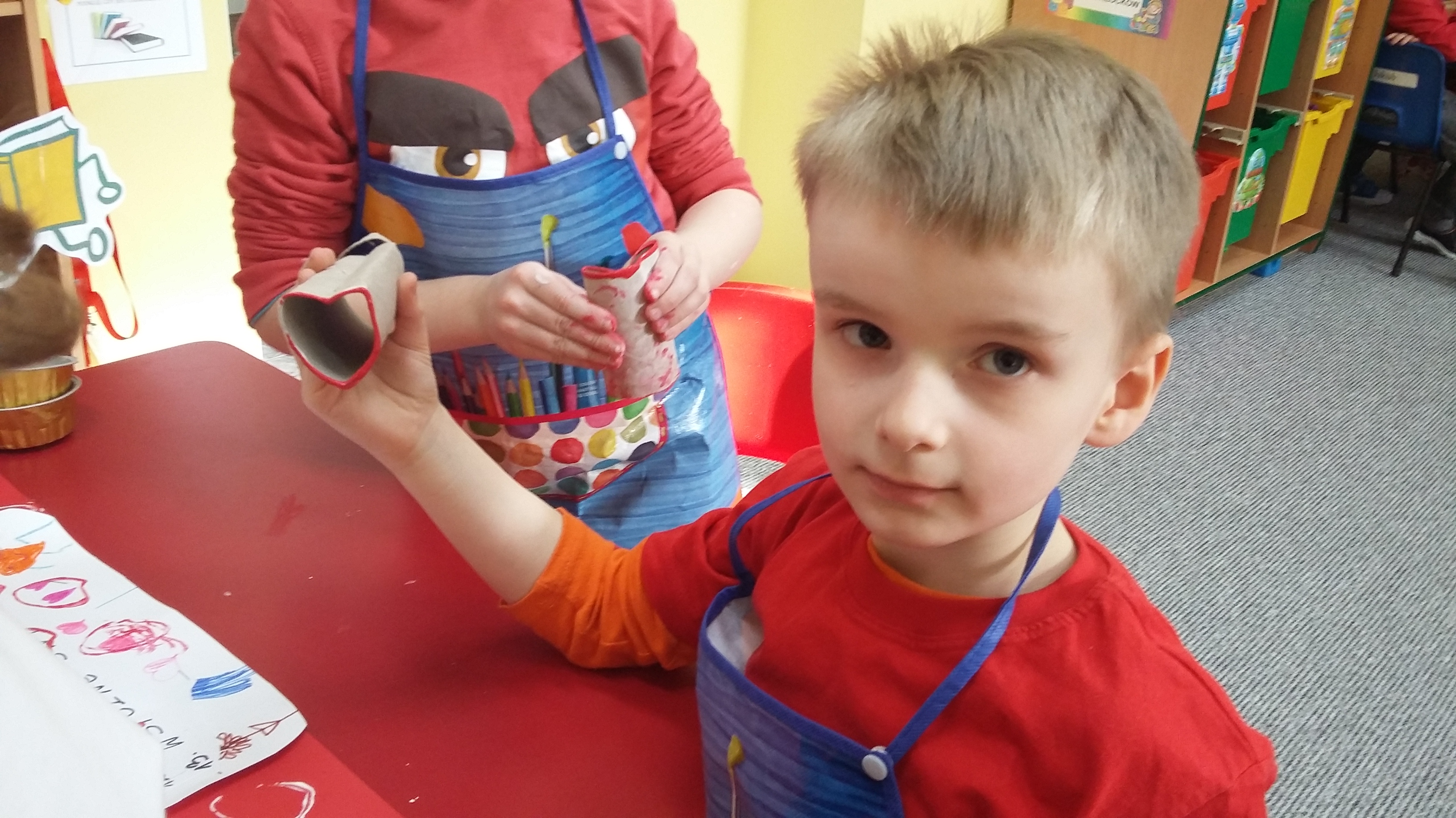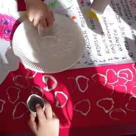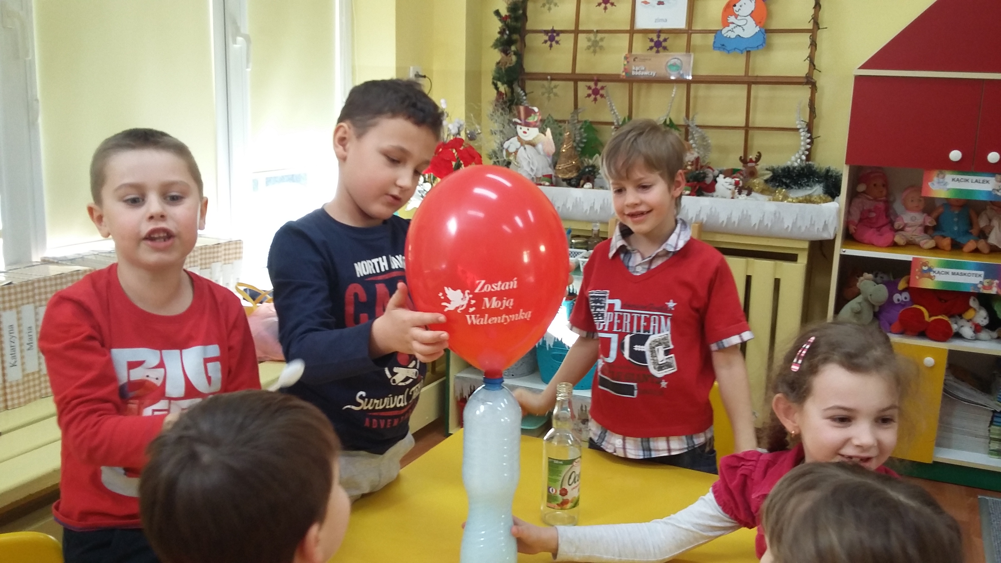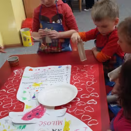 W tym dniu bawiliśmy się w kącikach froeblowskich. W kąciku darów przedszkolaki układały z darów sercowe kompozycje. W kąciku twórczym ozdabialiśmy wykonany wcześniej plakat z „Przepisem na miłość” sercowymi stemplami uformowanymi z rolek po papierze toaletowym. W kąciku badawczym pompowaliśmy walentynkowy balon w nietypowy sposób. Wykorzystaliśmy eksperyment z octem i sodą oczyszczoną i jak się okazało, udało się napompować ogromny balon. W kąciku gospodarczym przygotowaliśmy słodkie przekąski dla zakochanych z wykorzystaniem chleba tostowego, foremki w kształcie serca i marmolady wiśniowej. Powstały przepyszne kanapki o różnych kształtach.