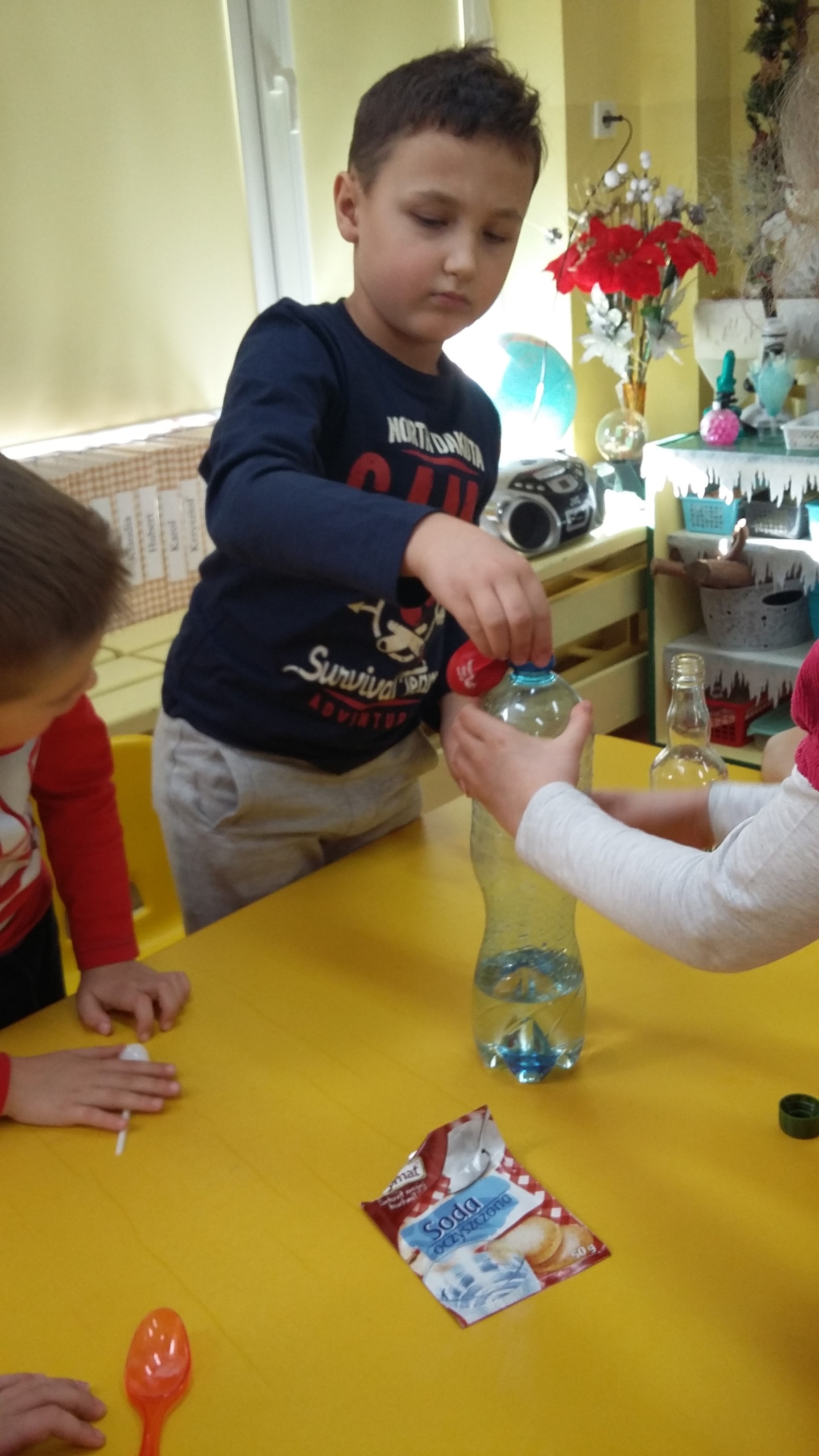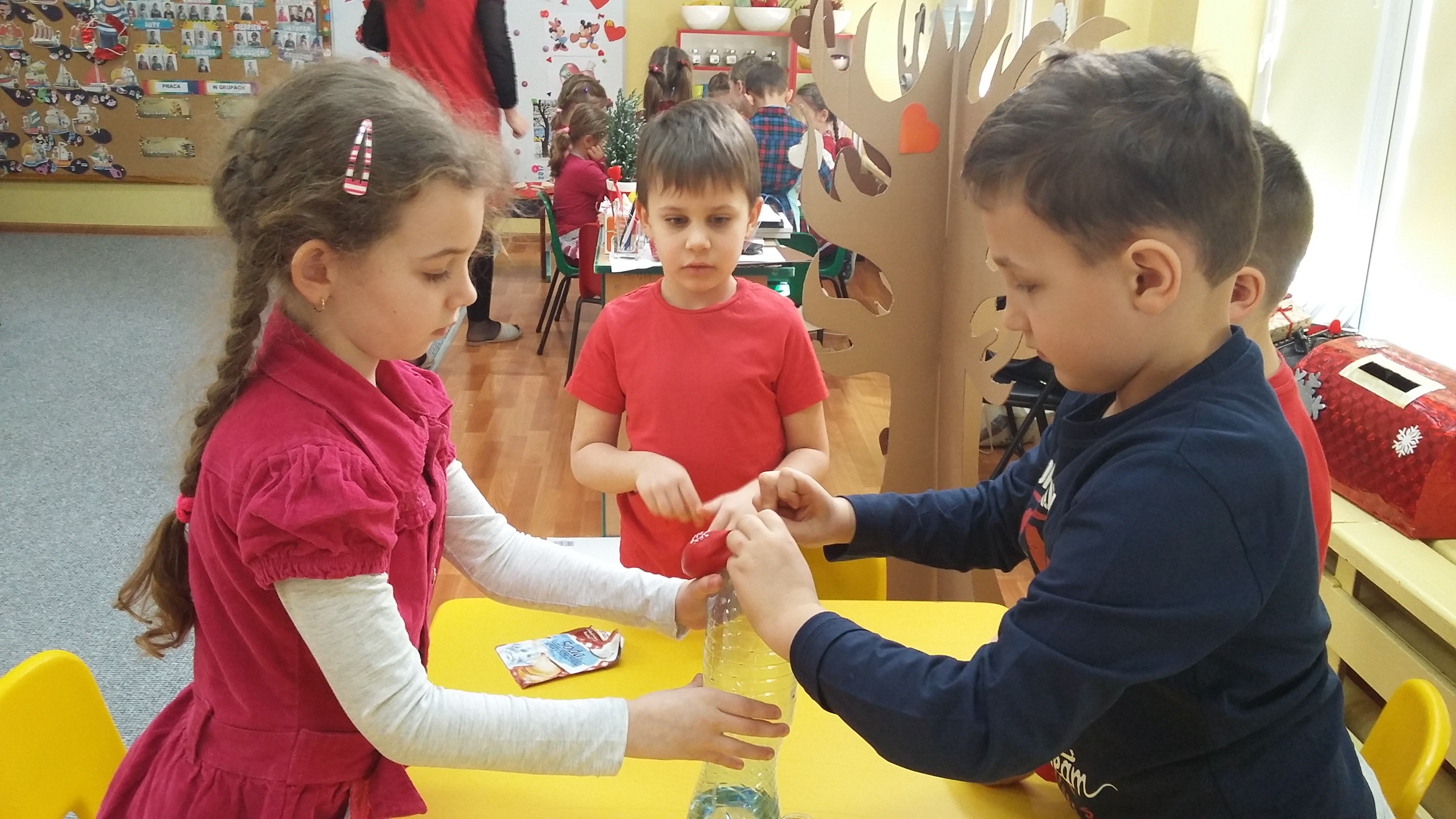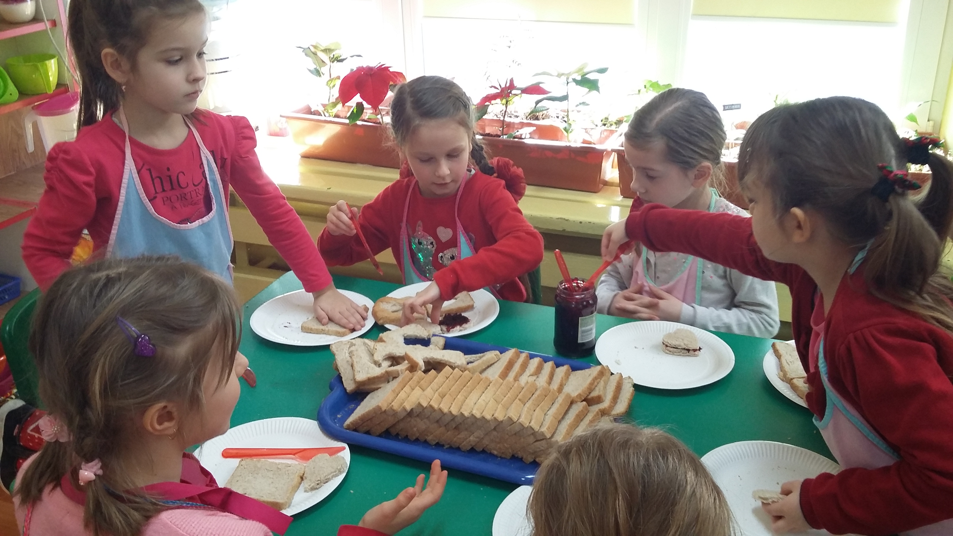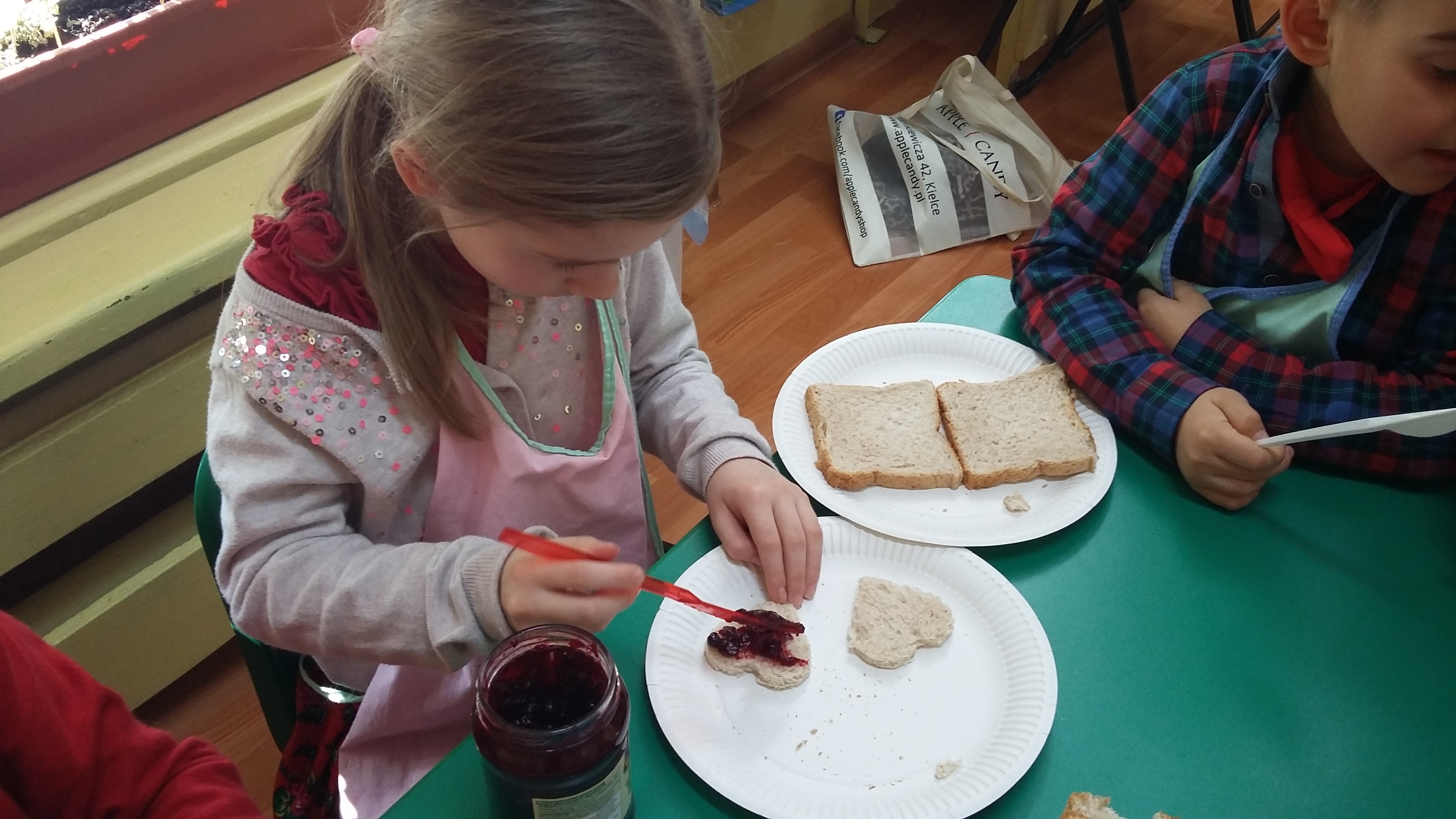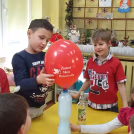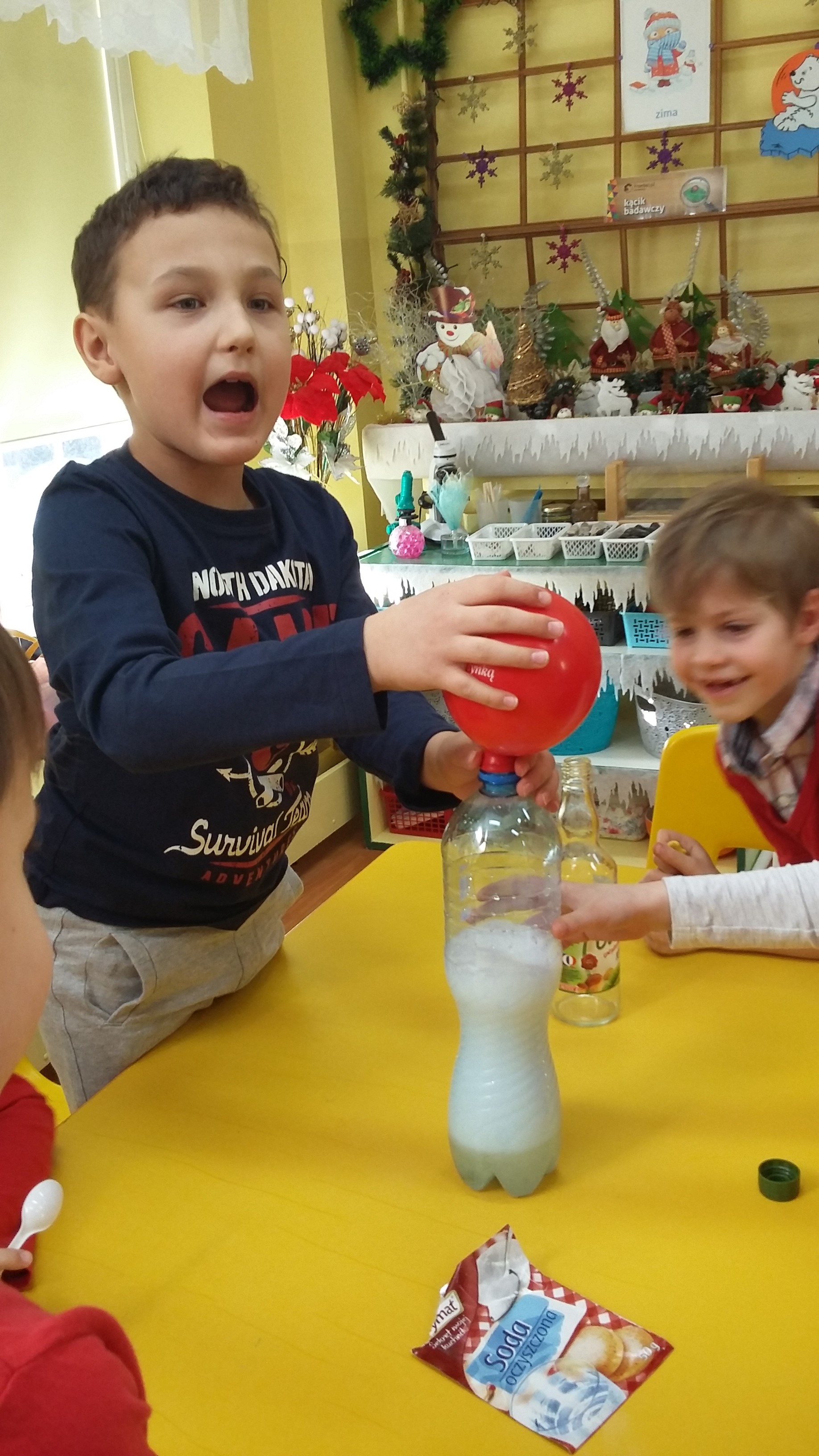W tym dniu bawiliśmy się w kącikach froeblowskich. W kąciku darów przedszkolaki układały z darów sercowe kompozycje. W kąciku twórczym ozdabialiśmy wykonany wcześniej plakat z „Przepisem na miłość” sercowymi stemplami uformowanymi z rolek po papierze toaletowym. W kąciku badawczym pompowaliśmy walentynkowy balon w nietypowy sposób. Wykorzystaliśmy eksperyment z octem i sodą oczyszczoną i jak się okazało, udało się napompować ogromny balon. W kąciku gospodarczym przygotowaliśmy słodkie przekąski dla zakochanych z wykorzystaniem chleba tostowego, foremki w kształcie serca i marmolady wiśniowej. Powstały przepyszne kanapki o różnych kształtach.