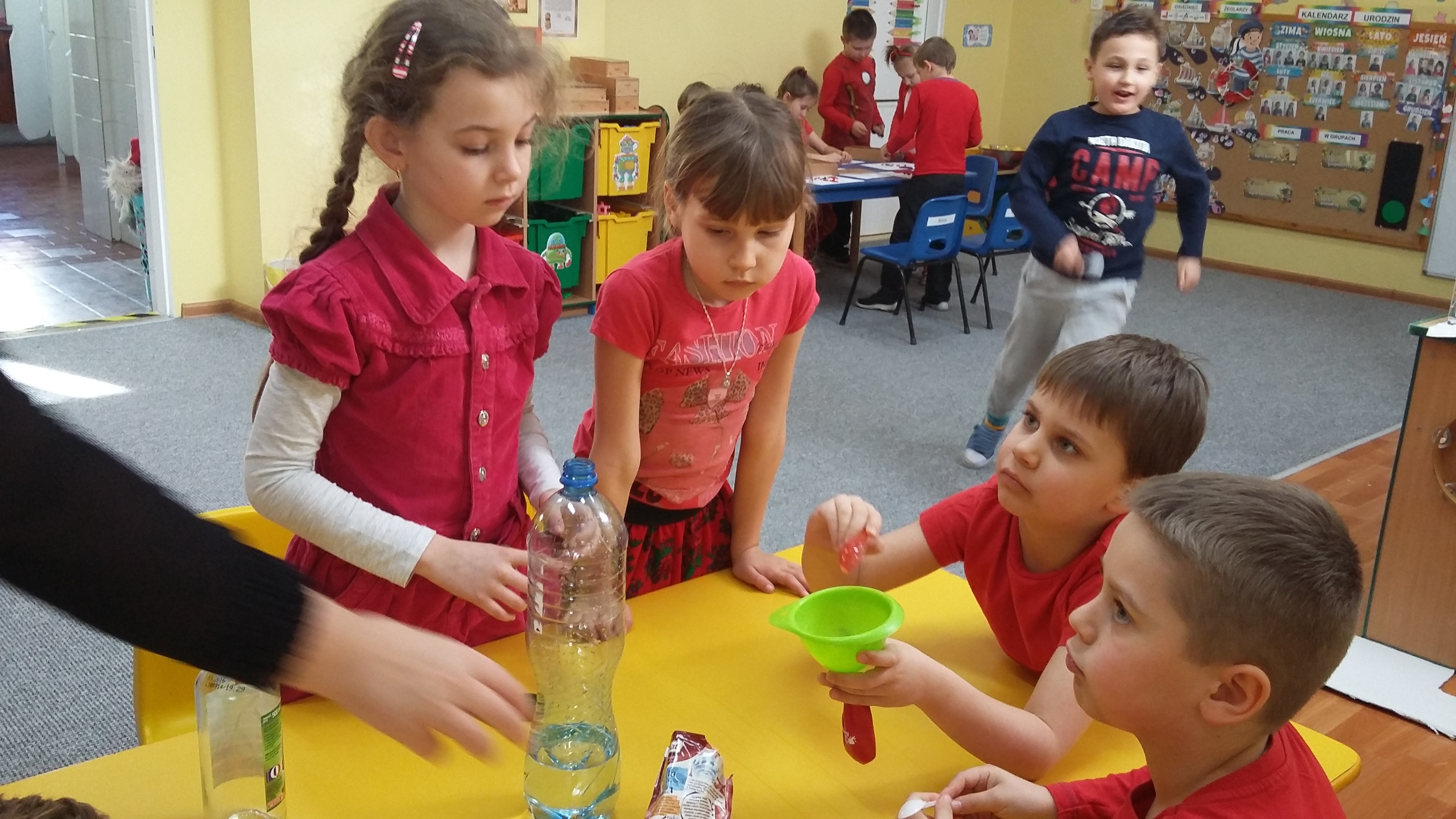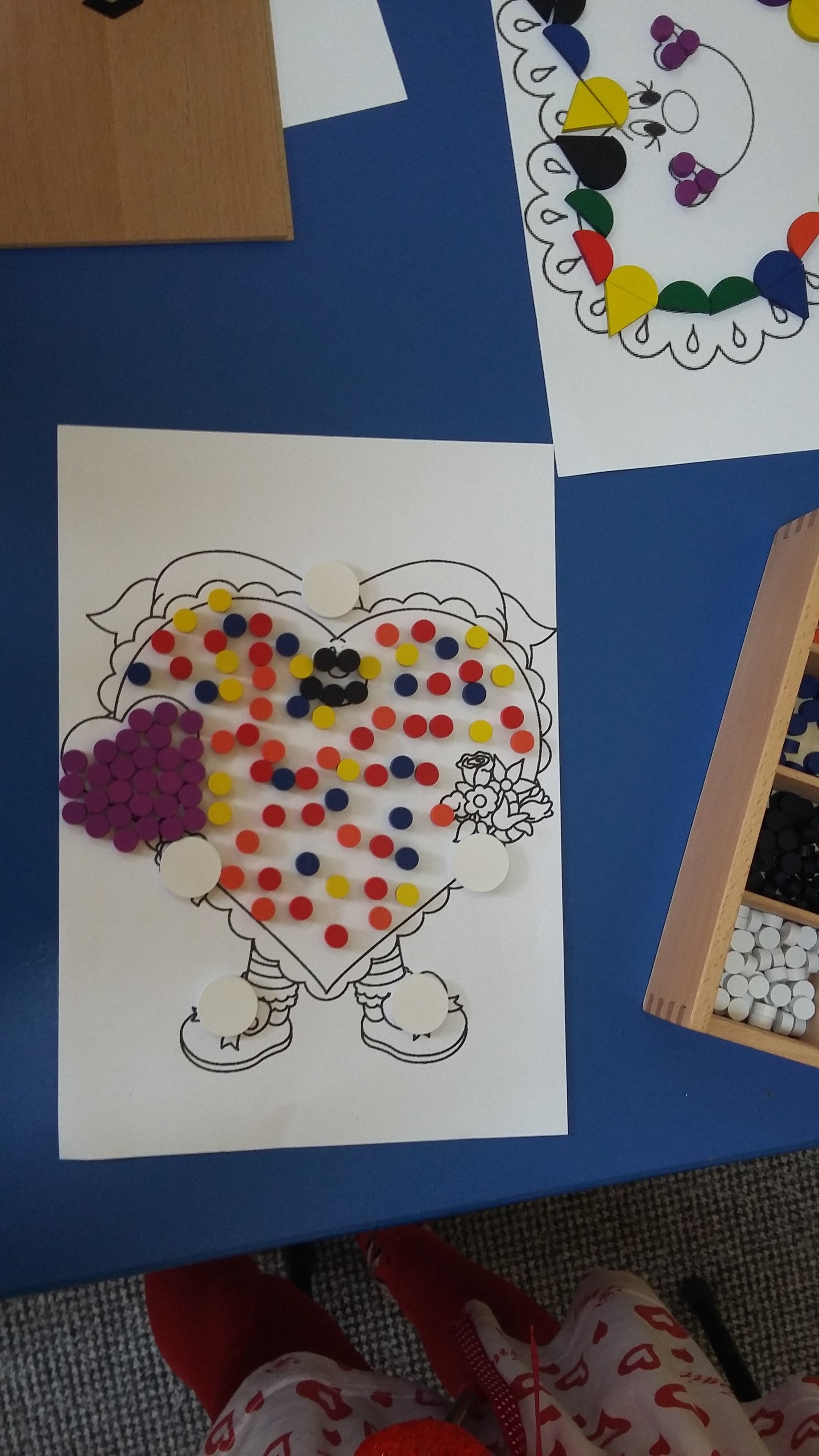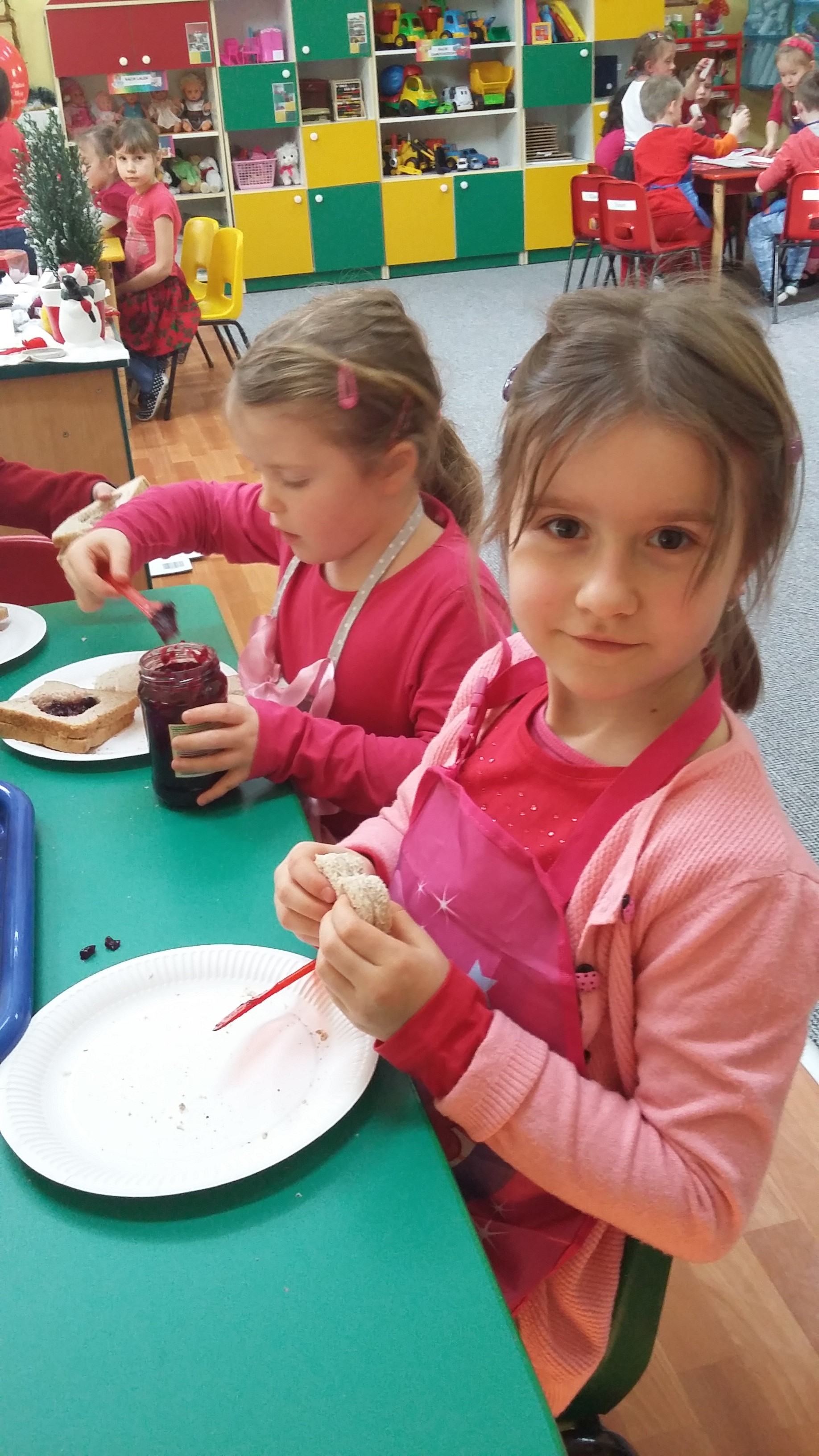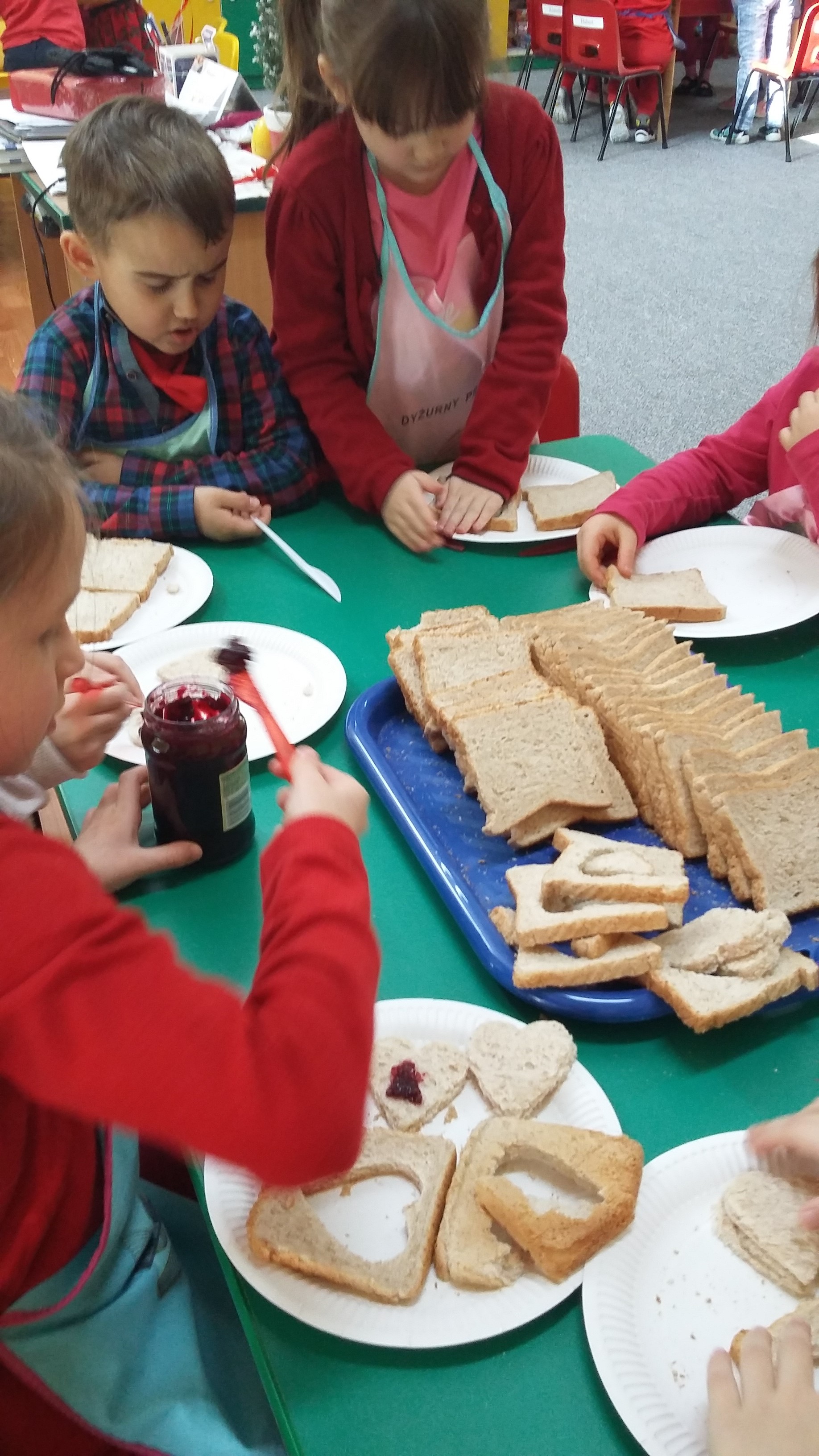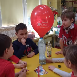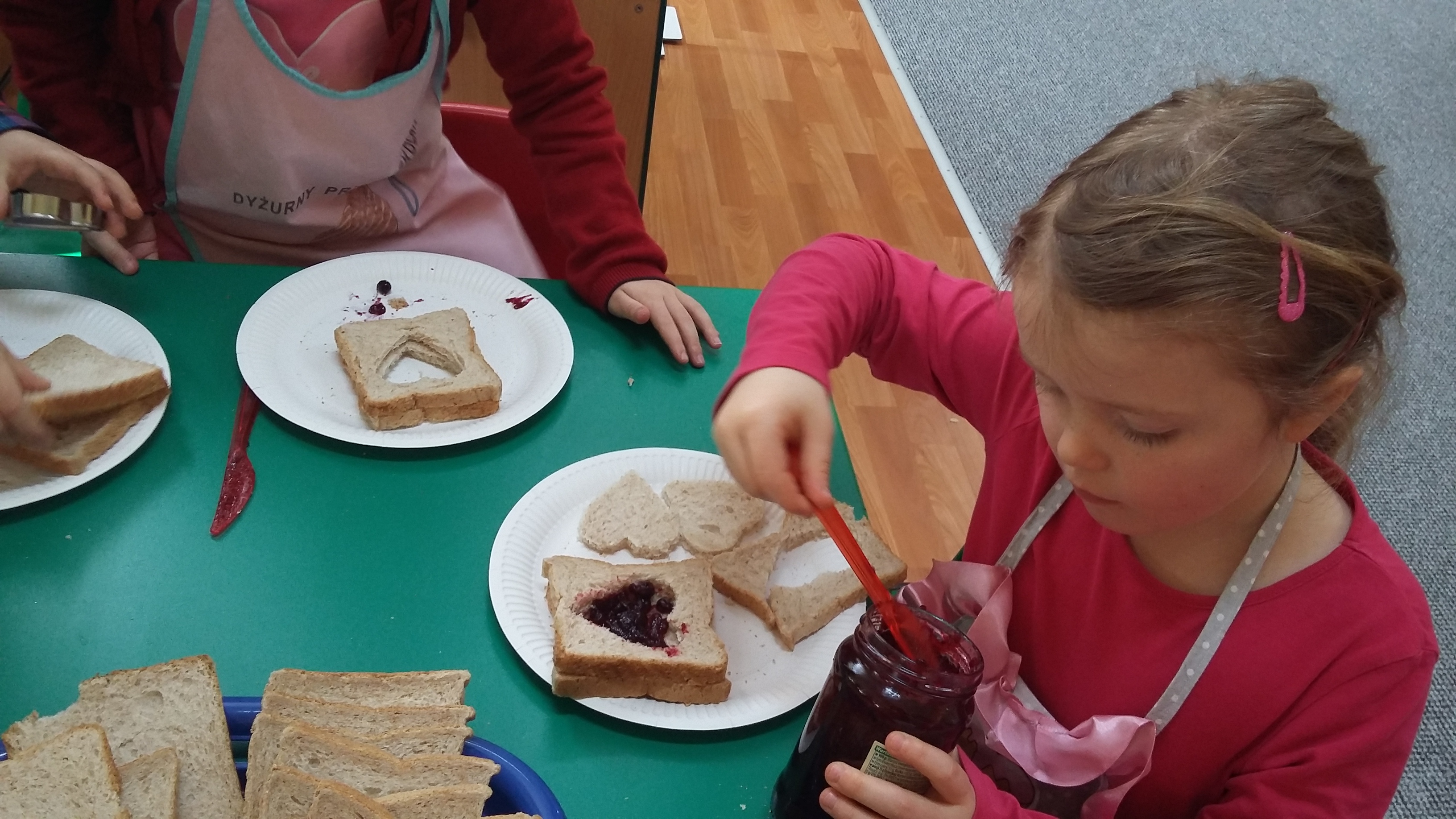 W tym dniu bawiliśmy się w kącikach froeblowskich. W kąciku darów przedszkolaki układały z darów sercowe kompozycje. W kąciku twórczym ozdabialiśmy wykonany wcześniej plakat z „Przepisem na miłość” sercowymi stemplami uformowanymi z rolek po papierze toaletowym. W kąciku badawczym pompowaliśmy walentynkowy balon w nietypowy sposób. Wykorzystaliśmy eksperyment z octem i sodą oczyszczoną i jak się okazało, udało się napompować ogromny balon. W kąciku gospodarczym przygotowaliśmy słodkie przekąski dla zakochanych z wykorzystaniem chleba tostowego, foremki w kształcie serca i marmolady wiśniowej. Powstały przepyszne kanapki o różnych kształtach.
