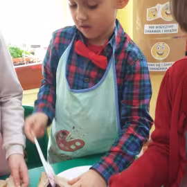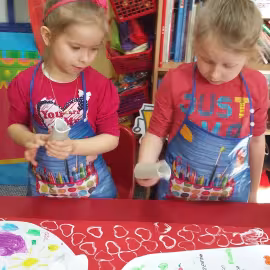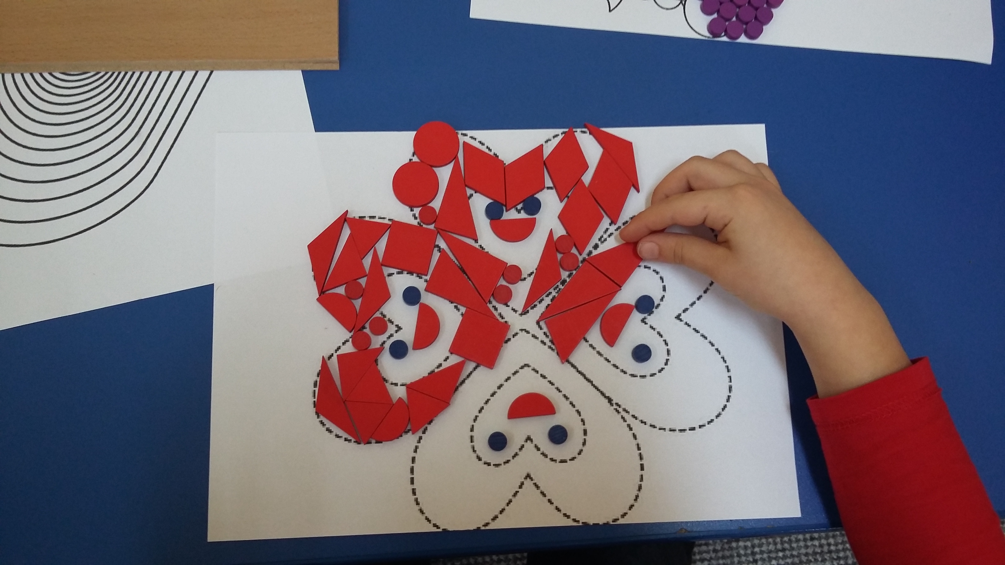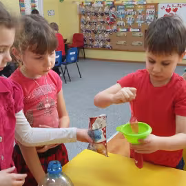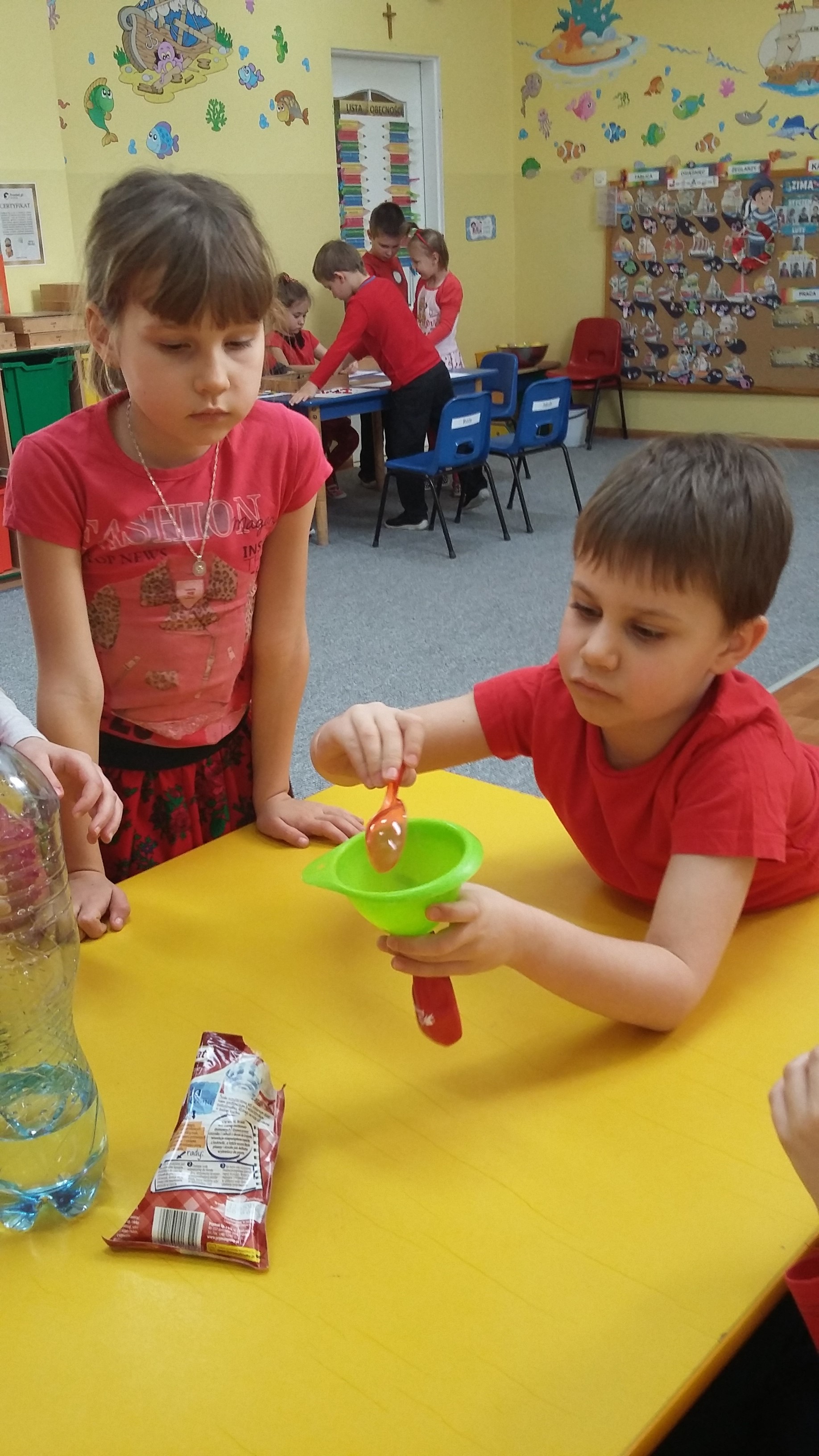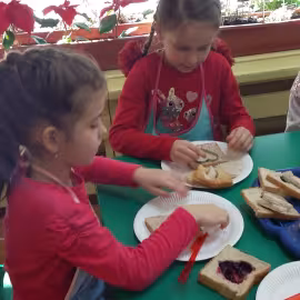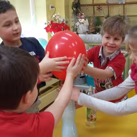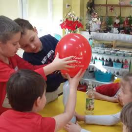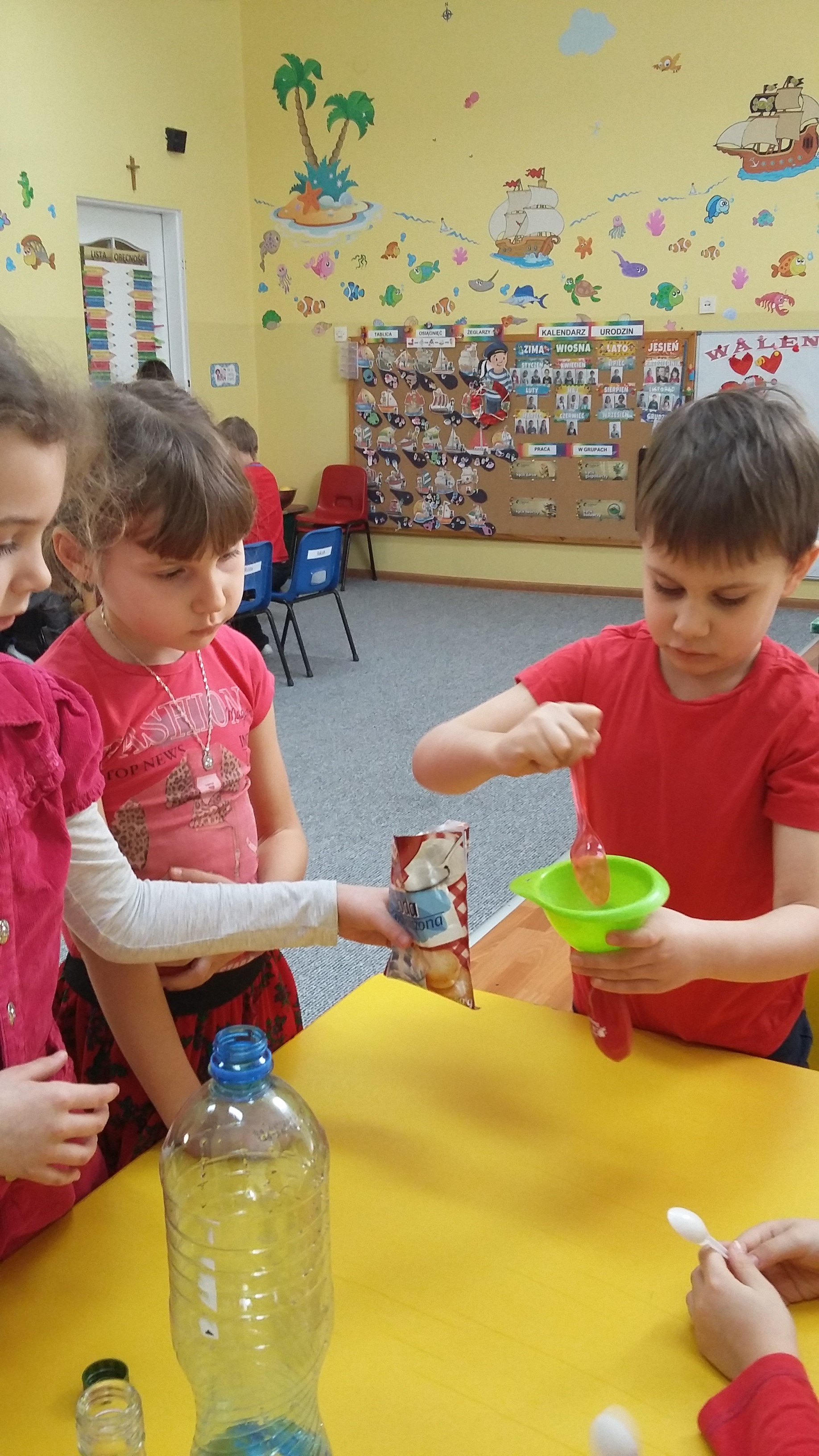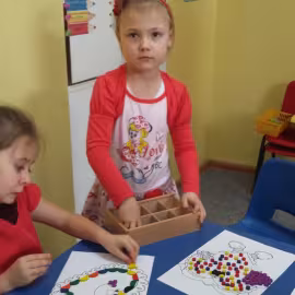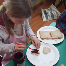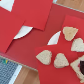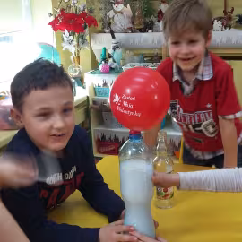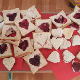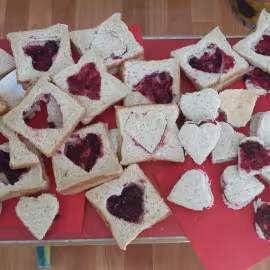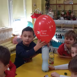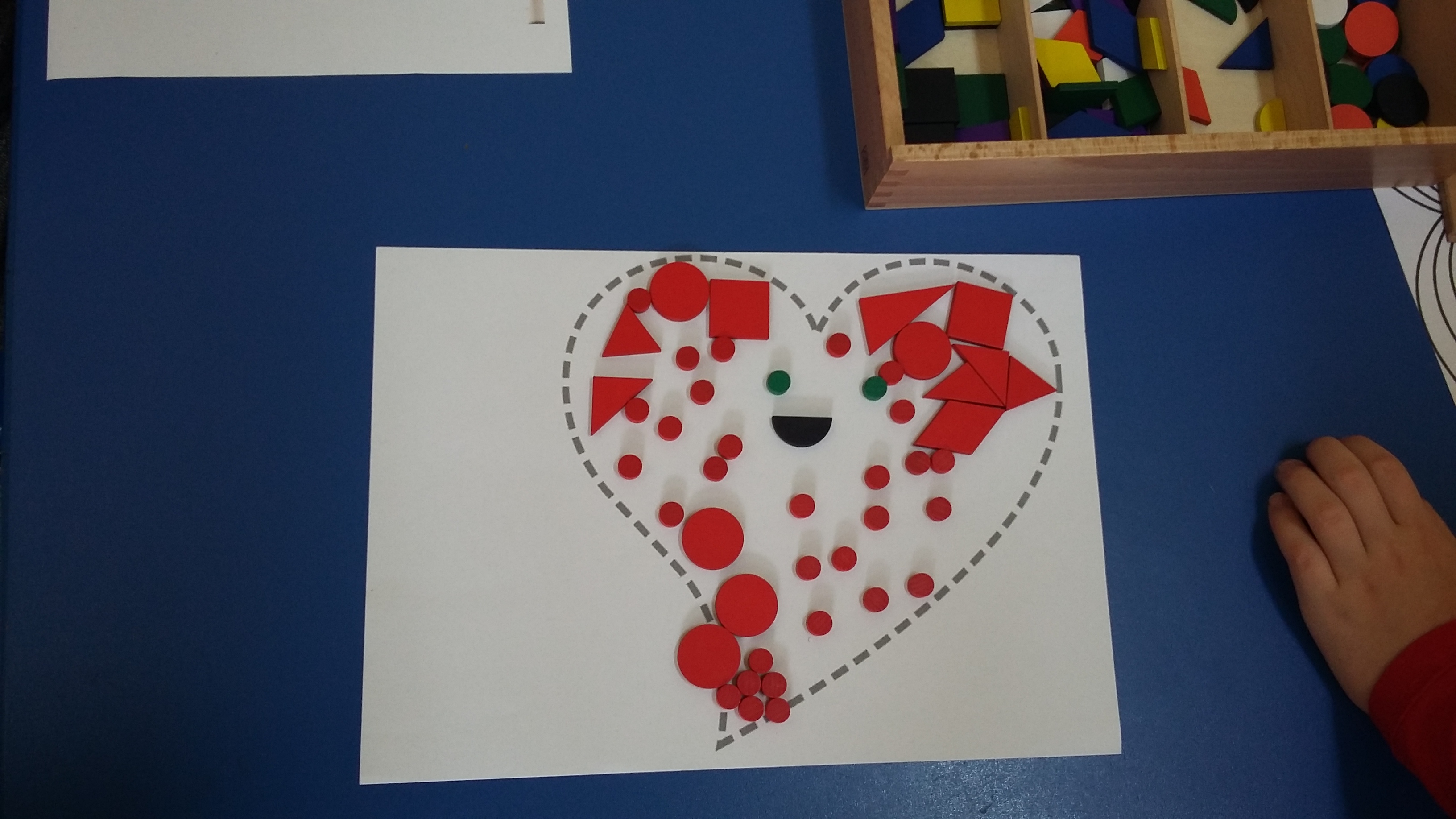 W tym dniu bawiliśmy się w kącikach froeblowskich. W kąciku darów przedszkolaki układały z darów sercowe kompozycje. W kąciku twórczym ozdabialiśmy wykonany wcześniej plakat z „Przepisem na miłość” sercowymi stemplami uformowanymi z rolek po papierze toaletowym. W kąciku badawczym pompowaliśmy walentynkowy balon w nietypowy sposób. Wykorzystaliśmy eksperyment z octem i sodą oczyszczoną i jak się okazało, udało się napompować ogromny balon. W kąciku gospodarczym przygotowaliśmy słodkie przekąski dla zakochanych z wykorzystaniem chleba tostowego, foremki w kształcie serca i marmolady wiśniowej. Powstały przepyszne kanapki o różnych kształtach.