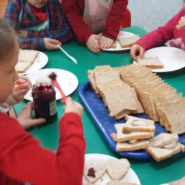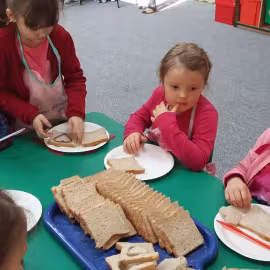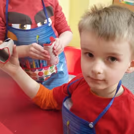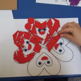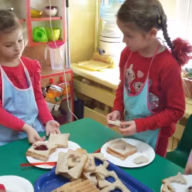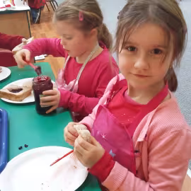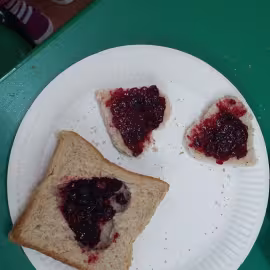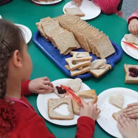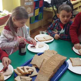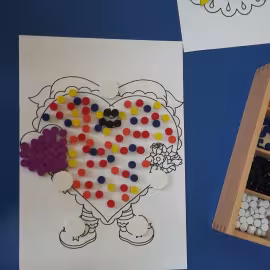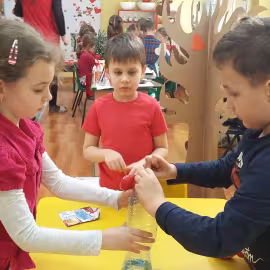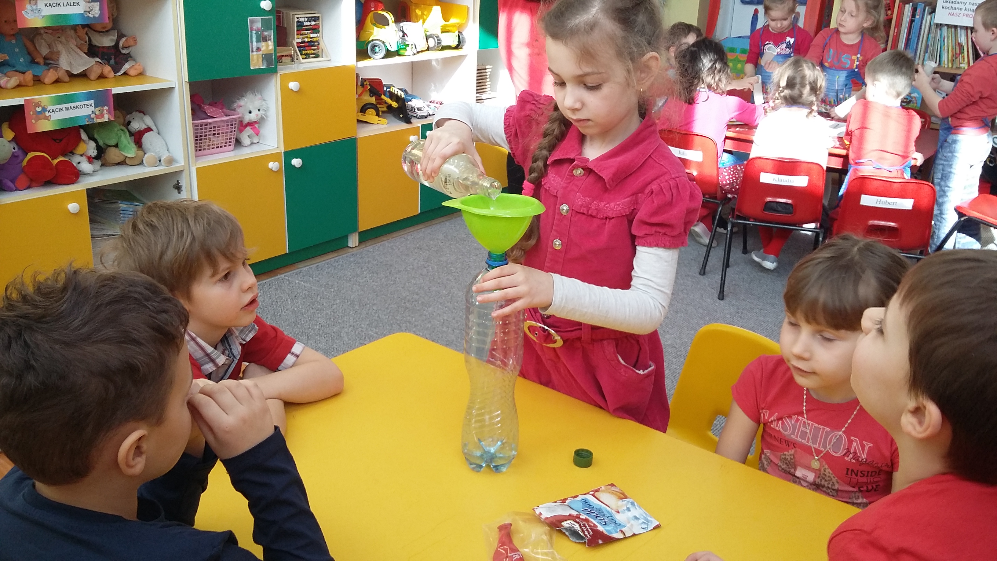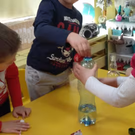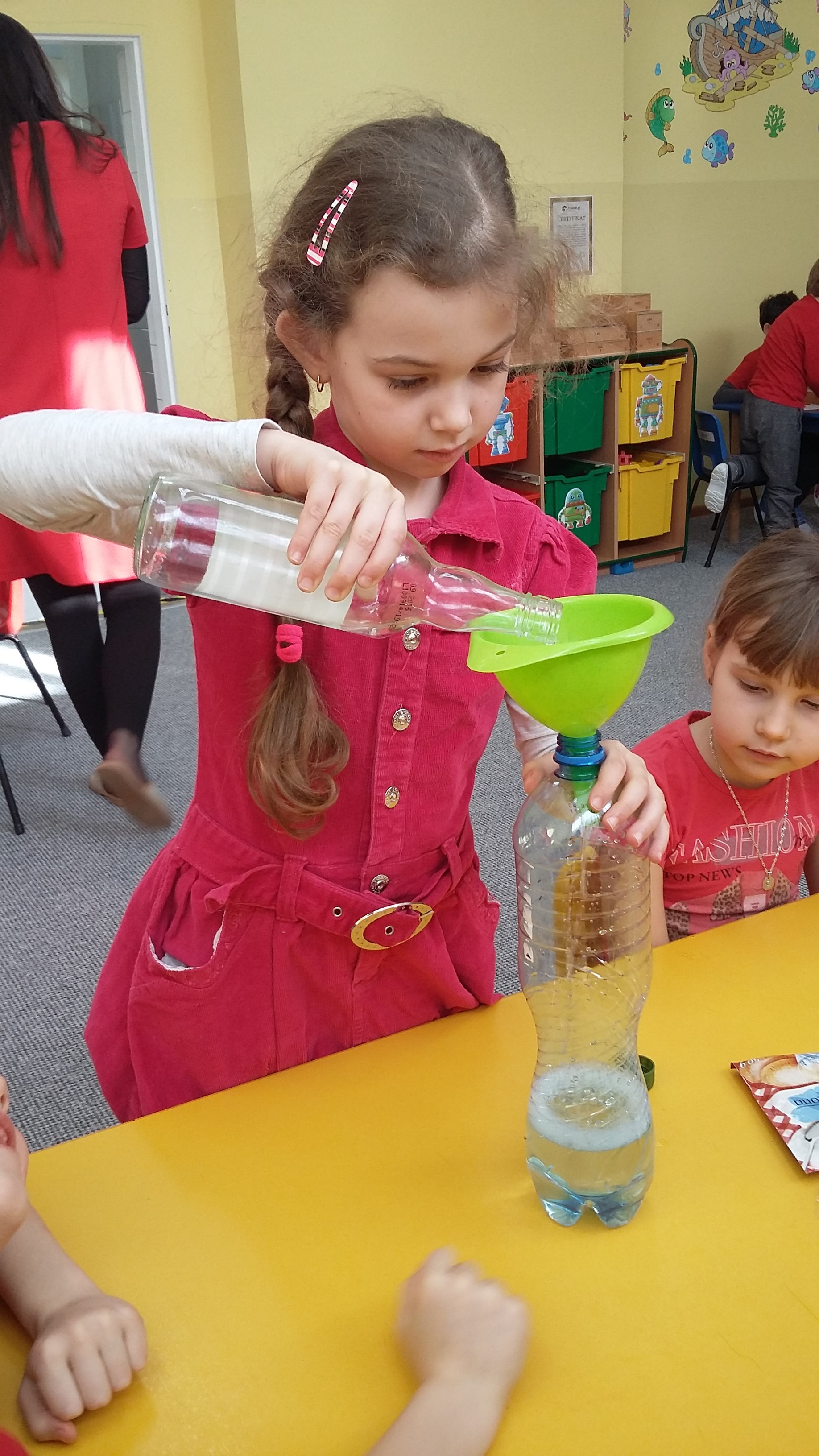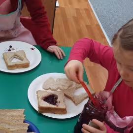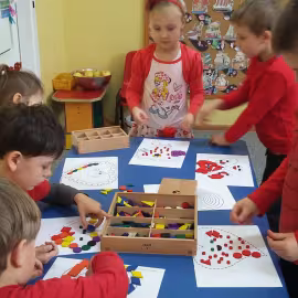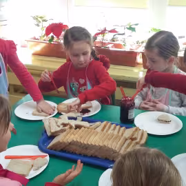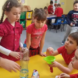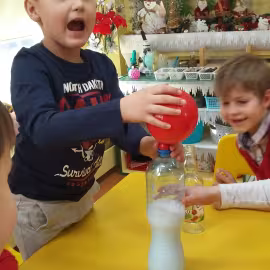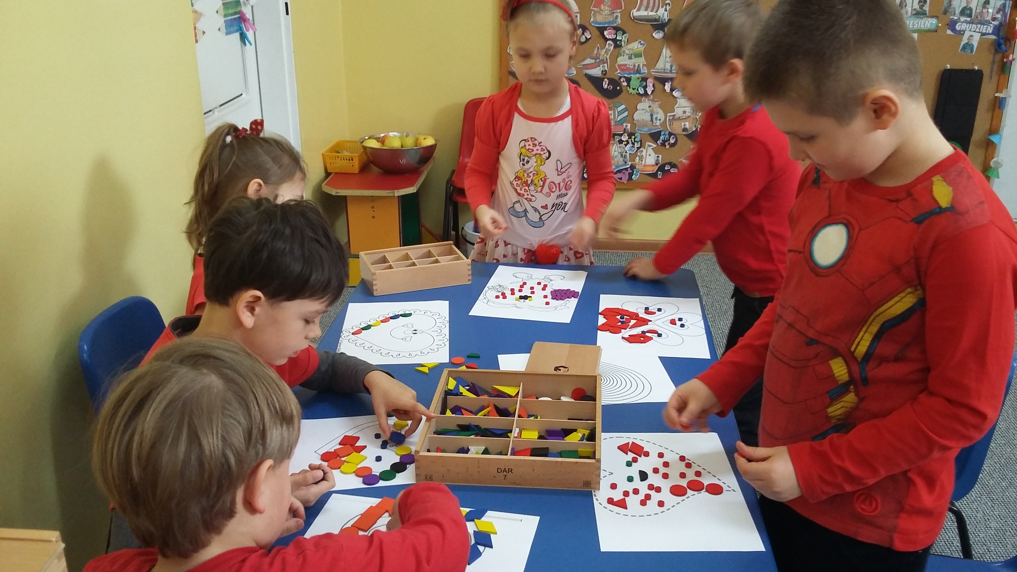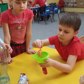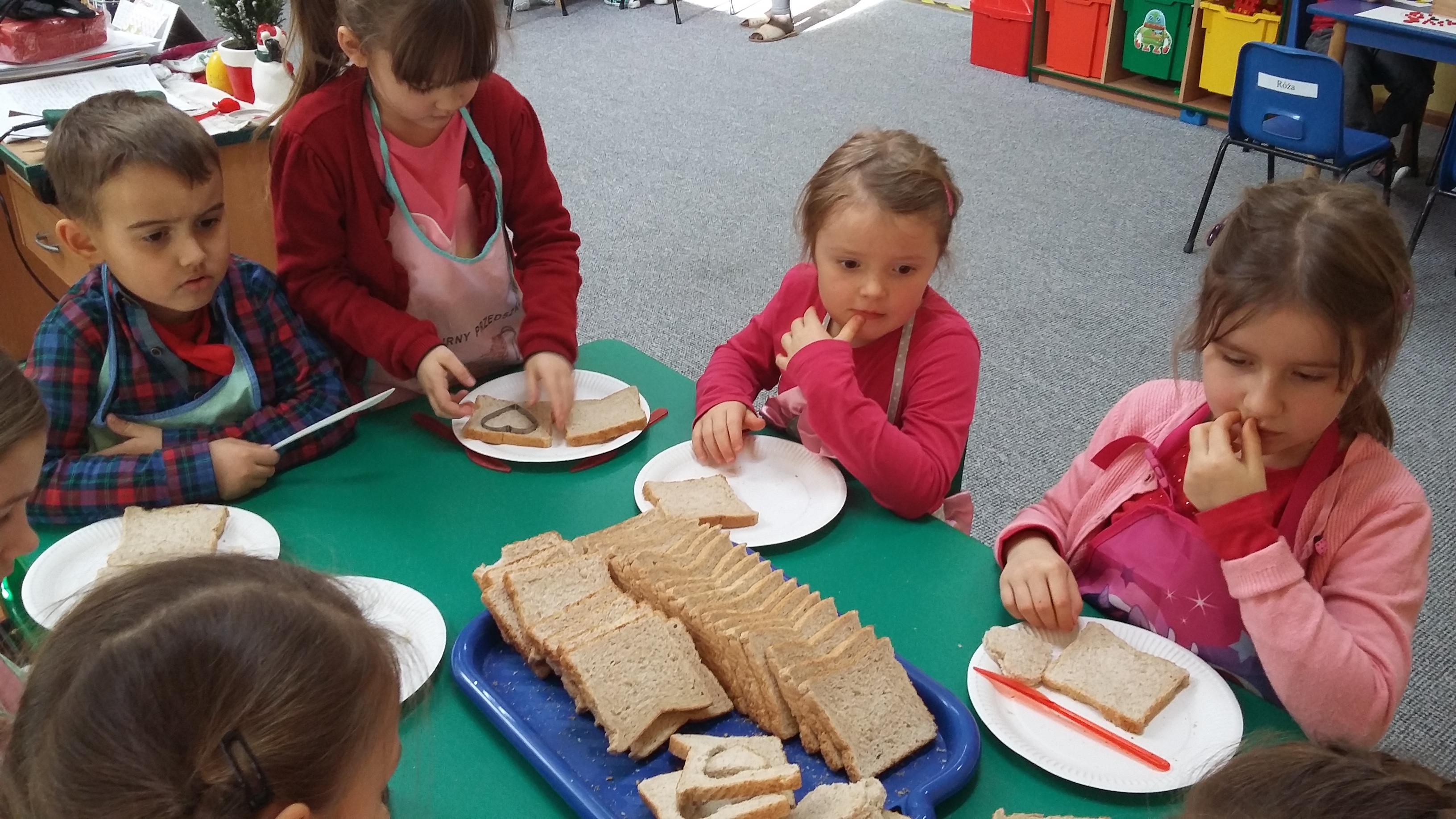 W tym dniu bawiliśmy się w kącikach froeblowskich. W kąciku darów przedszkolaki układały z darów sercowe kompozycje. W kąciku twórczym ozdabialiśmy wykonany wcześniej plakat z „Przepisem na miłość” sercowymi stemplami uformowanymi z rolek po papierze toaletowym. W kąciku badawczym pompowaliśmy walentynkowy balon w nietypowy sposób. Wykorzystaliśmy eksperyment z octem i sodą oczyszczoną i jak się okazało, udało się napompować ogromny balon. W kąciku gospodarczym przygotowaliśmy słodkie przekąski dla zakochanych z wykorzystaniem chleba tostowego, foremki w kształcie serca i marmolady wiśniowej. Powstały przepyszne kanapki o różnych kształtach.