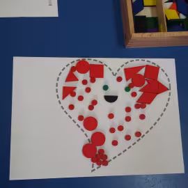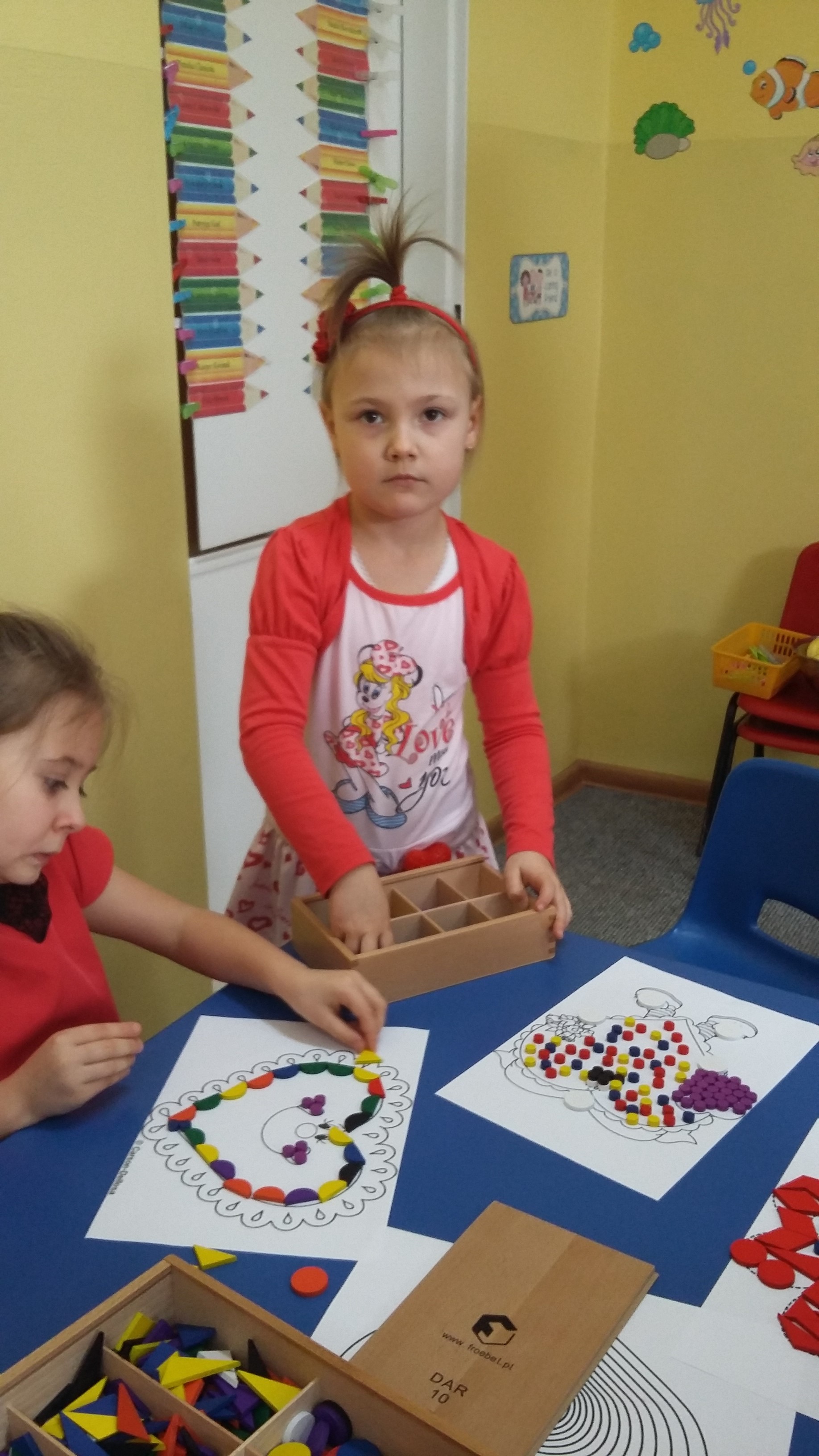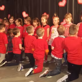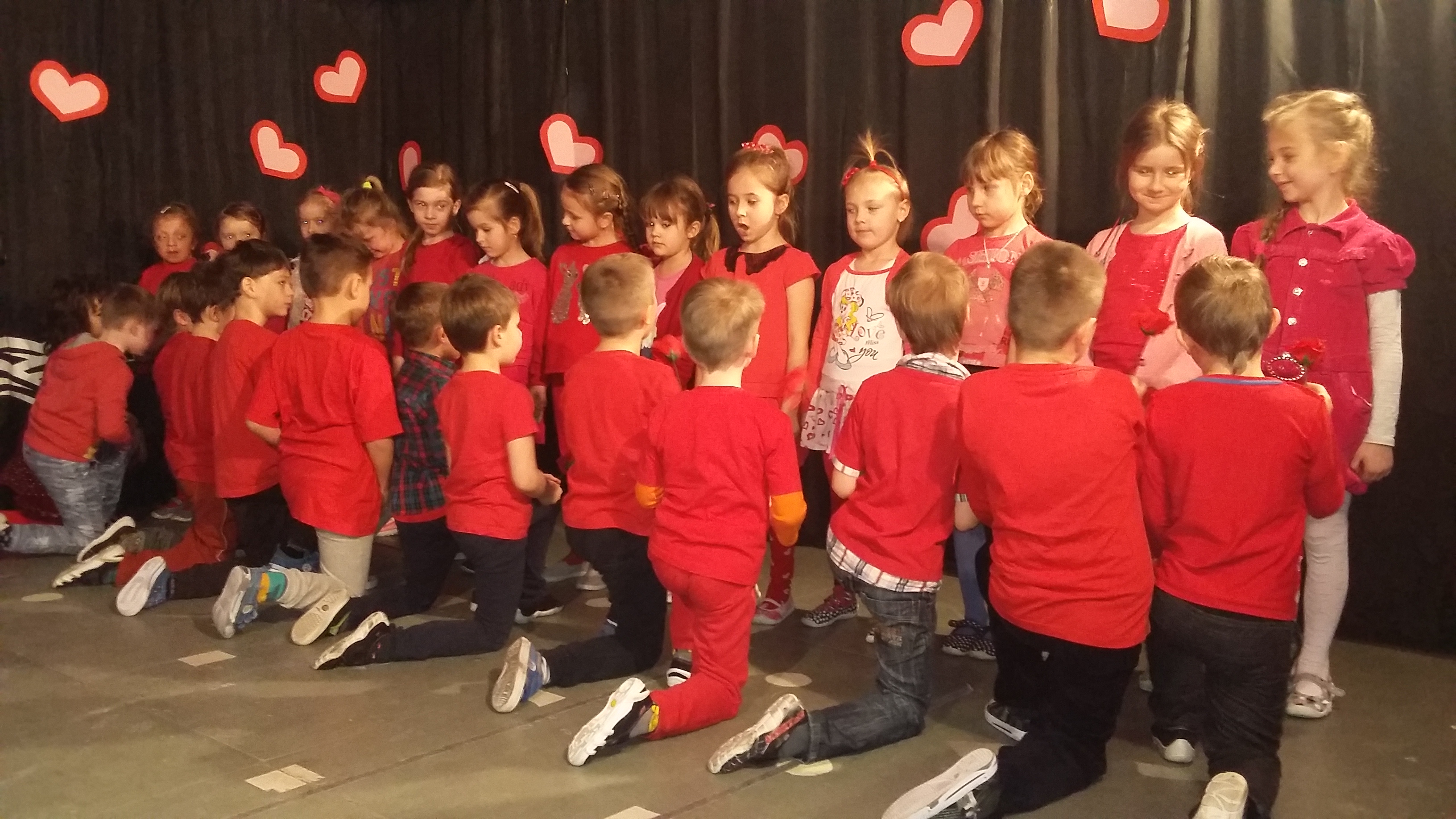 Później braliśmy udział w uroczystości walentynkowej na naszej scenie. Starszaki zaprezentowały układ taneczny „Tango zakochanych” z różą w zębach. Wykonaliśmy również drzewko miłości z tektury, na którym umieściliśmy sentencje miłosne znanych poetów. Na koniec walentynkowych obchodów wykonaliśmy przeplatanki froeblowskie w kształcie serca.