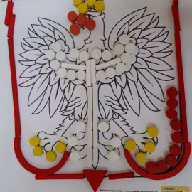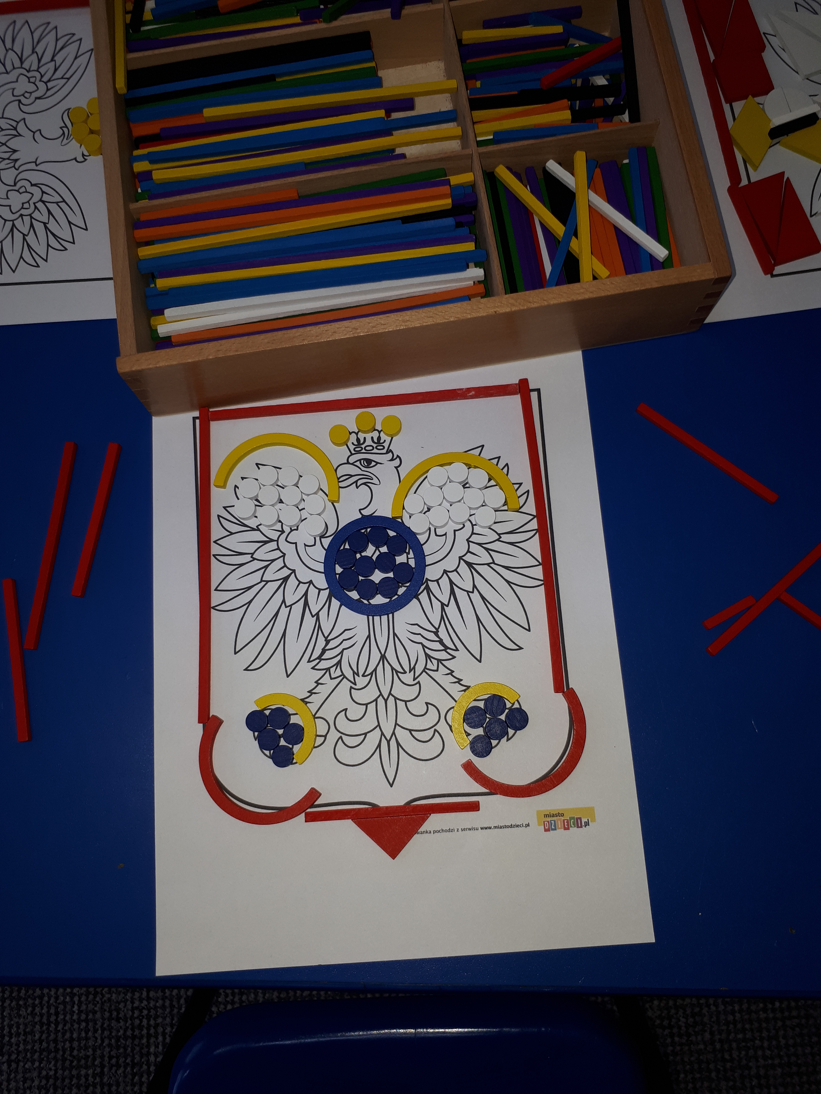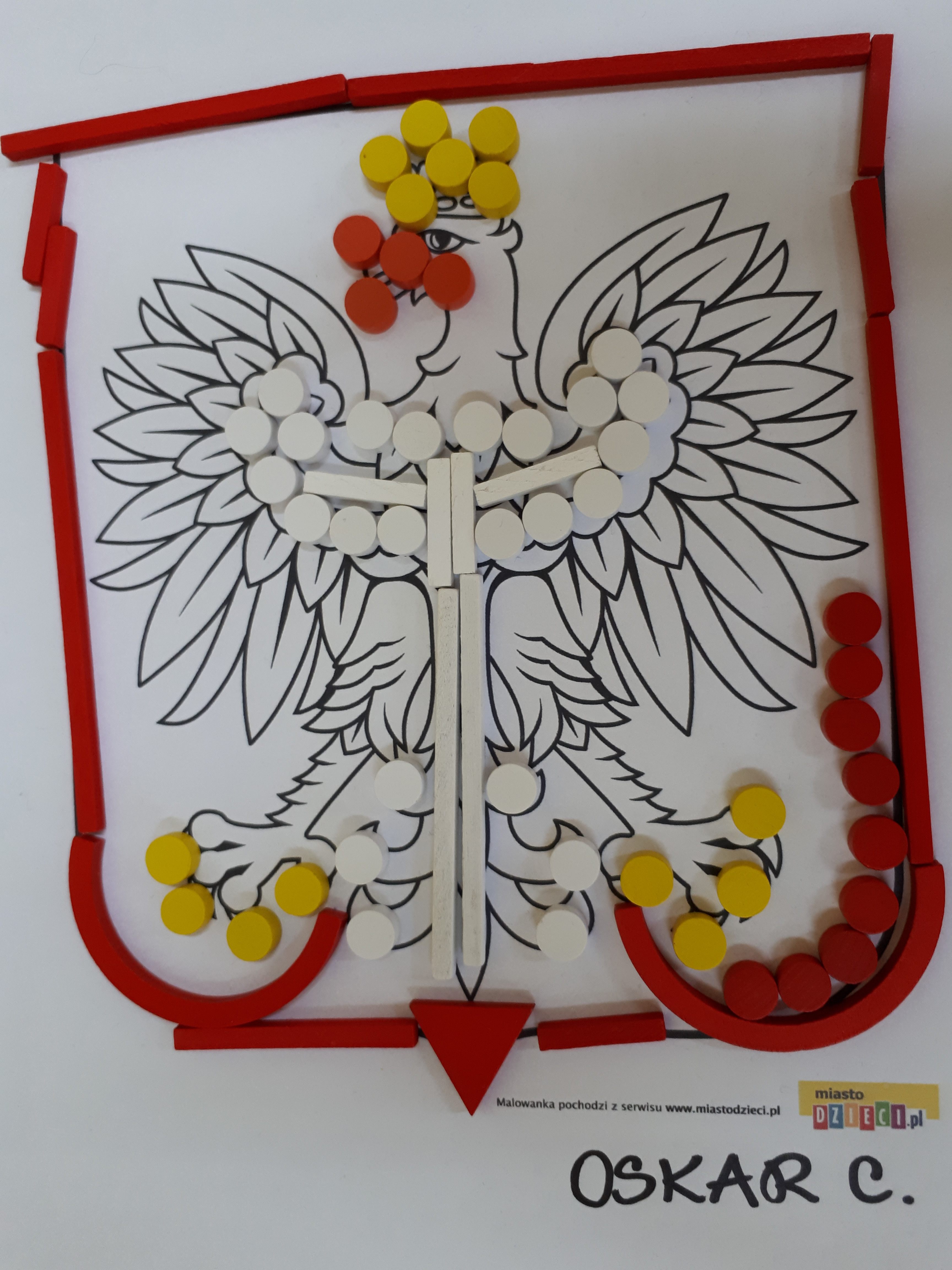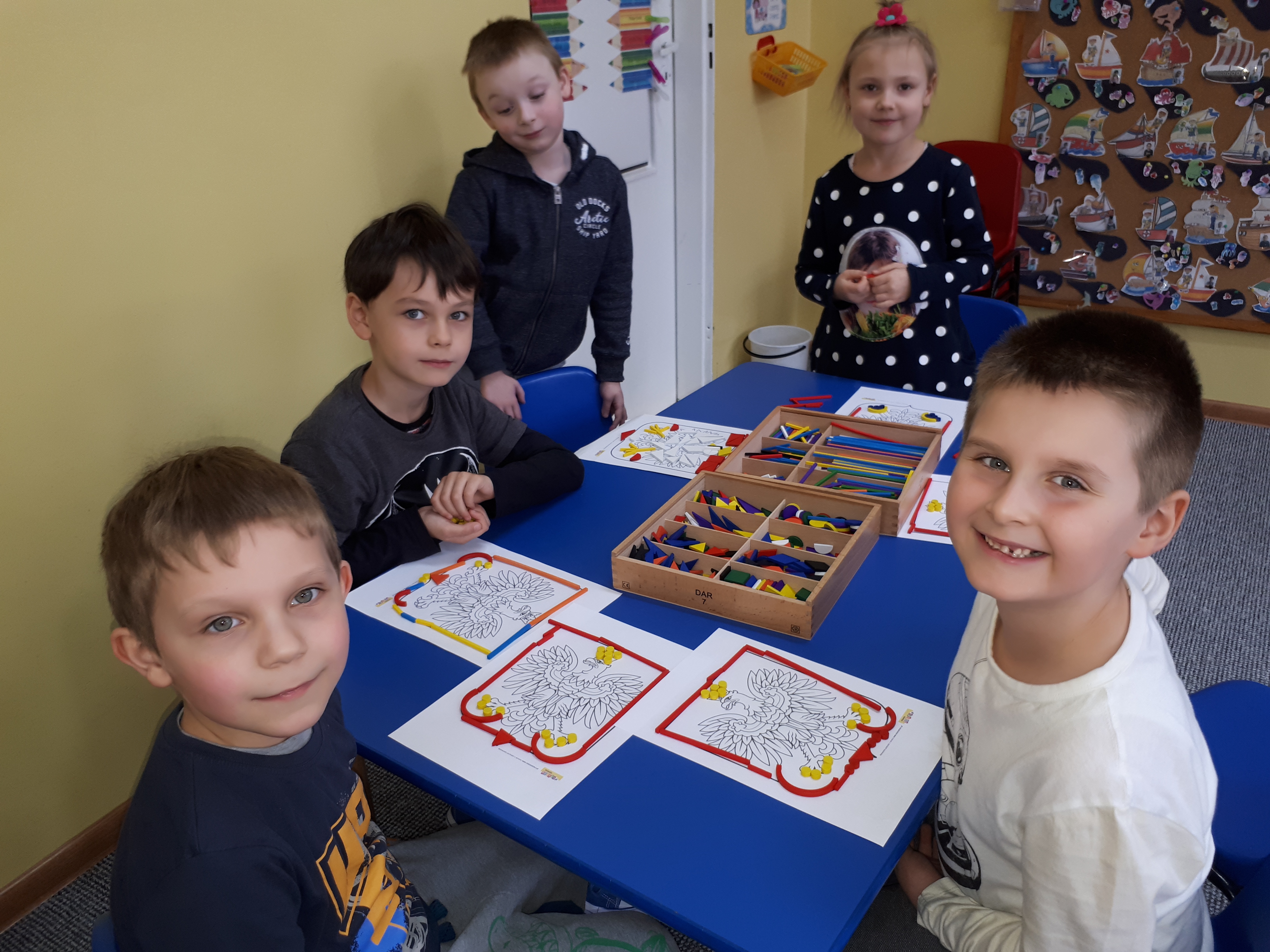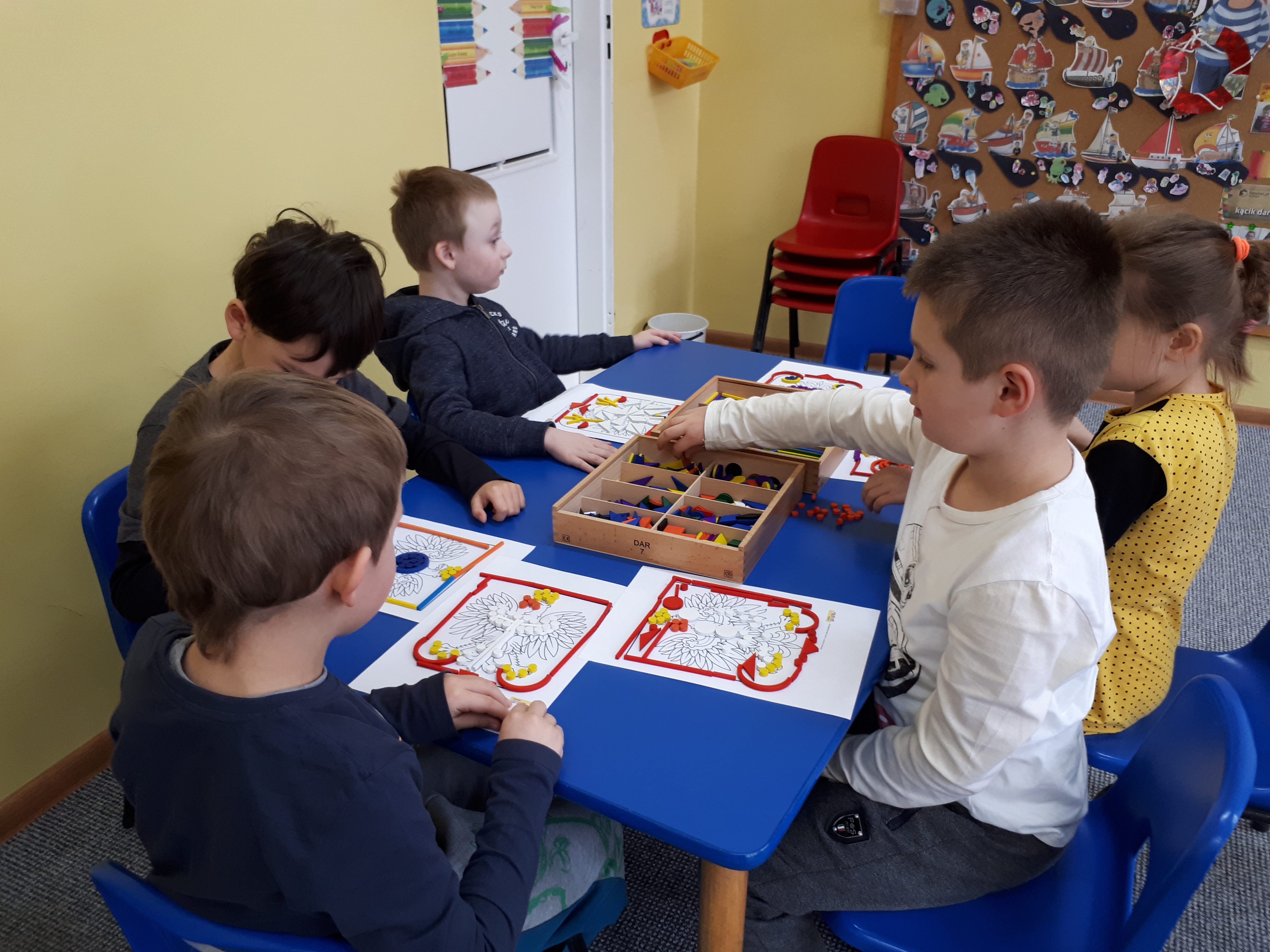 W ramach cyklu zajęć „Podróże po Polsce” dzieci przypomniały sobie wiadomości nt. tego jakie są symbole polskie oraz położenie ważnych punktów na mapie takich jak: Wisła, Morze Bałtyckie, góry. Starszaki kształtowaływ sobie tożsamość narodową poprzez zabawy i różne działania plastyczne. Dzieci utrwalały pojęcia i symbole, które powinny być bliskie zarówno małemu jak i dorosłemu Polakowi. Przedszkolaki zapoznały się z symbolami Polski, wiedzą, że stolicą Polski jest Warszawa i najdłuższą rzeką Wisła. Nasi mali Polacy wiedzą również, jak zachować się podczas słuchania hymnu narodowego. A uwieńczeniem narodowego tygodnia była praca w kącikach zabawowo- zadaniowych. W kąciku darów dzieci układały godło. W kąciku twórczym malowały mapę Polski na folii z użyciem mydlanych farb. W kąciku badawczym przedszkolaki barwiły ryż na czerwono przy pomocy bibuły, a później wykonywały barwy narodowe w butelce doskonaląc technikę przesypywania ryżu. W kąciku gospodarczym wykonywały flagę z chleba tostowego, serka twarogowego, sera feta, żurawiny, dżemu malinowego i słonego paluszka. Prace wyszły przepięknie, a po skończonej prezentacji i zjedzeniu przepysznych flag starszaki posprzątały swoje miejsca pracy.