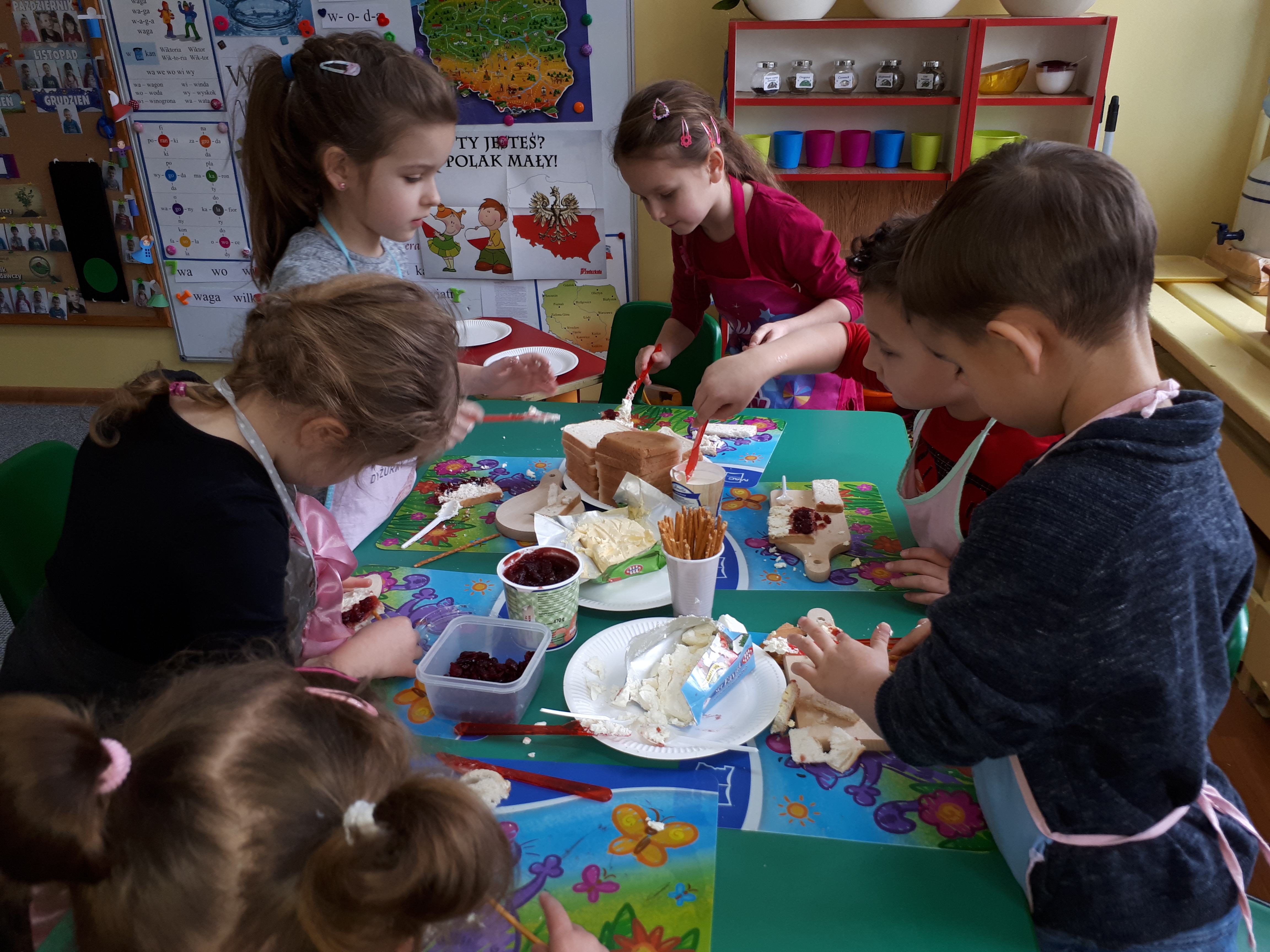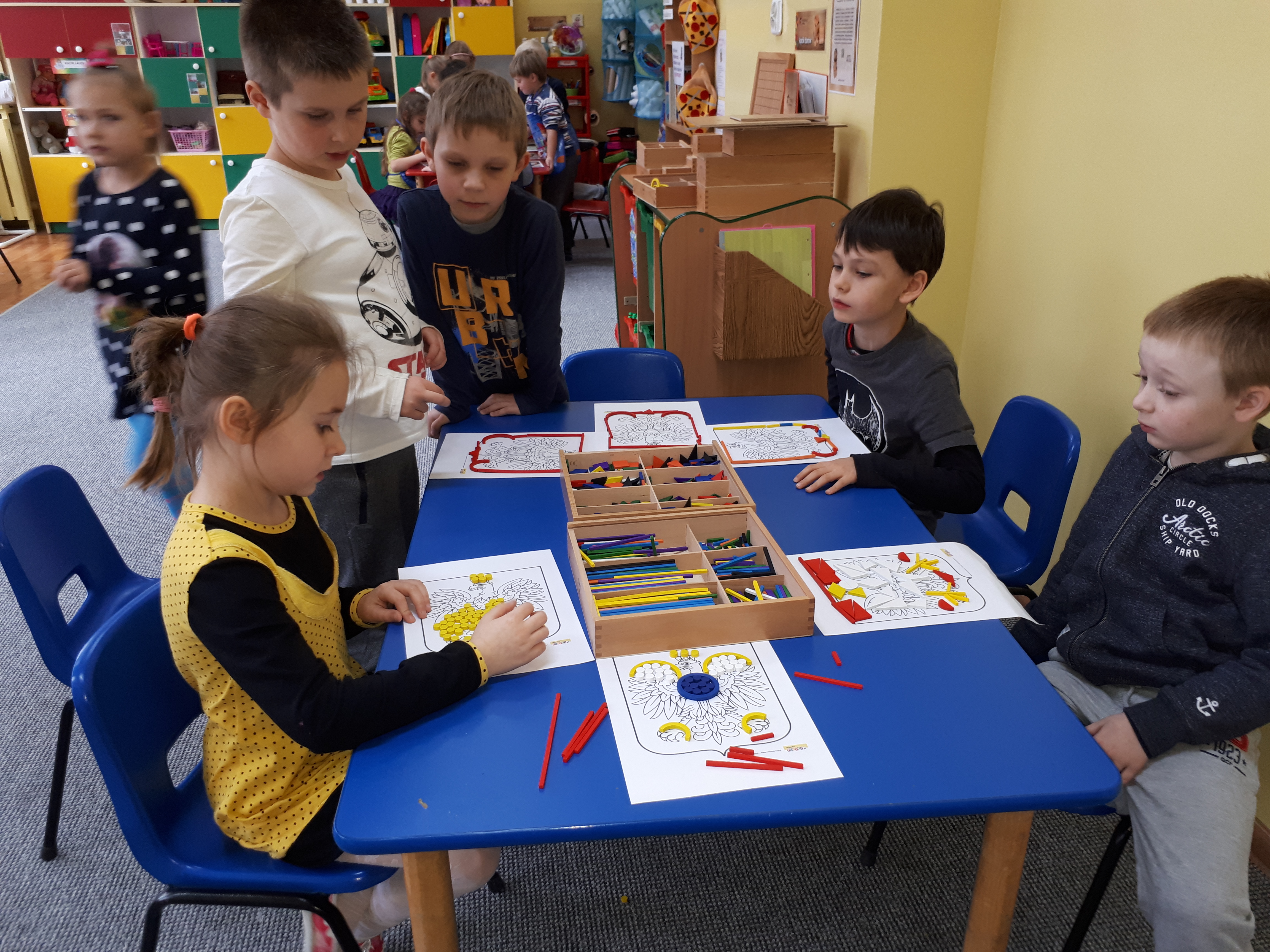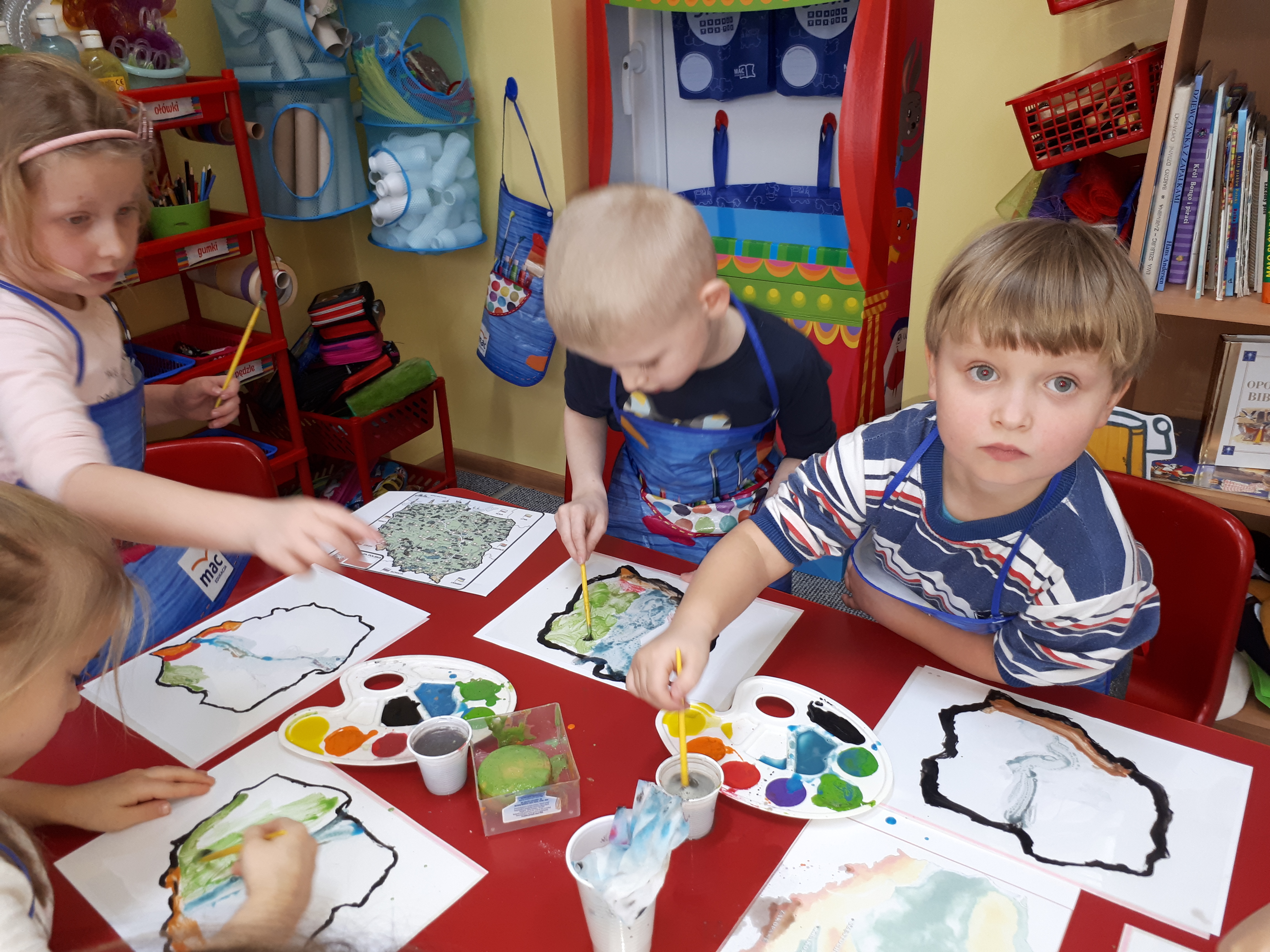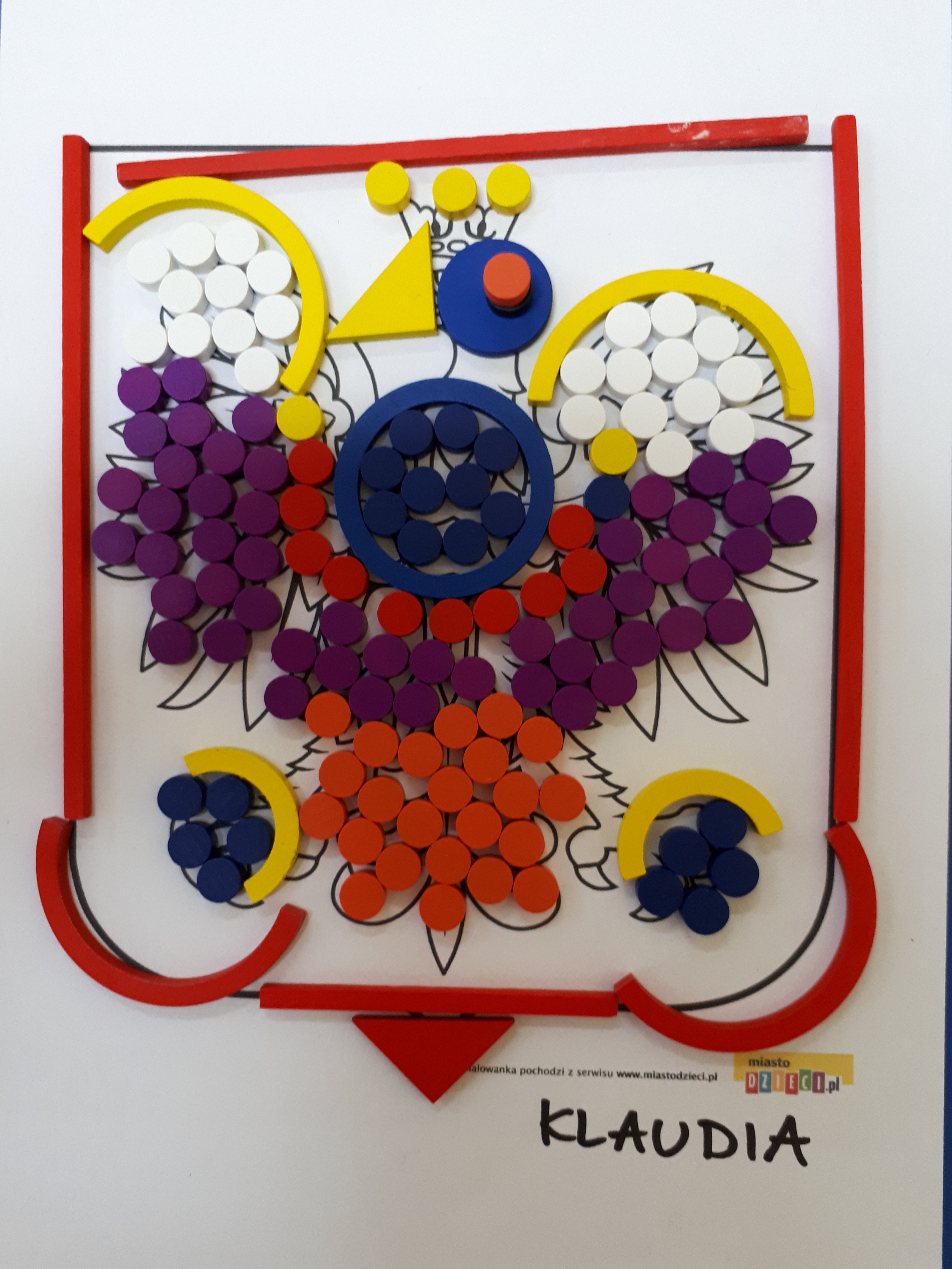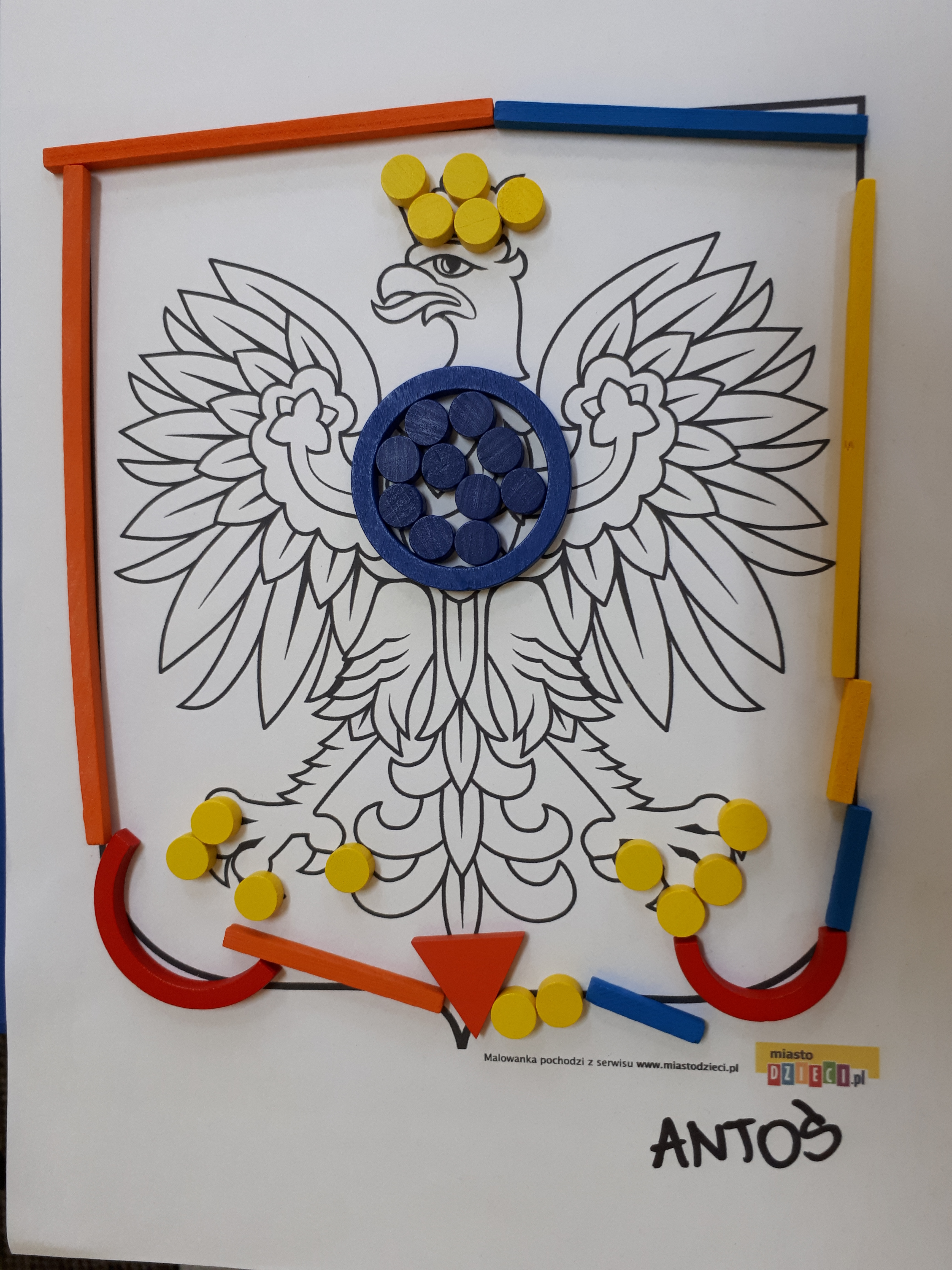 W ramach cyklu zajęć „Podróże po Polsce” dzieci przypomniały sobie wiadomości nt. tego jakie są symbole polskie oraz położenie ważnych punktów na mapie takich jak: Wisła, Morze Bałtyckie, góry. Starszaki kształtowaływ sobie tożsamość narodową poprzez zabawy i różne działania plastyczne. Dzieci utrwalały pojęcia i symbole, które powinny być bliskie zarówno małemu jak i dorosłemu Polakowi. Przedszkolaki zapoznały się z symbolami Polski, wiedzą, że stolicą Polski jest Warszawa i najdłuższą rzeką Wisła. Nasi mali Polacy wiedzą również, jak zachować się podczas słuchania hymnu narodowego. A uwieńczeniem narodowego tygodnia była praca w kącikach zabawowo- zadaniowych. W kąciku darów dzieci układały godło. W kąciku twórczym malowały mapę Polski na folii z użyciem mydlanych farb. W kąciku badawczym przedszkolaki barwiły ryż na czerwono przy pomocy bibuły, a później wykonywały barwy narodowe w butelce doskonaląc technikę przesypywania ryżu. W kąciku gospodarczym wykonywały flagę z chleba tostowego, serka twarogowego, sera feta, żurawiny, dżemu malinowego i słonego paluszka. Prace wyszły przepięknie, a po skończonej prezentacji i zjedzeniu przepysznych flag starszaki posprzątały swoje miejsca pracy.