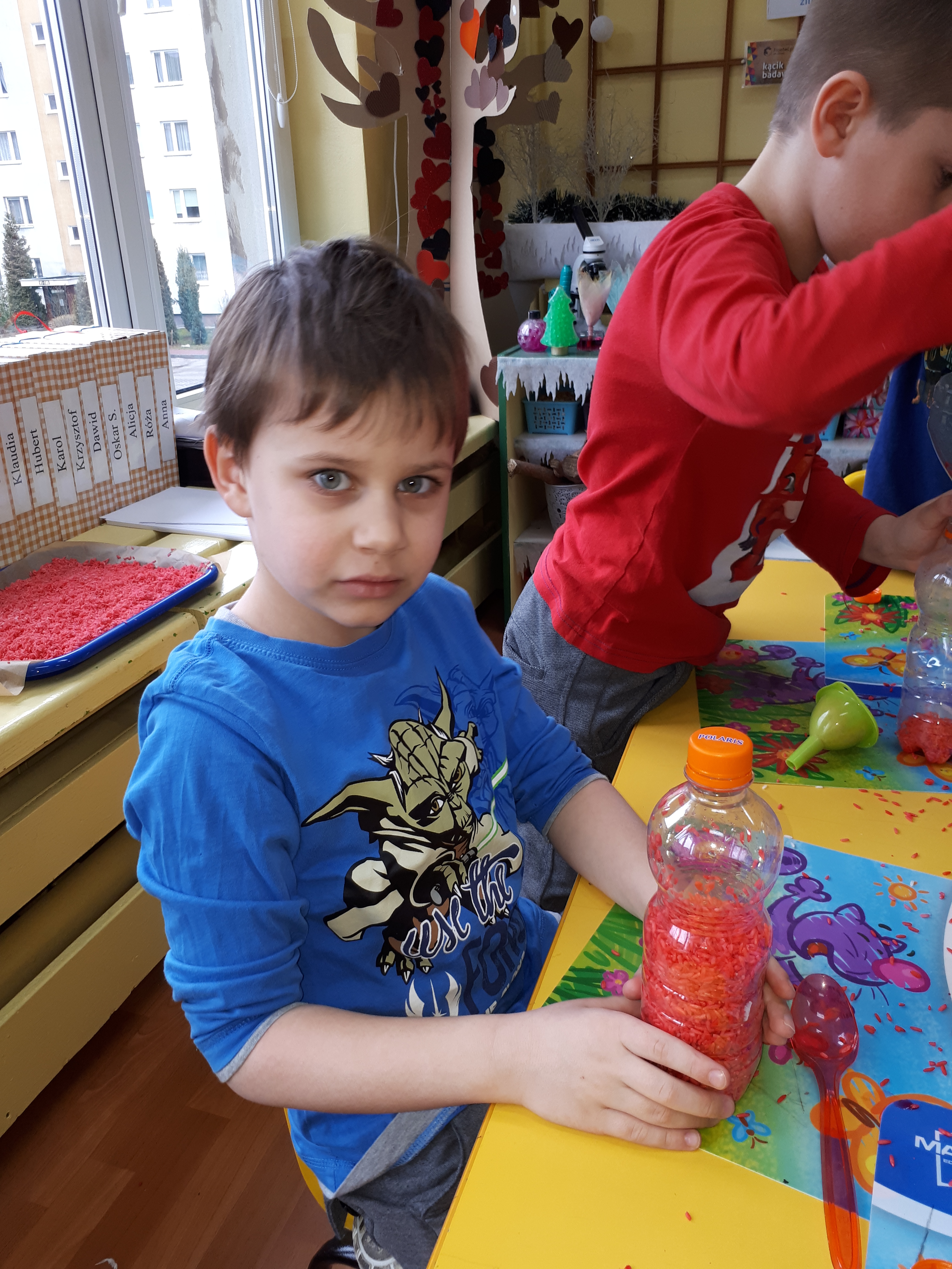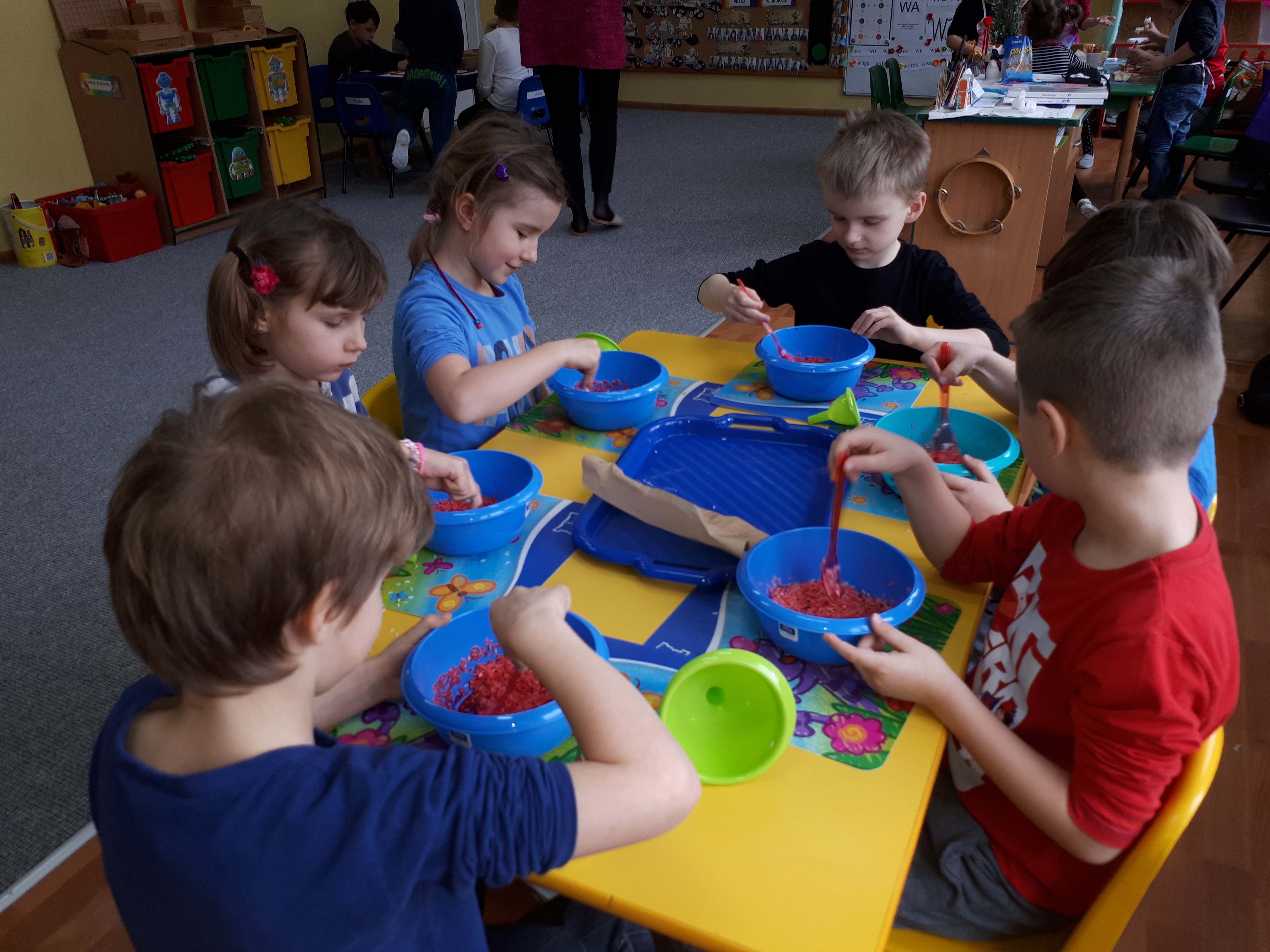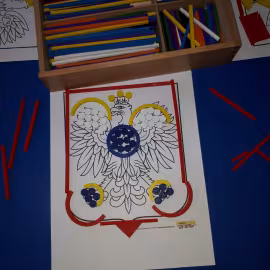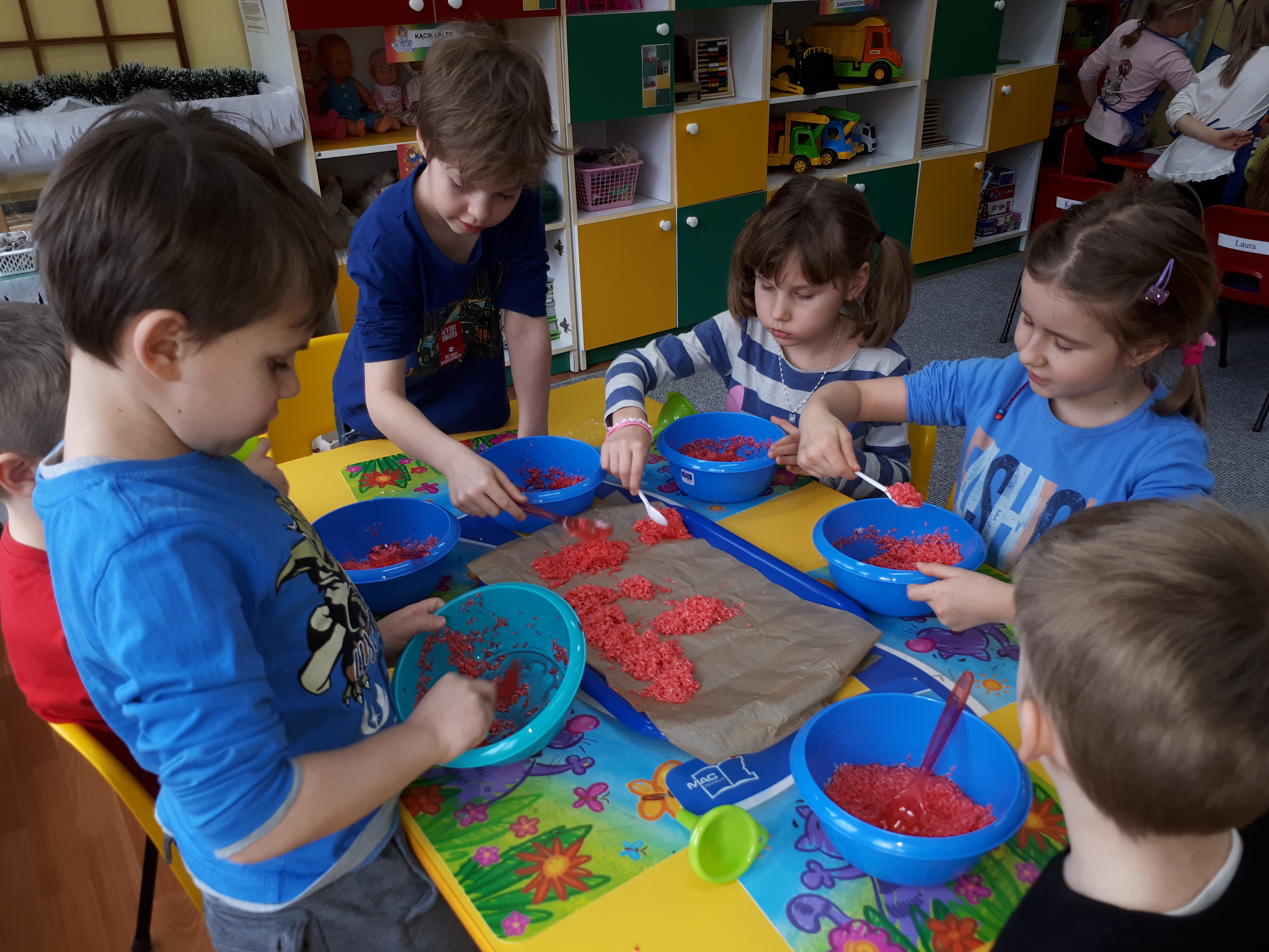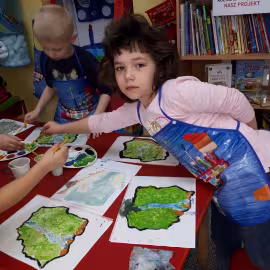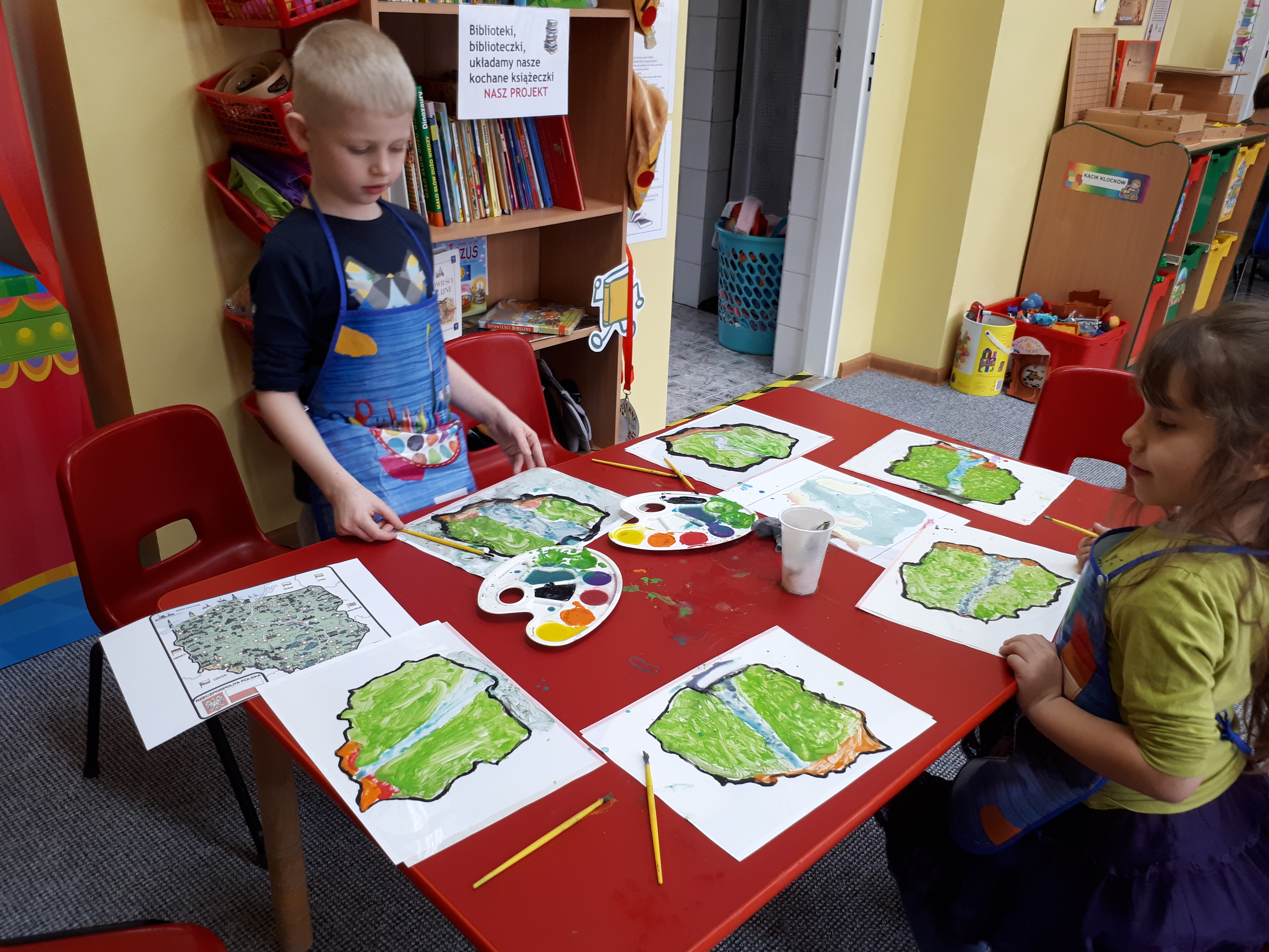 W ramach cyklu zajęć „Podróże po Polsce” dzieci przypomniały sobie wiadomości nt. tego jakie są symbole polskie oraz położenie ważnych punktów na mapie takich jak: Wisła, Morze Bałtyckie, góry. Starszaki kształtowaływ sobie tożsamość narodową poprzez zabawy i różne działania plastyczne. Dzieci utrwalały pojęcia i symbole, które powinny być bliskie zarówno małemu jak i dorosłemu Polakowi. Przedszkolaki zapoznały się z symbolami Polski, wiedzą, że stolicą Polski jest Warszawa i najdłuższą rzeką Wisła. Nasi mali Polacy wiedzą również, jak zachować się podczas słuchania hymnu narodowego. A uwieńczeniem narodowego tygodnia była praca w kącikach zabawowo- zadaniowych. W kąciku darów dzieci układały godło. W kąciku twórczym malowały mapę Polski na folii z użyciem mydlanych farb. W kąciku badawczym przedszkolaki barwiły ryż na czerwono przy pomocy bibuły, a później wykonywały barwy narodowe w butelce doskonaląc technikę przesypywania ryżu. W kąciku gospodarczym wykonywały flagę z chleba tostowego, serka twarogowego, sera feta, żurawiny, dżemu malinowego i słonego paluszka. Prace wyszły przepięknie, a po skończonej prezentacji i zjedzeniu przepysznych flag starszaki posprzątały swoje miejsca pracy.