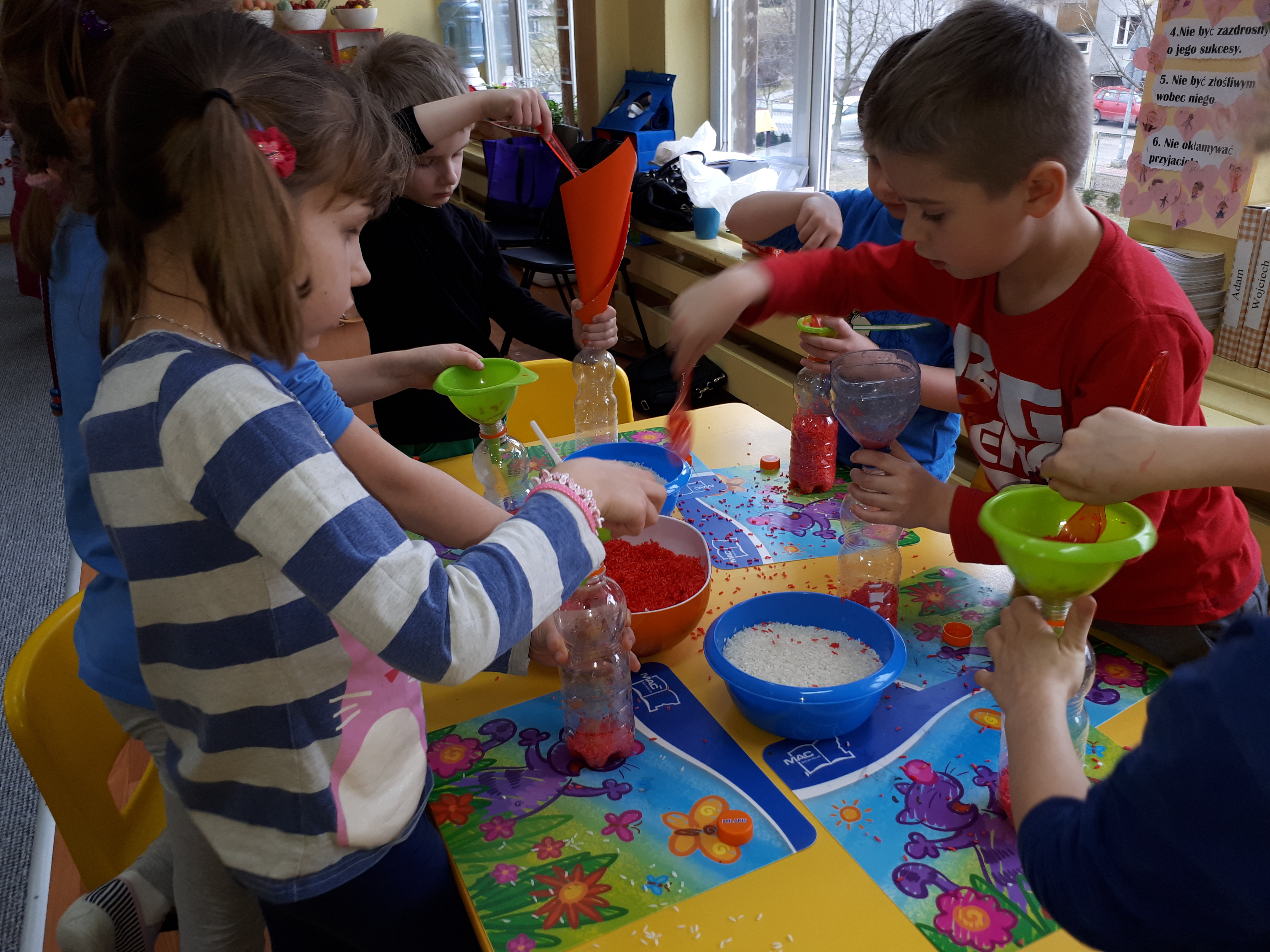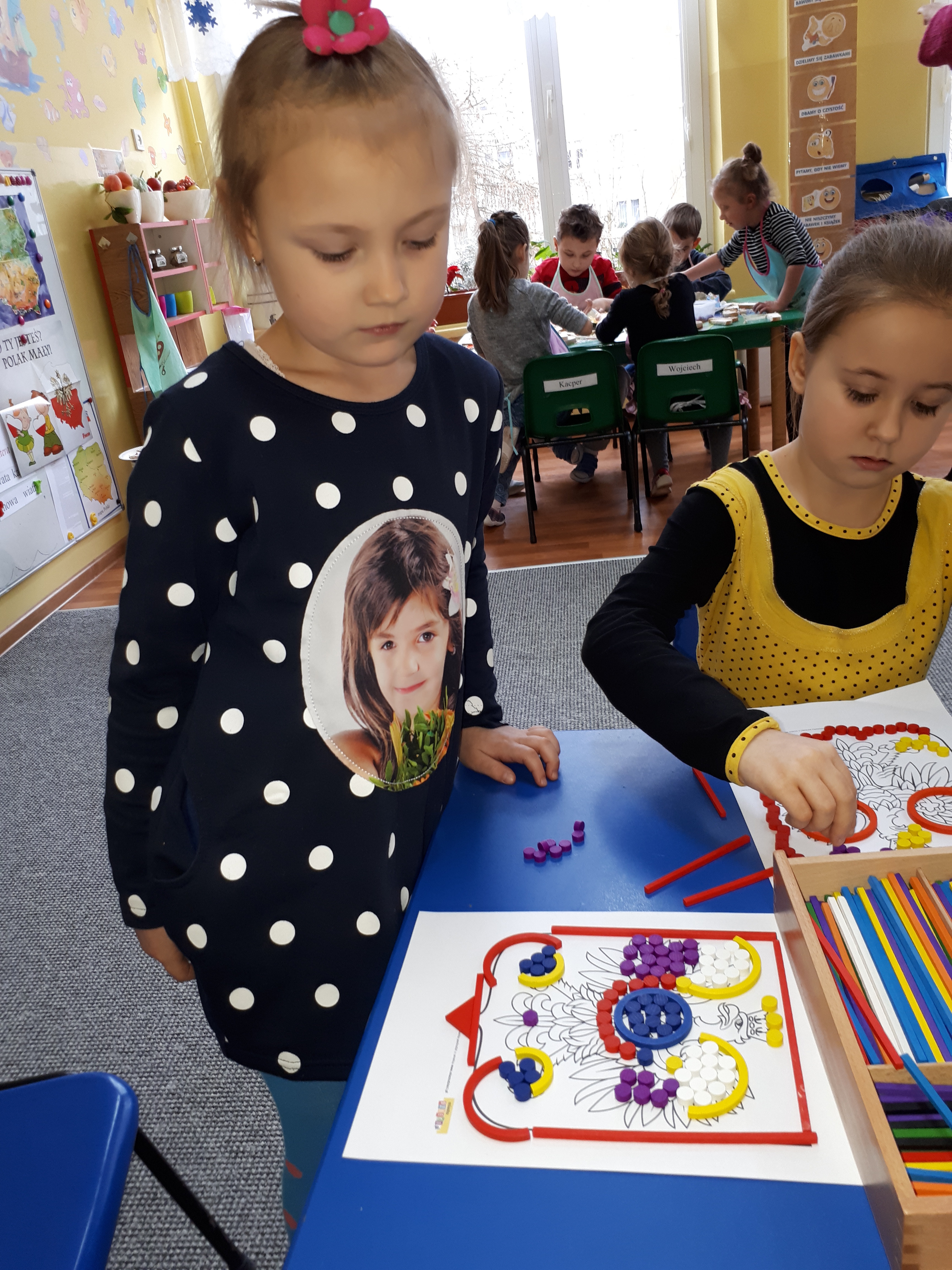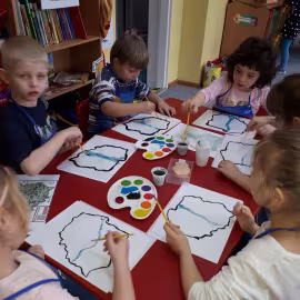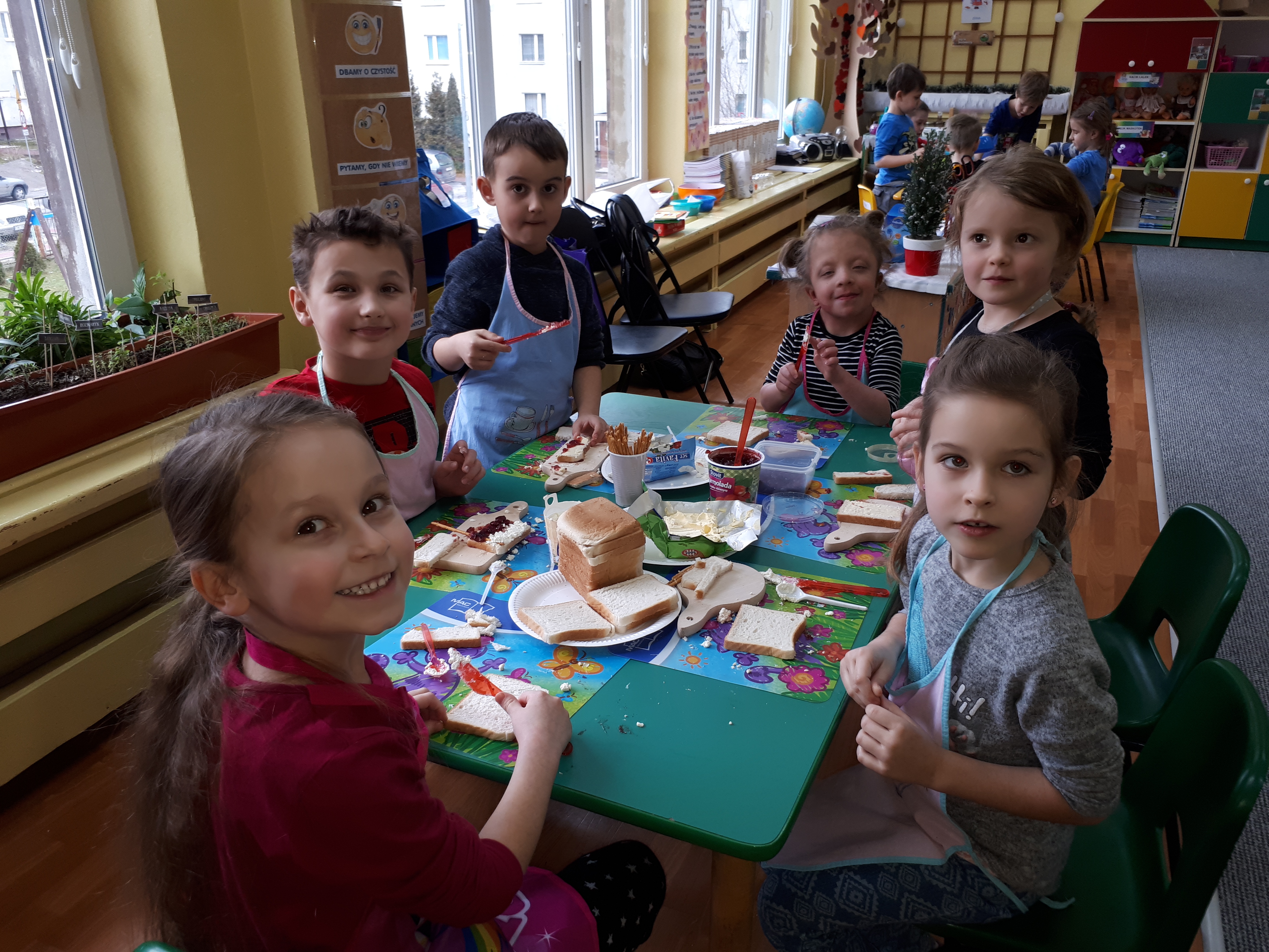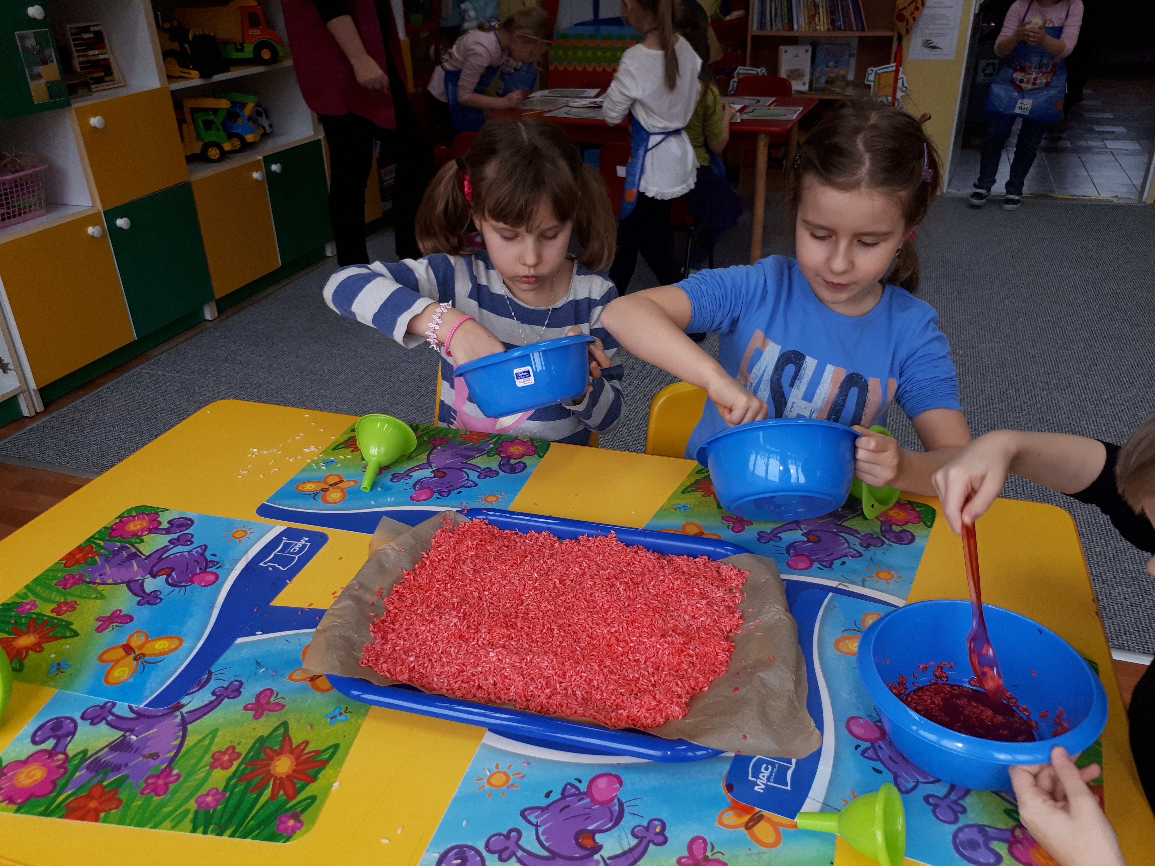 W ramach cyklu zajęć „Podróże po Polsce” dzieci przypomniały sobie wiadomości nt. tego jakie są symbole polskie oraz położenie ważnych punktów na mapie takich jak: Wisła, Morze Bałtyckie, góry. Starszaki kształtowaływ sobie tożsamość narodową poprzez zabawy i różne działania plastyczne. Dzieci utrwalały pojęcia i symbole, które powinny być bliskie zarówno małemu jak i dorosłemu Polakowi. Przedszkolaki zapoznały się z symbolami Polski, wiedzą, że stolicą Polski jest Warszawa i najdłuższą rzeką Wisła. Nasi mali Polacy wiedzą również, jak zachować się podczas słuchania hymnu narodowego. A uwieńczeniem narodowego tygodnia była praca w kącikach zabawowo- zadaniowych. W kąciku darów dzieci układały godło. W kąciku twórczym malowały mapę Polski na folii z użyciem mydlanych farb. W kąciku badawczym przedszkolaki barwiły ryż na czerwono przy pomocy bibuły, a później wykonywały barwy narodowe w butelce doskonaląc technikę przesypywania ryżu. W kąciku gospodarczym wykonywały flagę z chleba tostowego, serka twarogowego, sera feta, żurawiny, dżemu malinowego i słonego paluszka. Prace wyszły przepięknie, a po skończonej prezentacji i zjedzeniu przepysznych flag starszaki posprzątały swoje miejsca pracy.