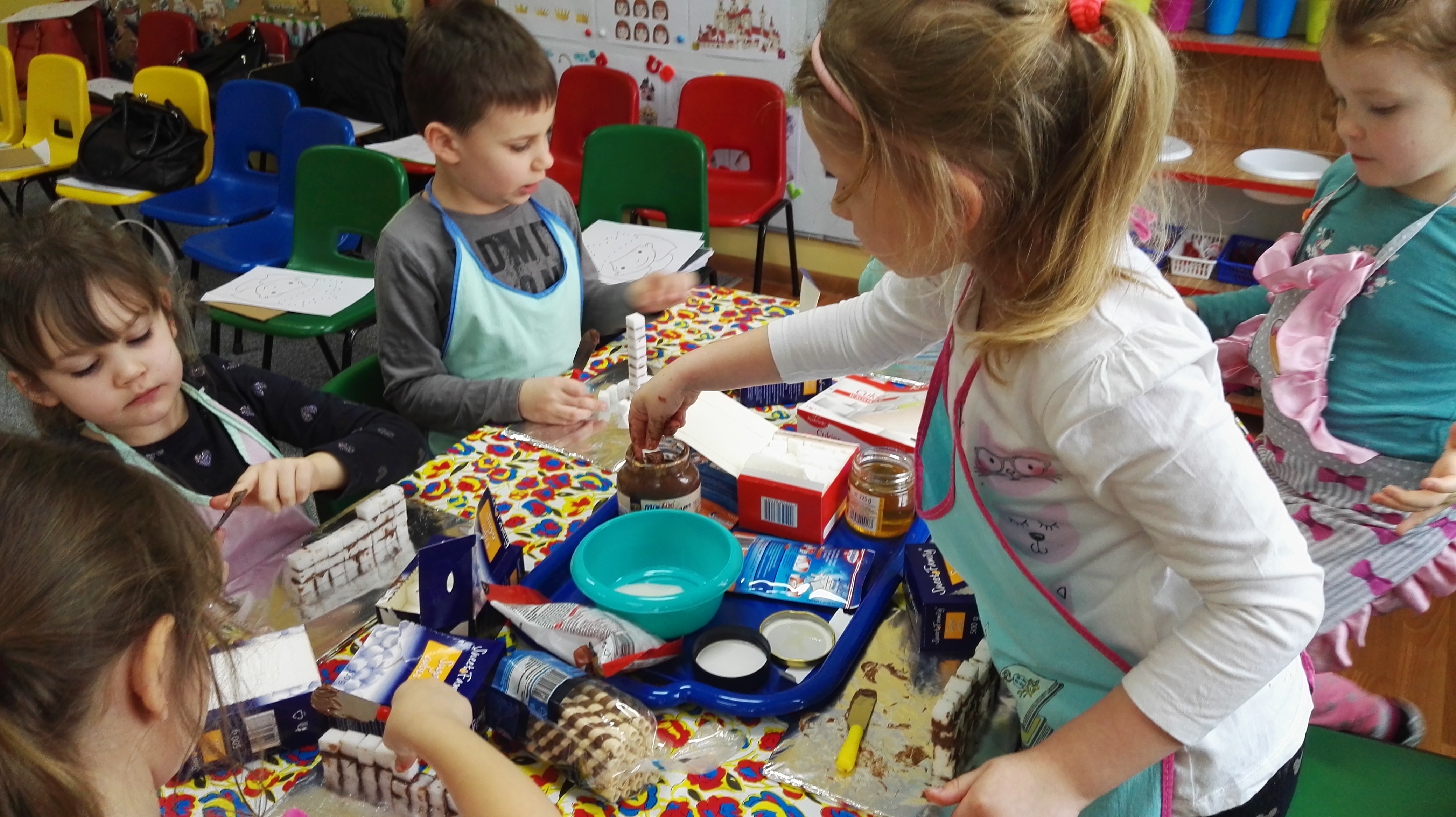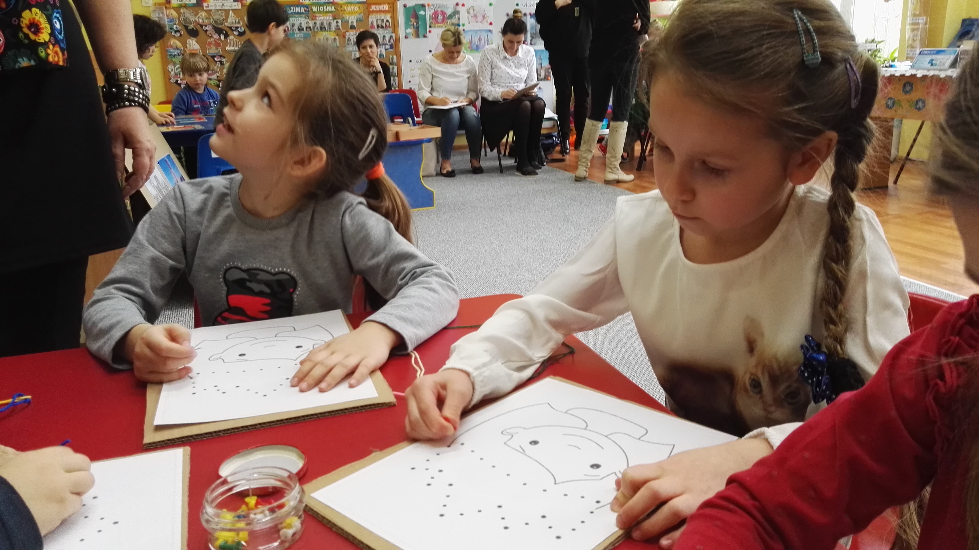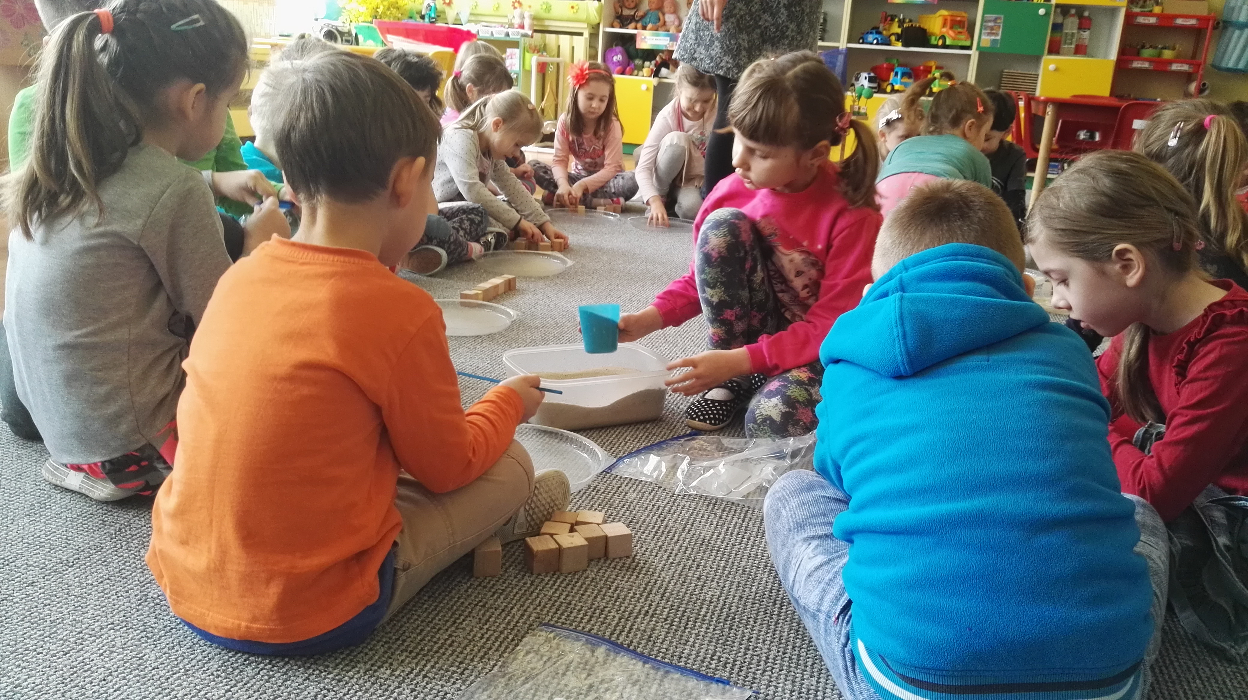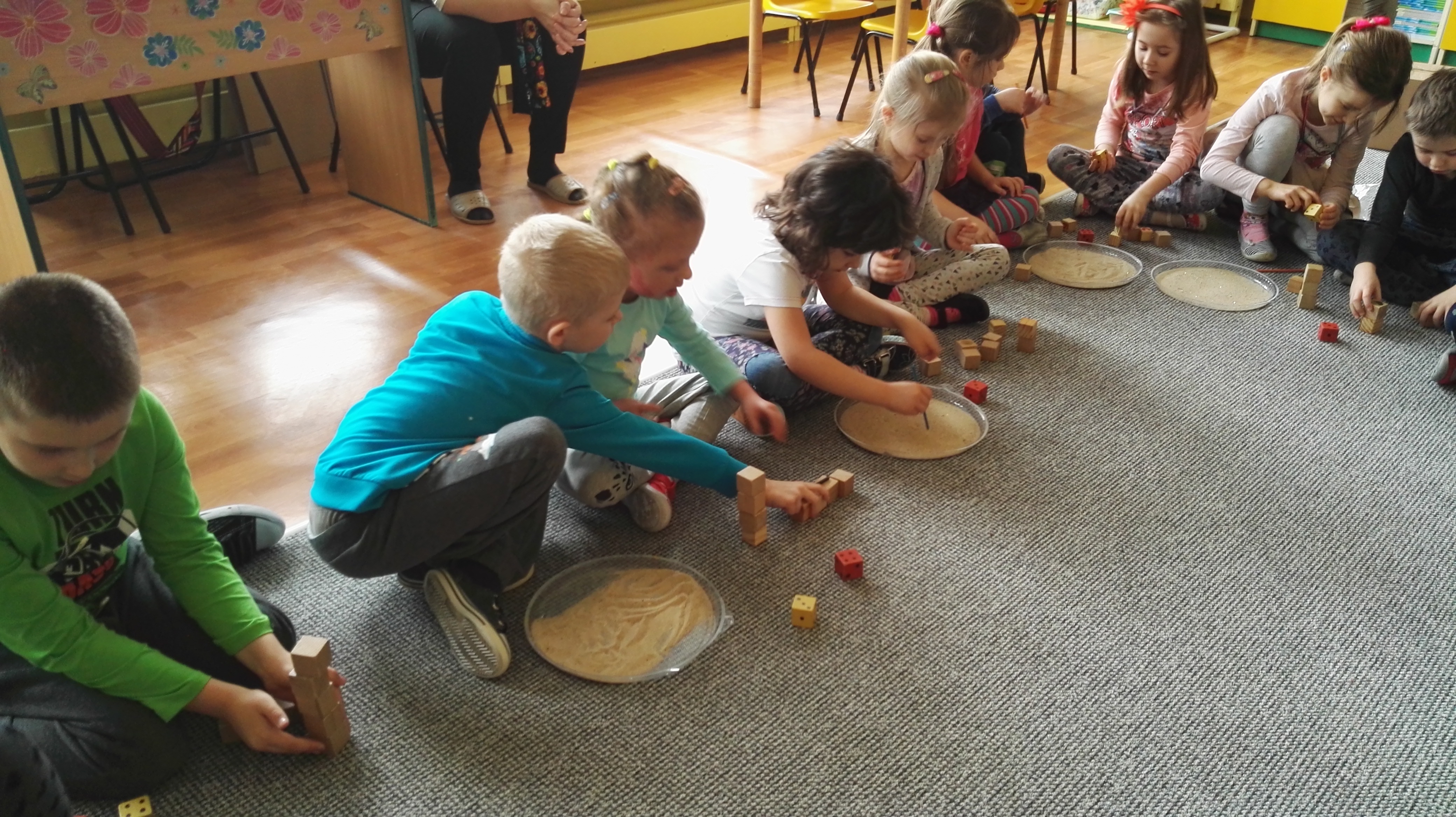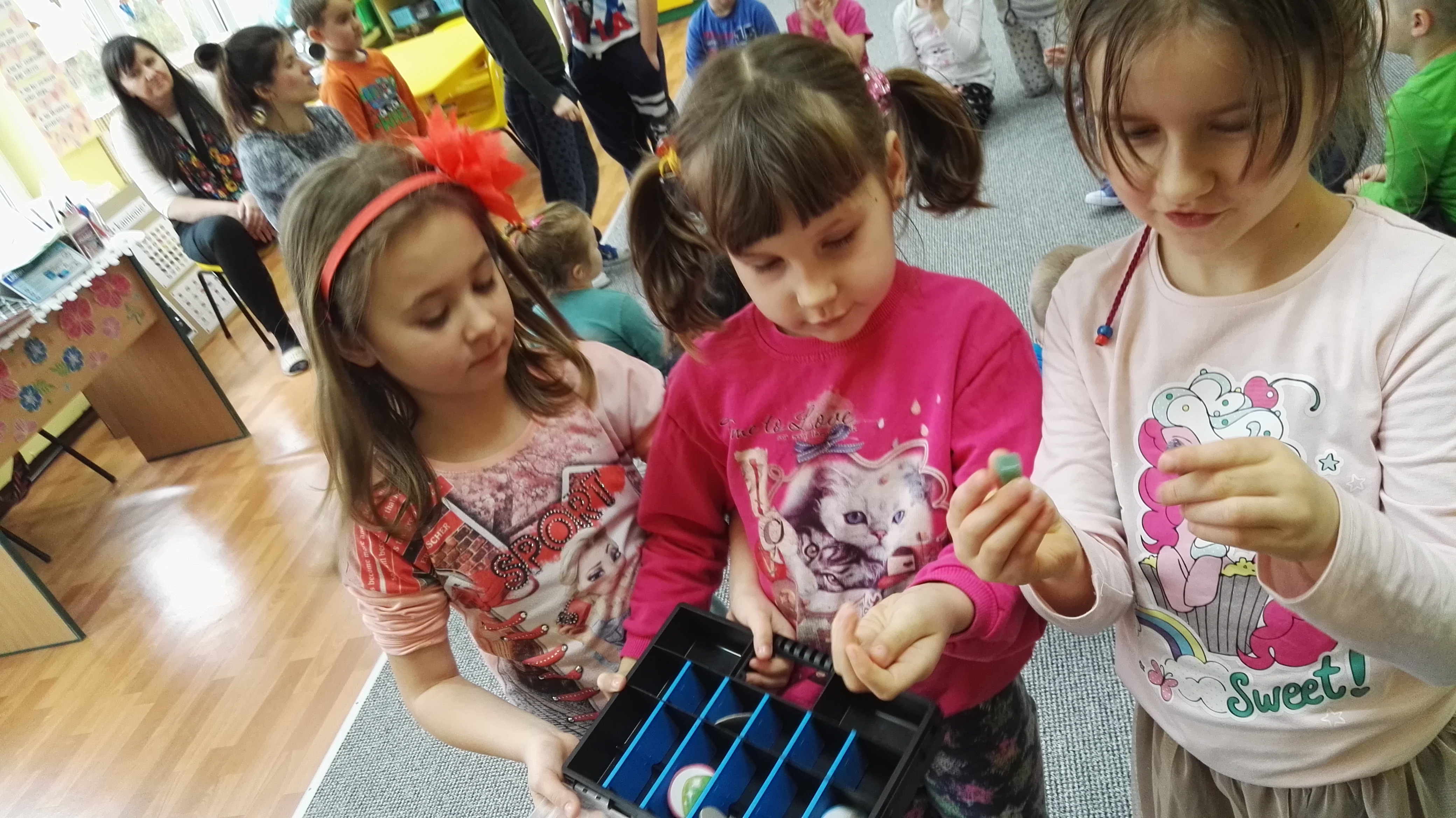 Nasze dzieci wzięły udział w zajęciach tzw. Porannego koła inspirowanych utworem E. Szelzburg – Zarembiny pt. „Królewna”. Ponadczasowy utwór opisujący kaprysy tytułowej królewny stał się pretekstem do inscenizacji w postaci teatrzyku stolikowego. Przedszkolaki przeliczały liczne elementy występujące w teatrzyku pokazując gościom, że nie jest im obca matematyzacja świata. Następnie wykonywały liczne zadania: przeliczały klocki, budowały wieże, pisały cyfry po piasku, budowały tron dla królewny wg. instrukcji. Następnie przystąpiły do pracy w kącikach zabawowo- zadaniowych. Kącik Darów- Królewna Kapryśna taki kaprys miała, że w pięknym pałacu zamieszkać chciała. Dzieci układały zamki z darów: 7, 8, 9 i 10. Kącik twórczy - królewna założyć korony nie chciała i wciąż płakała. Wyszyj dla królewny przepiękną koronę, żeby chciała chodzić w niej co dzień. Przedszkolaki perforowały koronę dla królewny, a następnie za pomocą plastikowych igieł wyszywały wzór. Kącik badawczy- królewna Kapryśna cały świat objechała, pięknych kamieni do swojej korony zapomniała. Dostała w prezencie tajemniczą skałę, ukryte są w niej skarby niebywałe. Dzieci wykuwały kamienie szlachetne z gipsowego bloku, oczyszczały je i nazywały. Kamienie te staną się początkiem naszej przedszkolnej kolekcji „Kamieni i minerałów”. Kącik gospodarczy - królewna Kapryśna taki kaprys miała, że oduczyć dzieci słodkości chciała. Zbuduj dla królewny zamek ze słodkich cegiełek, posklejaj je lukrem i miodem, niczym klejem. Przedszkolaki budowały modele wież i zamków z kostek cukru, które sklejały za pomocą lukru, masła czekoladowego i miodu. Nasze przedszkolaki we wszystkich kącikach spisały się na medal, były niezwykle skupione oraz fachowo i rzeczowo opowiadały o powierzonych im zadaniach. Gratulujemy!