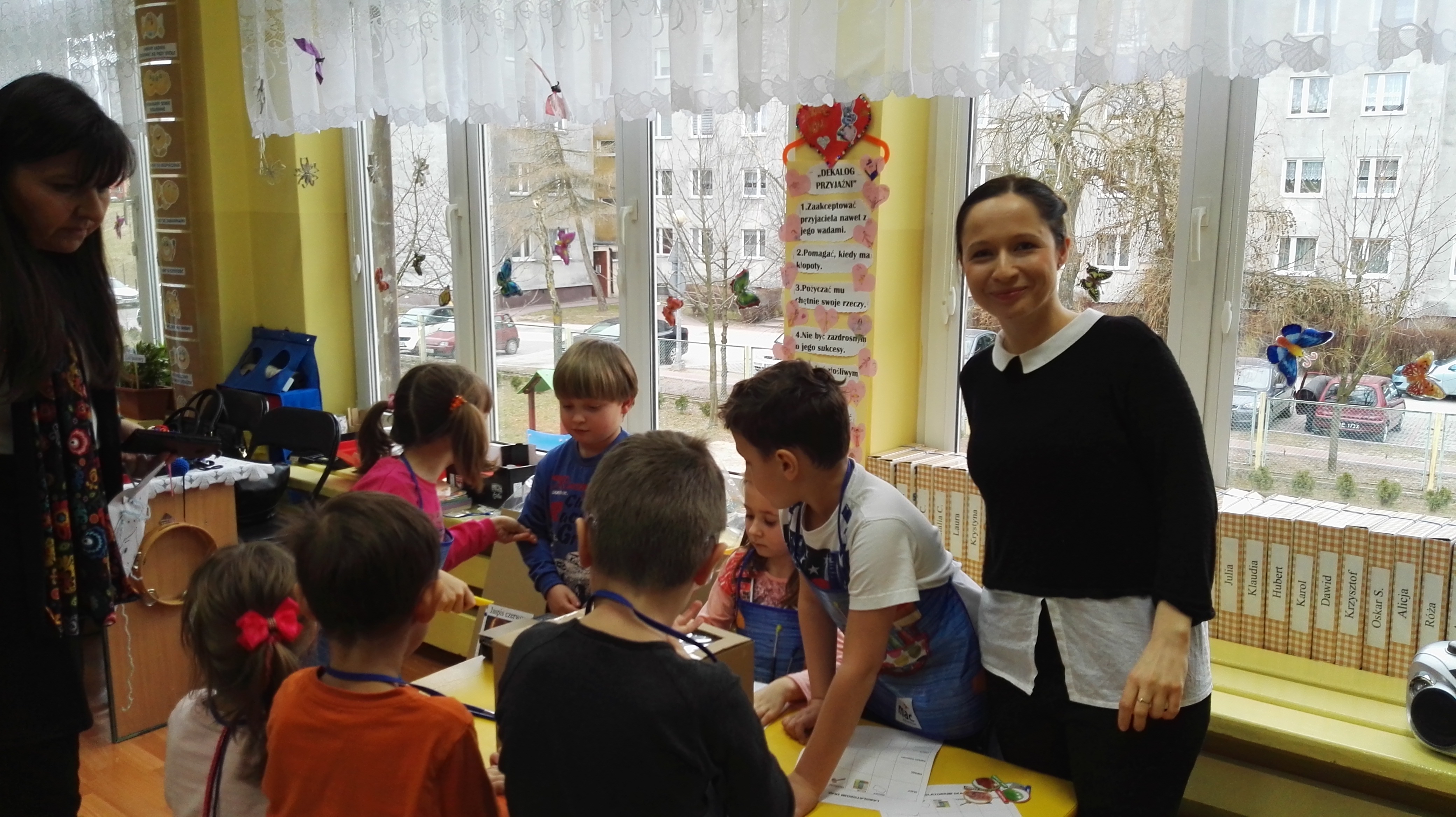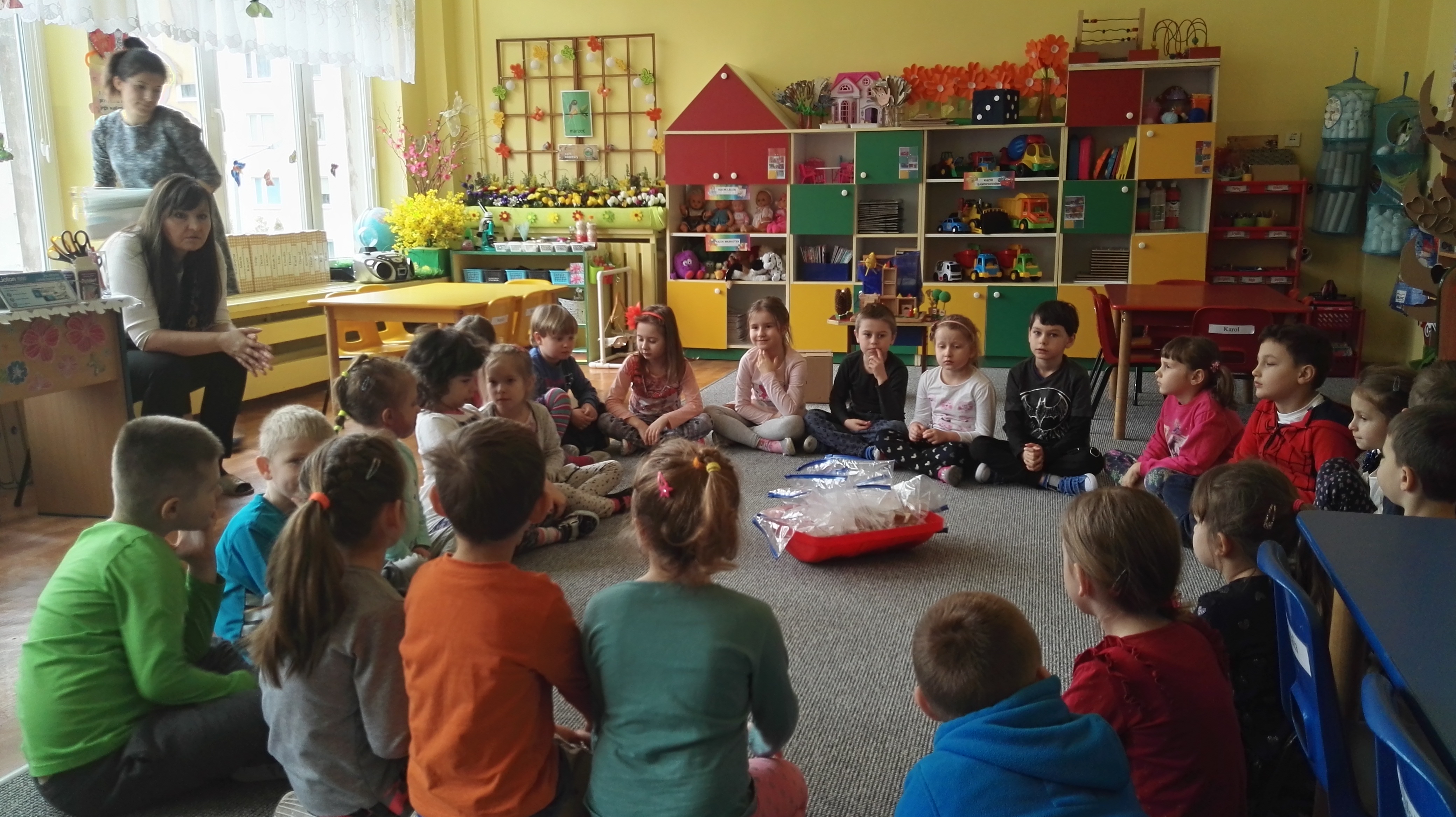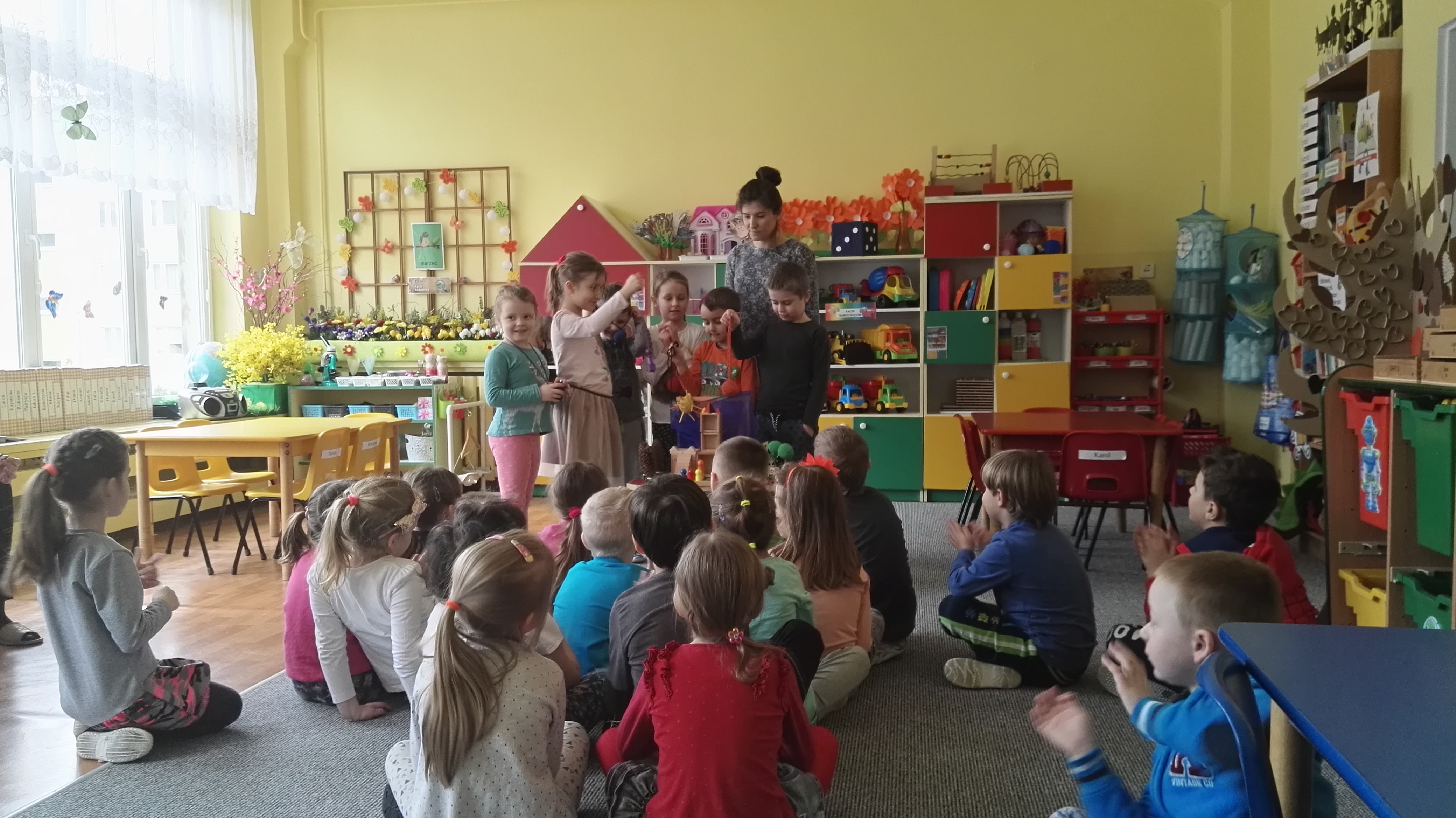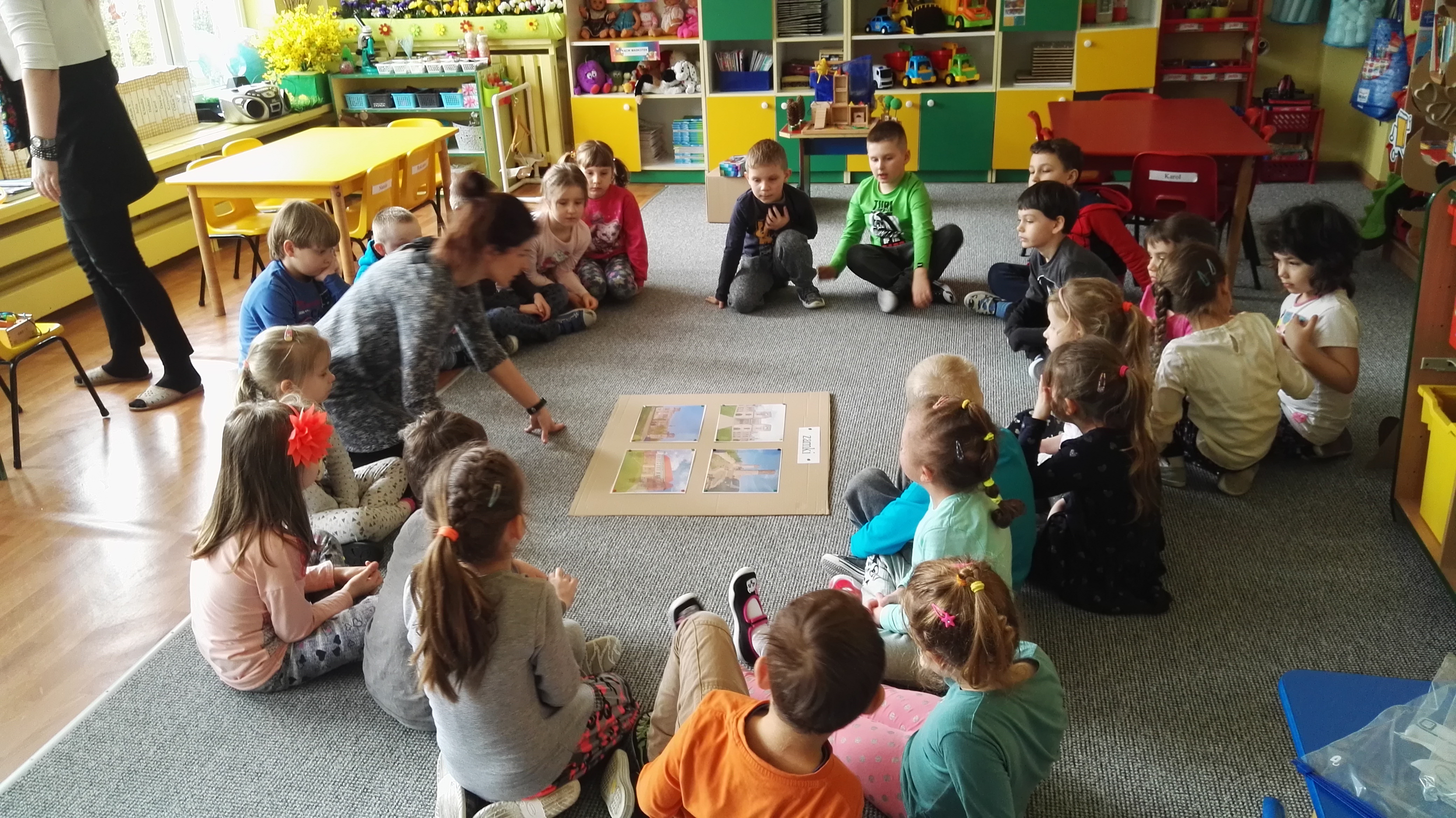 Nasze dzieci wzięły udział w zajęciach tzw. Porannego koła inspirowanych utworem E. Szelzburg – Zarembiny pt. „Królewna”. Ponadczasowy utwór opisujący kaprysy tytułowej królewny stał się pretekstem do inscenizacji w postaci teatrzyku stolikowego. Przedszkolaki przeliczały liczne elementy występujące w teatrzyku pokazując gościom, że nie jest im obca matematyzacja świata. Następnie wykonywały liczne zadania: przeliczały klocki, budowały wieże, pisały cyfry po piasku, budowały tron dla królewny wg. instrukcji. Następnie przystąpiły do pracy w kącikach zabawowo- zadaniowych. Kącik Darów- Królewna Kapryśna taki kaprys miała, że w pięknym pałacu zamieszkać chciała. Dzieci układały zamki z darów: 7, 8, 9 i 10. Kącik twórczy - królewna założyć korony nie chciała i wciąż płakała. Wyszyj dla królewny przepiękną koronę, żeby chciała chodzić w niej co dzień. Przedszkolaki perforowały koronę dla królewny, a następnie za pomocą plastikowych igieł wyszywały wzór. Kącik badawczy- królewna Kapryśna cały świat objechała, pięknych kamieni do swojej korony zapomniała. Dostała w prezencie tajemniczą skałę, ukryte są w niej skarby niebywałe. Dzieci wykuwały kamienie szlachetne z gipsowego bloku, oczyszczały je i nazywały. Kamienie te staną się początkiem naszej przedszkolnej kolekcji „Kamieni i minerałów”. Kącik gospodarczy - królewna Kapryśna taki kaprys miała, że oduczyć dzieci słodkości chciała. Zbuduj dla królewny zamek ze słodkich cegiełek, posklejaj je lukrem i miodem, niczym klejem. Przedszkolaki budowały modele wież i zamków z kostek cukru, które sklejały za pomocą lukru, masła czekoladowego i miodu. Nasze przedszkolaki we wszystkich kącikach spisały się na medal, były niezwykle skupione oraz fachowo i rzeczowo opowiadały o powierzonych im zadaniach. Gratulujemy!