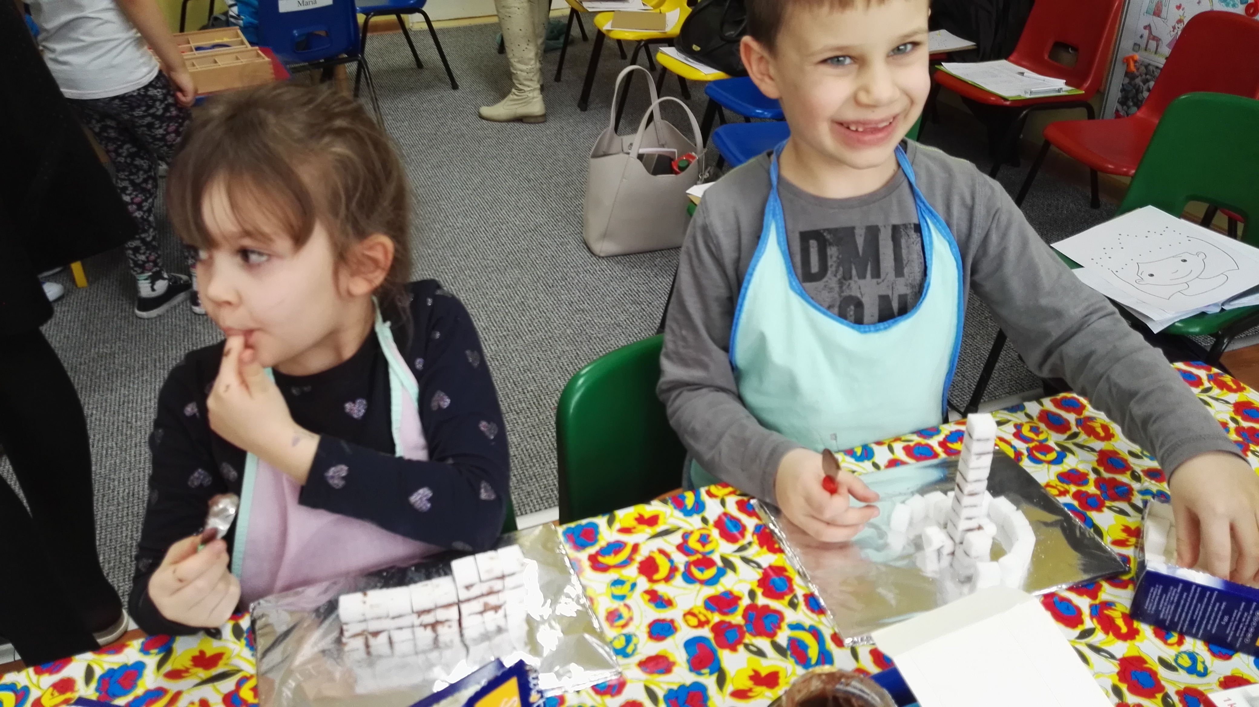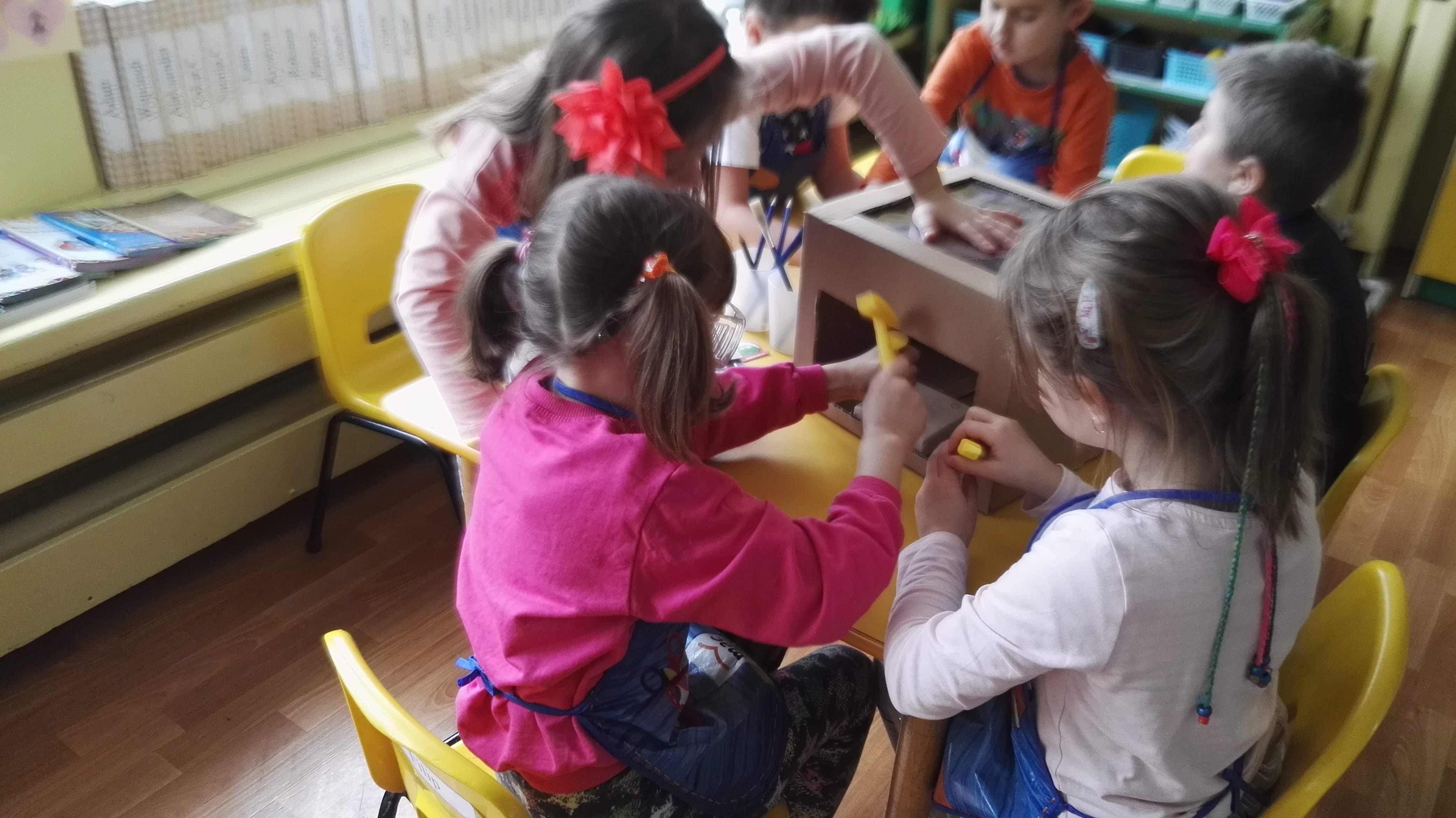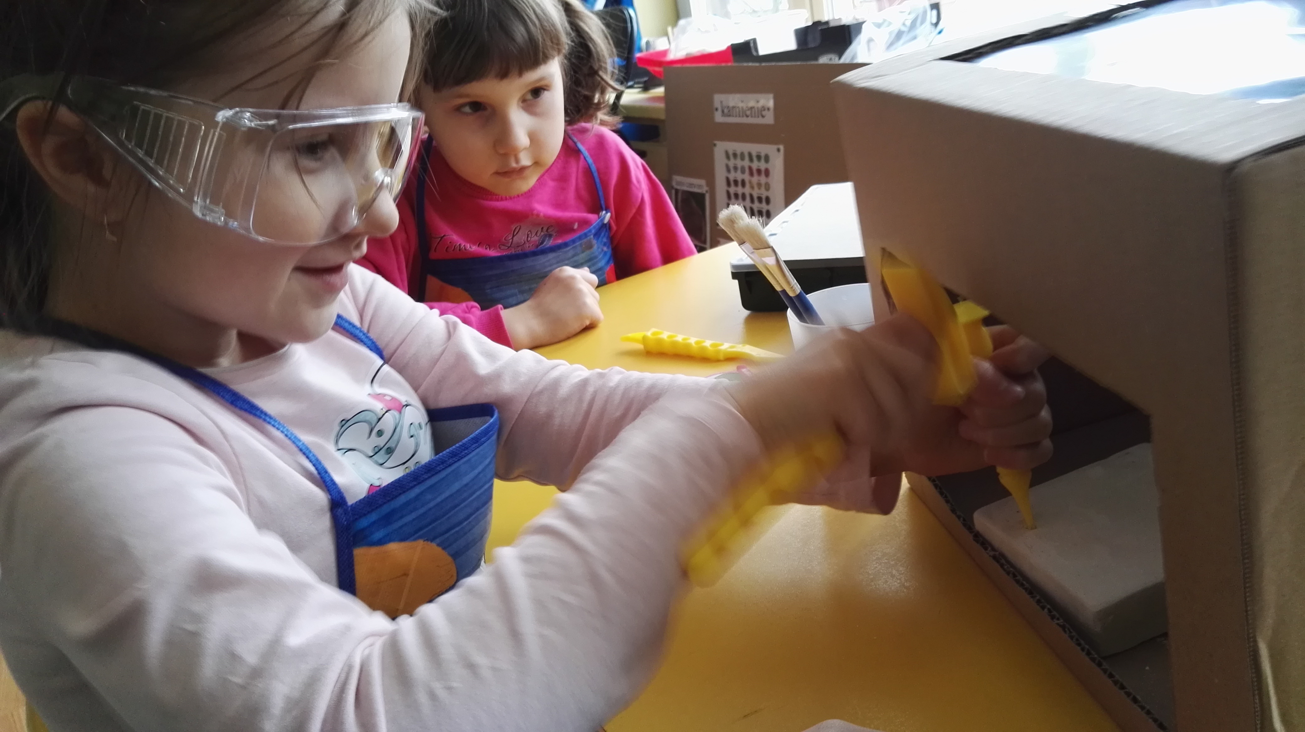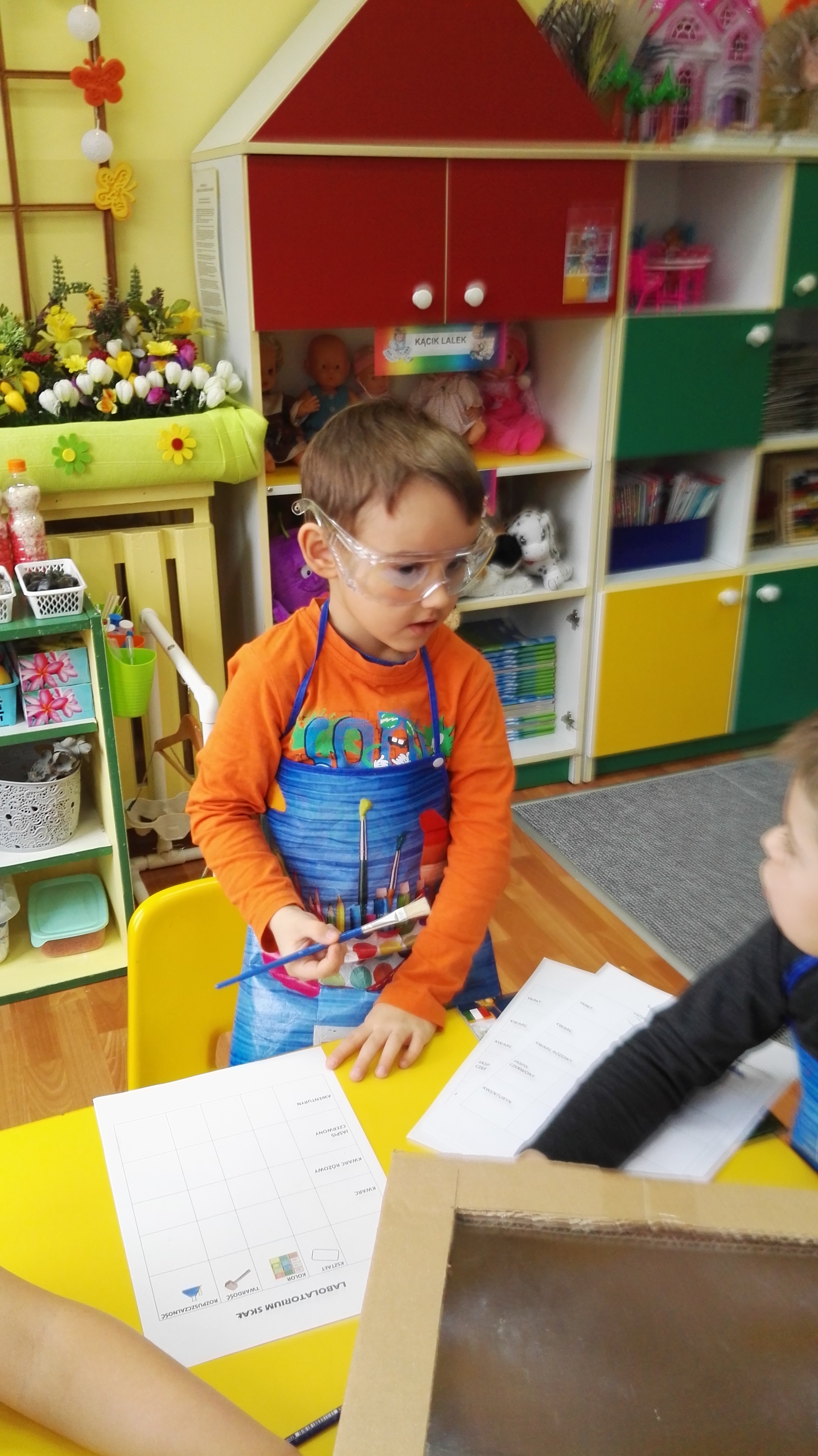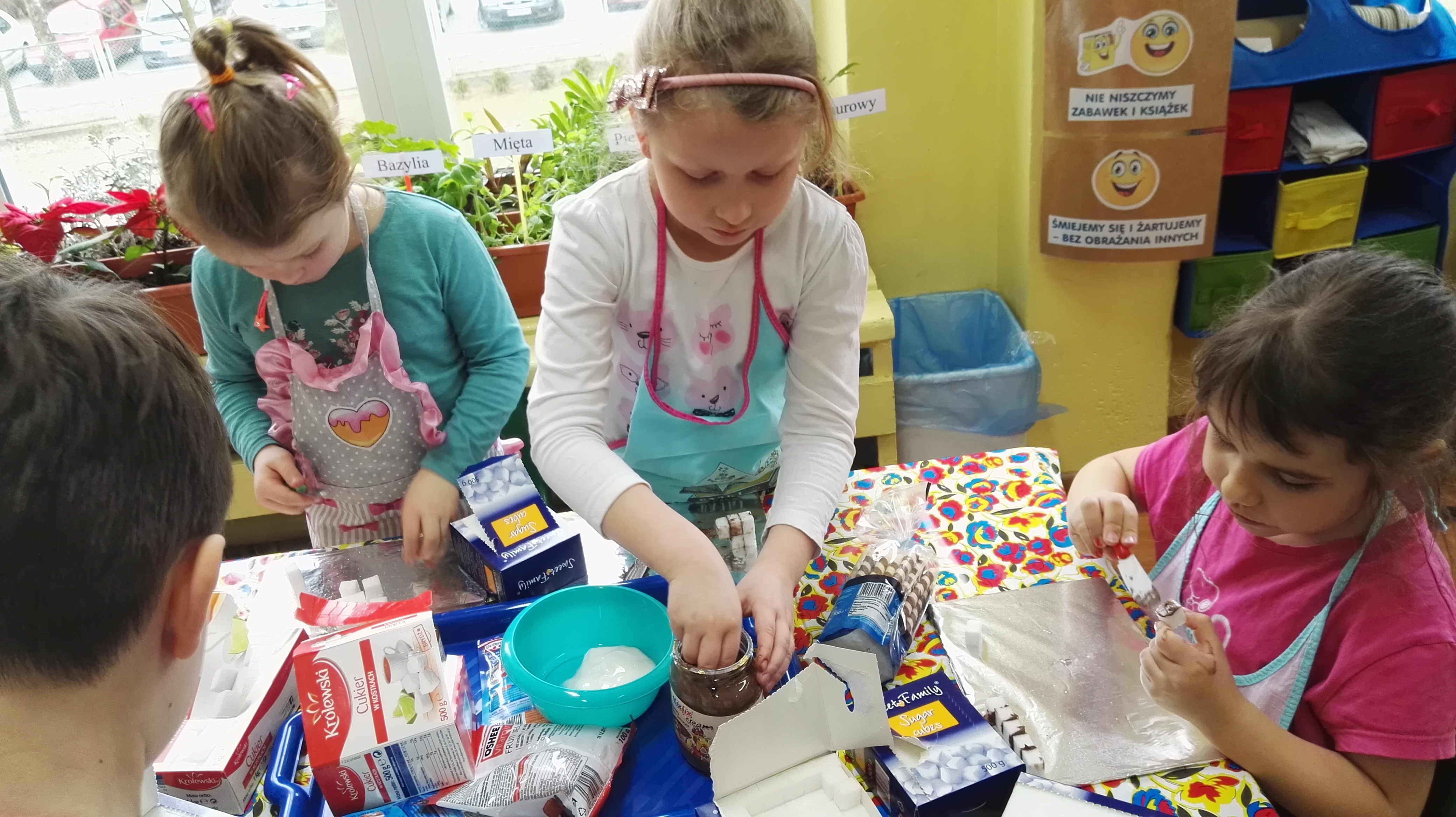 Nasze dzieci wzięły udział w zajęciach tzw. Porannego koła inspirowanych utworem E. Szelzburg – Zarembiny pt. „Królewna”. Ponadczasowy utwór opisujący kaprysy tytułowej królewny stał się pretekstem do inscenizacji w postaci teatrzyku stolikowego. Przedszkolaki przeliczały liczne elementy występujące w teatrzyku pokazując gościom, że nie jest im obca matematyzacja świata. Następnie wykonywały liczne zadania: przeliczały klocki, budowały wieże, pisały cyfry po piasku, budowały tron dla królewny wg. instrukcji. Następnie przystąpiły do pracy w kącikach zabawowo- zadaniowych. Kącik Darów- Królewna Kapryśna taki kaprys miała, że w pięknym pałacu zamieszkać chciała. Dzieci układały zamki z darów: 7, 8, 9 i 10. Kącik twórczy - królewna założyć korony nie chciała i wciąż płakała. Wyszyj dla królewny przepiękną koronę, żeby chciała chodzić w niej co dzień. Przedszkolaki perforowały koronę dla królewny, a następnie za pomocą plastikowych igieł wyszywały wzór. Kącik badawczy- królewna Kapryśna cały świat objechała, pięknych kamieni do swojej korony zapomniała. Dostała w prezencie tajemniczą skałę, ukryte są w niej skarby niebywałe. Dzieci wykuwały kamienie szlachetne z gipsowego bloku, oczyszczały je i nazywały. Kamienie te staną się początkiem naszej przedszkolnej kolekcji „Kamieni i minerałów”. Kącik gospodarczy - królewna Kapryśna taki kaprys miała, że oduczyć dzieci słodkości chciała. Zbuduj dla królewny zamek ze słodkich cegiełek, posklejaj je lukrem i miodem, niczym klejem. Przedszkolaki budowały modele wież i zamków z kostek cukru, które sklejały za pomocą lukru, masła czekoladowego i miodu. Nasze przedszkolaki we wszystkich kącikach spisały się na medal, były niezwykle skupione oraz fachowo i rzeczowo opowiadały o powierzonych im zadaniach. Gratulujemy!