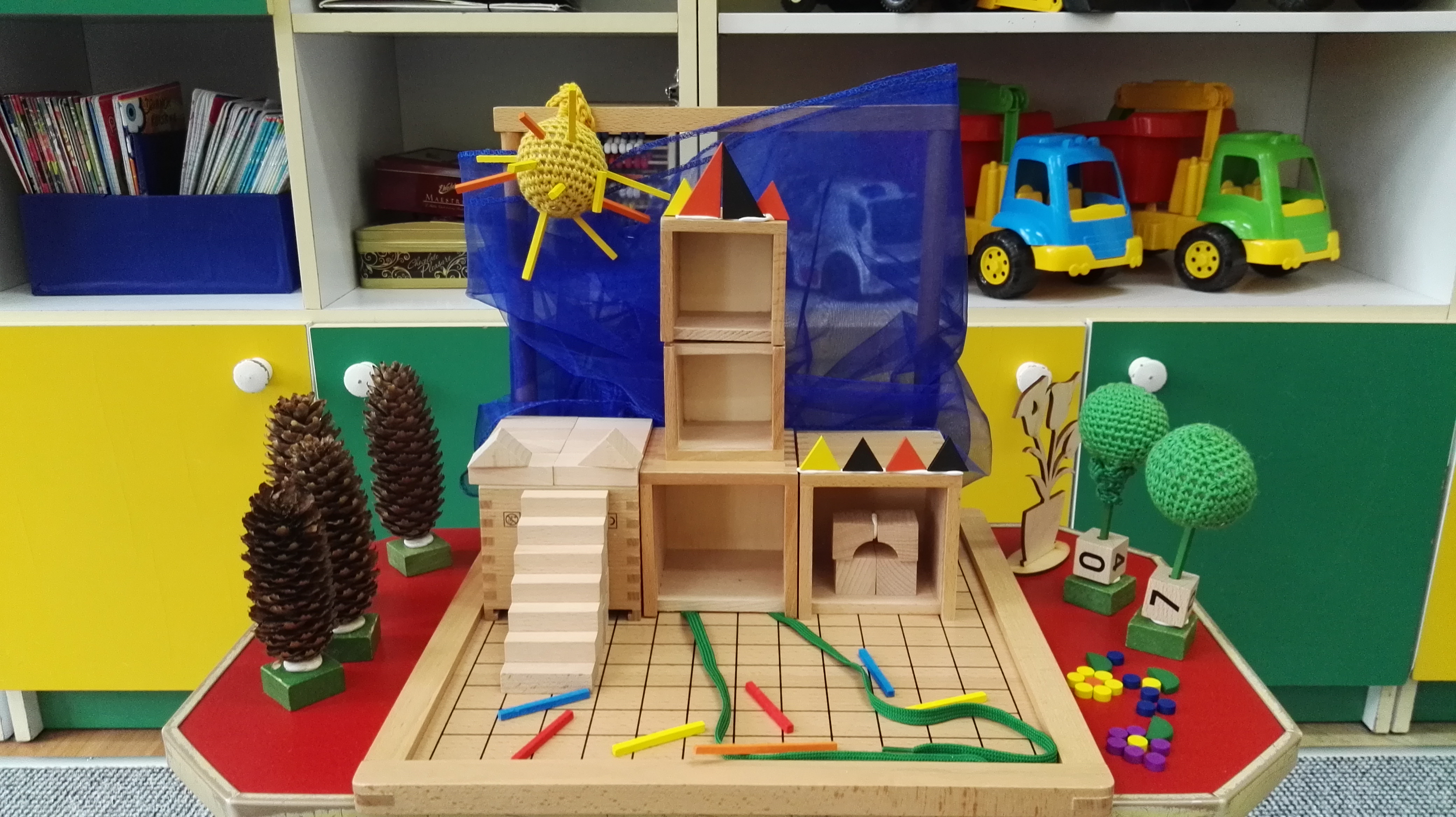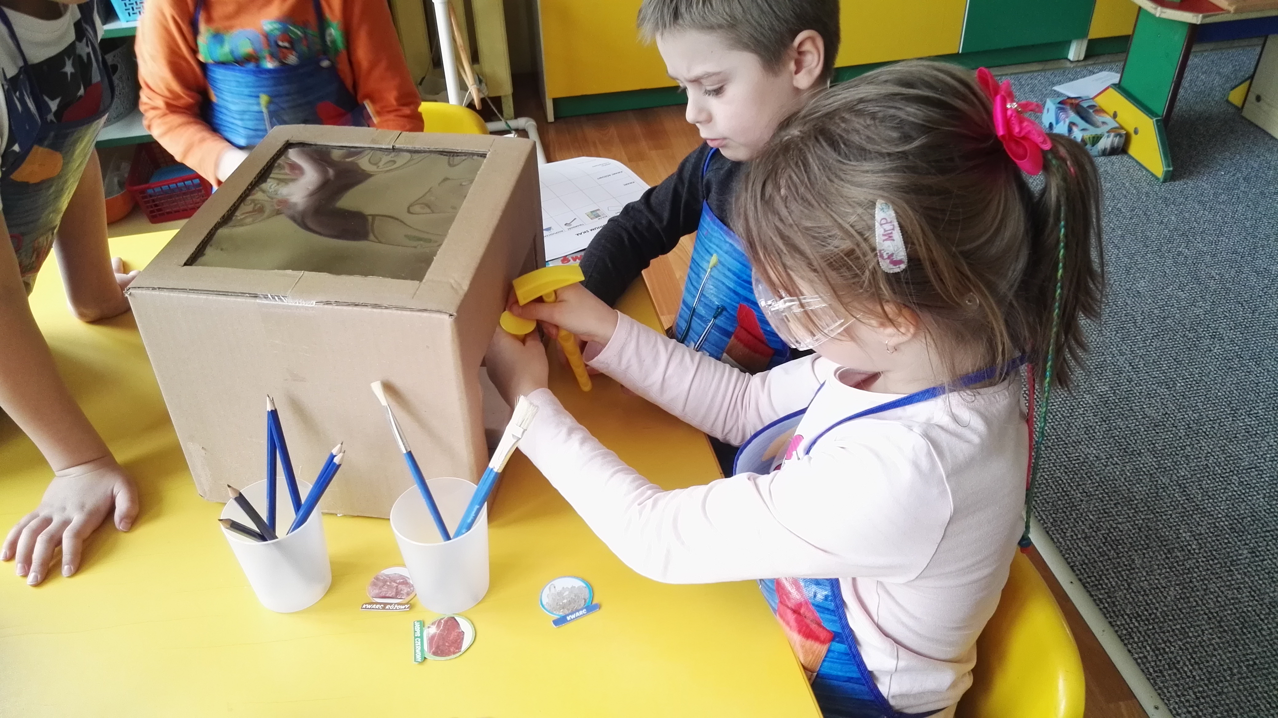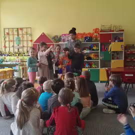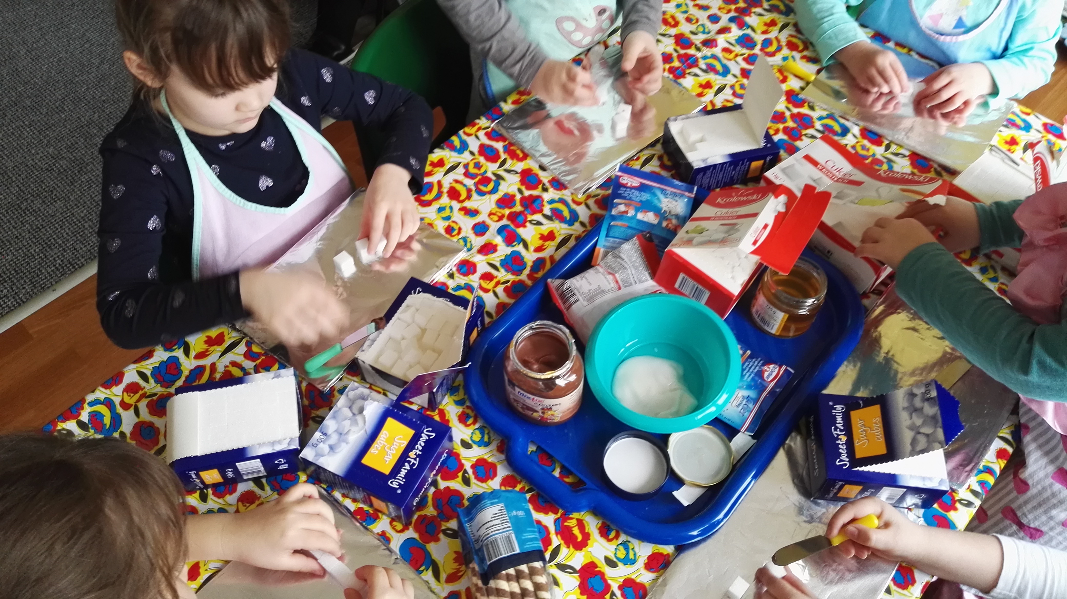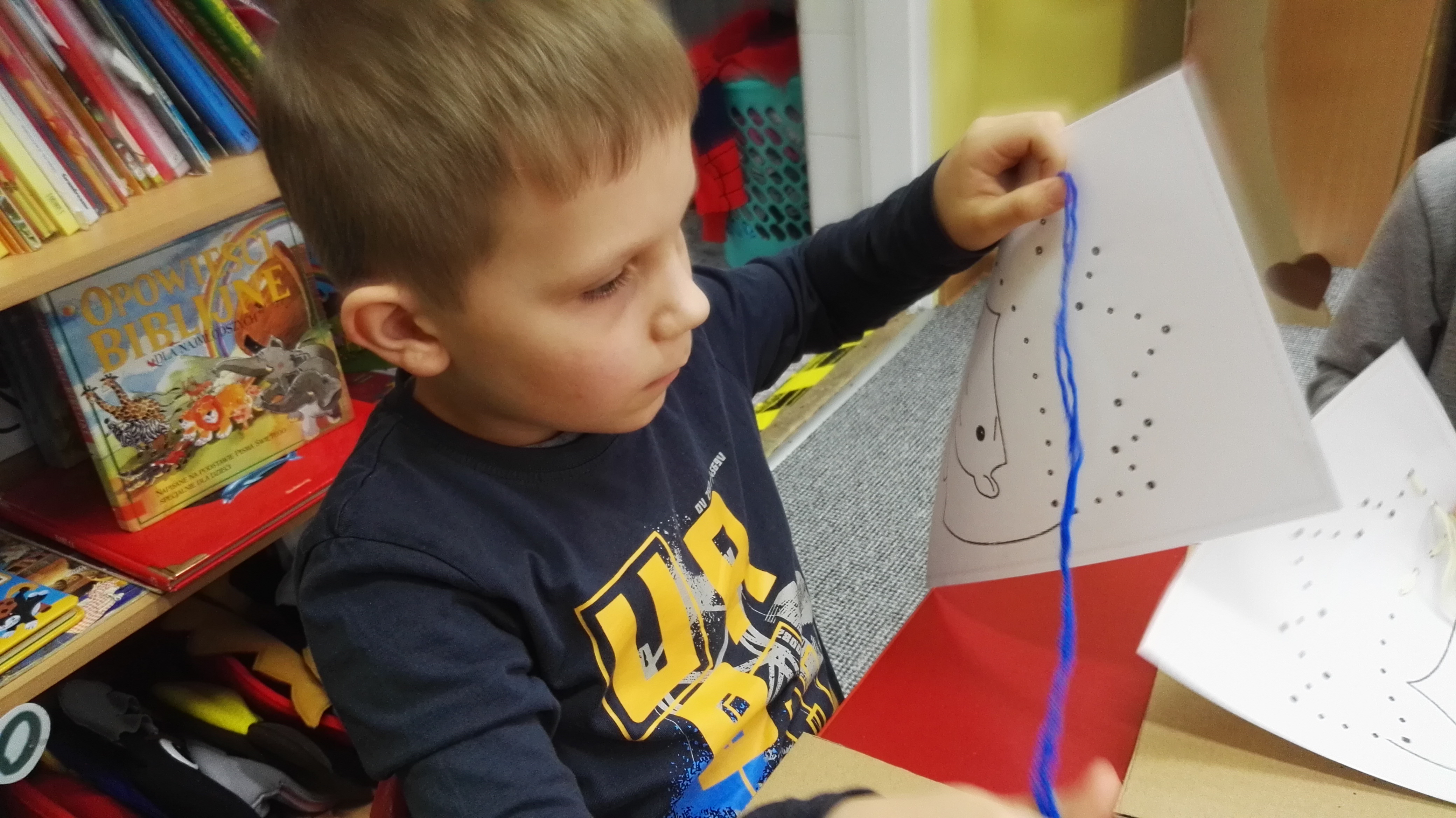 Nasze dzieci wzięły udział w zajęciach tzw. Porannego koła inspirowanych utworem E. Szelzburg – Zarembiny pt. „Królewna”. Ponadczasowy utwór opisujący kaprysy tytułowej królewny stał się pretekstem do inscenizacji w postaci teatrzyku stolikowego. Przedszkolaki przeliczały liczne elementy występujące w teatrzyku pokazując gościom, że nie jest im obca matematyzacja świata. Następnie wykonywały liczne zadania: przeliczały klocki, budowały wieże, pisały cyfry po piasku, budowały tron dla królewny wg. instrukcji. Następnie przystąpiły do pracy w kącikach zabawowo- zadaniowych. Kącik Darów- Królewna Kapryśna taki kaprys miała, że w pięknym pałacu zamieszkać chciała. Dzieci układały zamki z darów: 7, 8, 9 i 10. Kącik twórczy - królewna założyć korony nie chciała i wciąż płakała. Wyszyj dla królewny przepiękną koronę, żeby chciała chodzić w niej co dzień. Przedszkolaki perforowały koronę dla królewny, a następnie za pomocą plastikowych igieł wyszywały wzór. Kącik badawczy- królewna Kapryśna cały świat objechała, pięknych kamieni do swojej korony zapomniała. Dostała w prezencie tajemniczą skałę, ukryte są w niej skarby niebywałe. Dzieci wykuwały kamienie szlachetne z gipsowego bloku, oczyszczały je i nazywały. Kamienie te staną się początkiem naszej przedszkolnej kolekcji „Kamieni i minerałów”. Kącik gospodarczy - królewna Kapryśna taki kaprys miała, że oduczyć dzieci słodkości chciała. Zbuduj dla królewny zamek ze słodkich cegiełek, posklejaj je lukrem i miodem, niczym klejem. Przedszkolaki budowały modele wież i zamków z kostek cukru, które sklejały za pomocą lukru, masła czekoladowego i miodu. Nasze przedszkolaki we wszystkich kącikach spisały się na medal, były niezwykle skupione oraz fachowo i rzeczowo opowiadały o powierzonych im zadaniach. Gratulujemy!