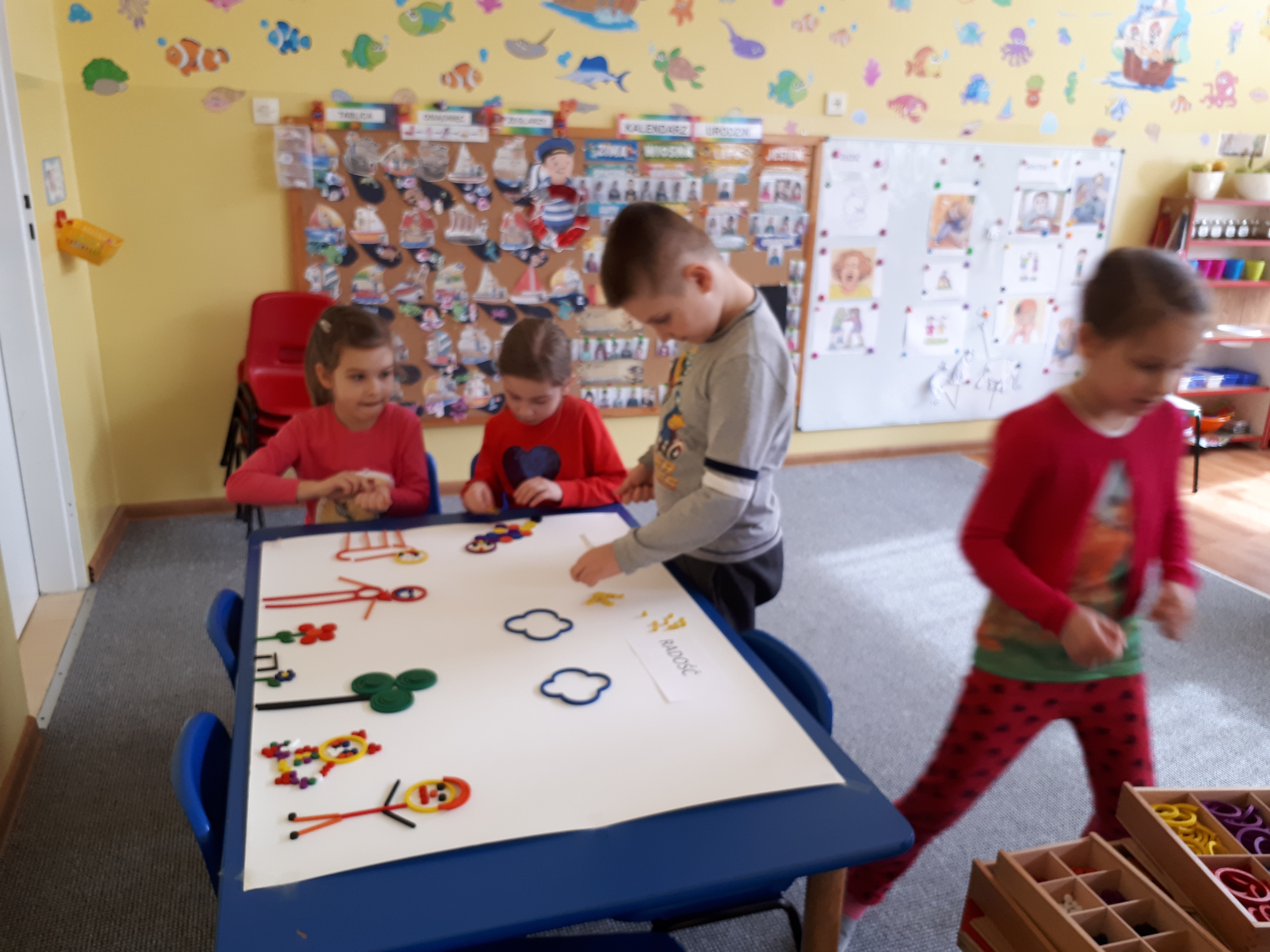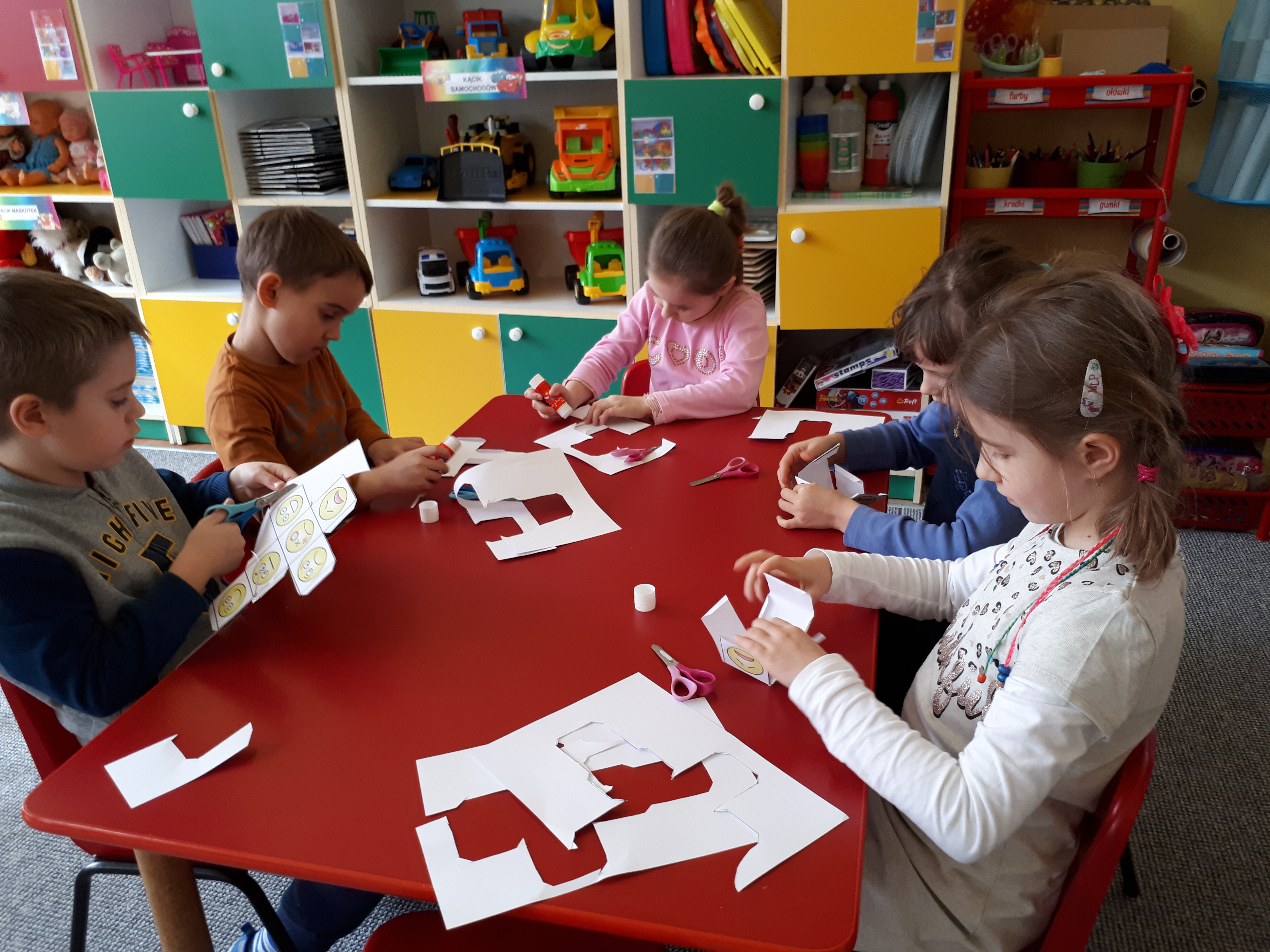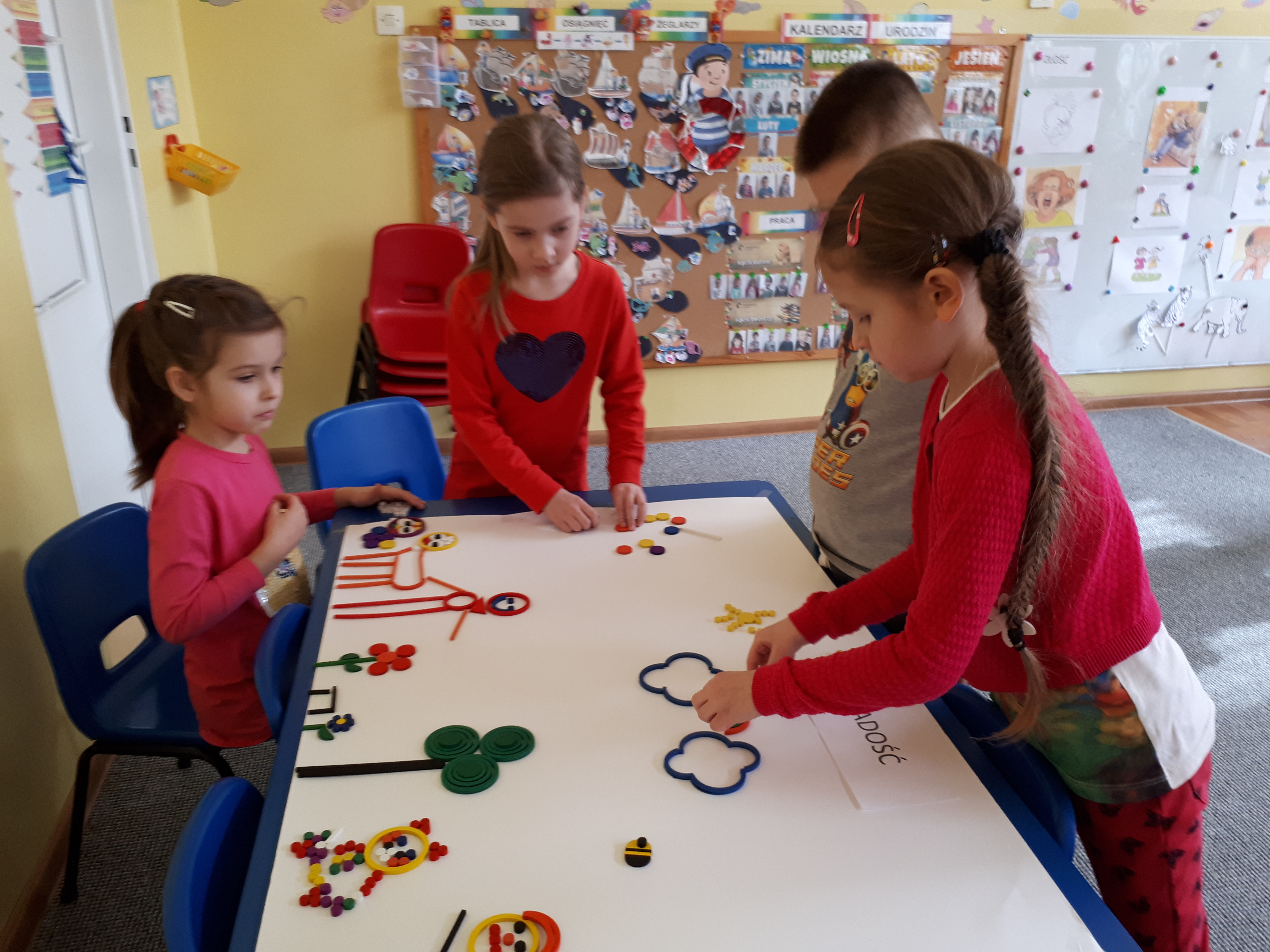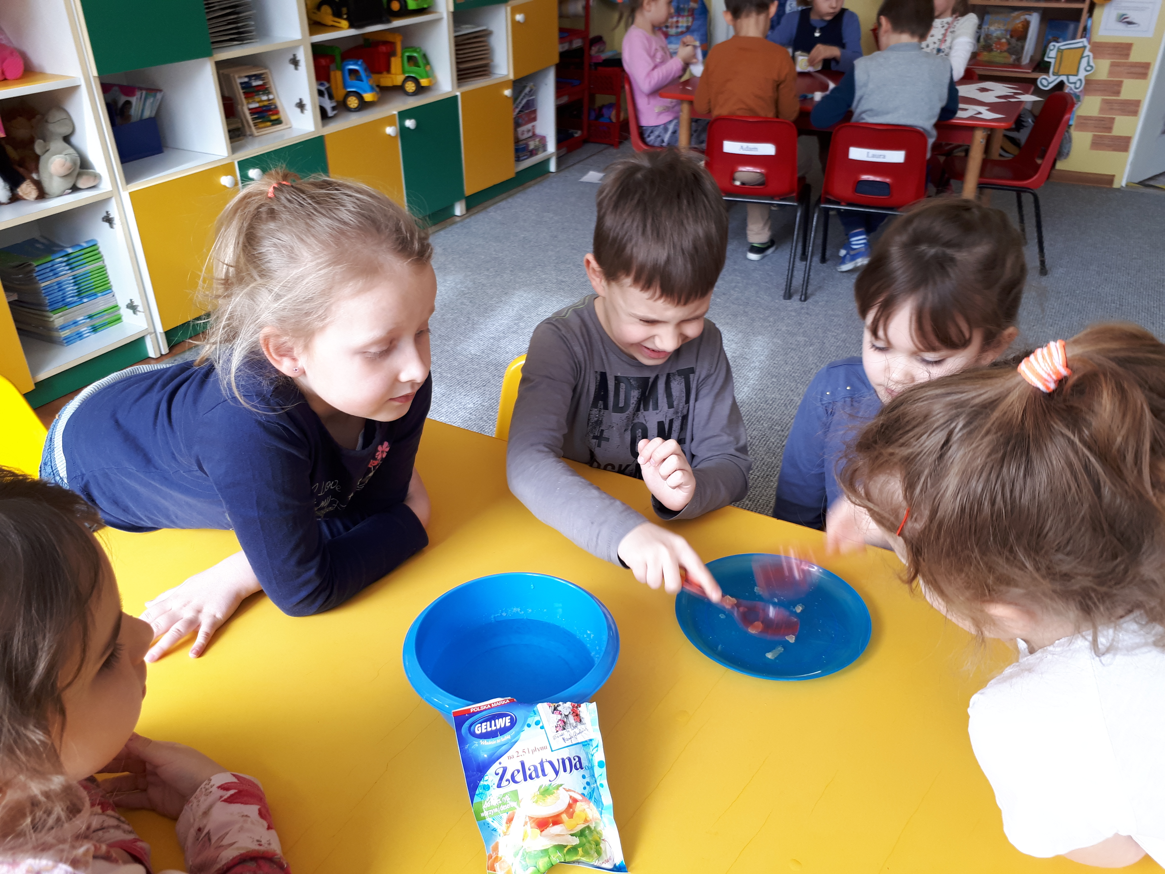 Bajki terapeutyczne mają na celu danie dzieciom wsparcia, pomoc w rozumieniu sytuacji trudnych, także uświadomienie doznawanych emocji, poznanie nowych strategii radzenia sobie i zastępczą kompensację, co powoduje, że występują w nich pewne elementy wspólne. Bajki terapeutyczne, to skuteczna metoda wychowania wrażliwego człowieka umiejącego radzić sobie w życiu pomimo napotykanych trudności. W bieżącym roku szkolnym poznajemy przygody zwierząt i roślin i pomagamy im w rozwiązywaniu małych-wielkich problemów. Tym razem postanowiliśmy rozwiązać problemy małego białego tygryska, który poprzez swoja inność został odrzucony przez otoczenie. Utwór został wystawiony w postaci teatrzyku cieni przez nasze dzieci. Po rozmowie dotyczącej treści teatrzyku dzieci przystąpiły do prac w kącikach zabawowo- zadaniowych. W kąciku Darów- układały z klocków „Krainę Radości”. W kąciku Twórczym przedszkolaki wykonywały kostkę emocji, która posłużyła nam do wielu popołudniowych zabaw z uczuciami i emocjami. W kąciku Badawczym dzieci badały trafność metafory: „Trząść się jak galareta”, badając właściwości żelatyny i galaretki. Dzieci rozpuszczały żelatynę i galaretkę najpierw w ciepłej, a później w zimnej wodzie. Poznawały właściwości obu substancji oraz próbowały poznać przepis na galaretkę. W kąciku Gospodarczym dzielni kucharze projektowali postać białego tygryska z wafli ryżowych, wędliny, żółtego sera, czarnych oliwek i pomidorków koktajlowych. Zajęcia miały na celu uwrażliwienie dzieci na to, że nie należy się chwalić, dokuczać innym oraz wyszydzać i szykanować innych.