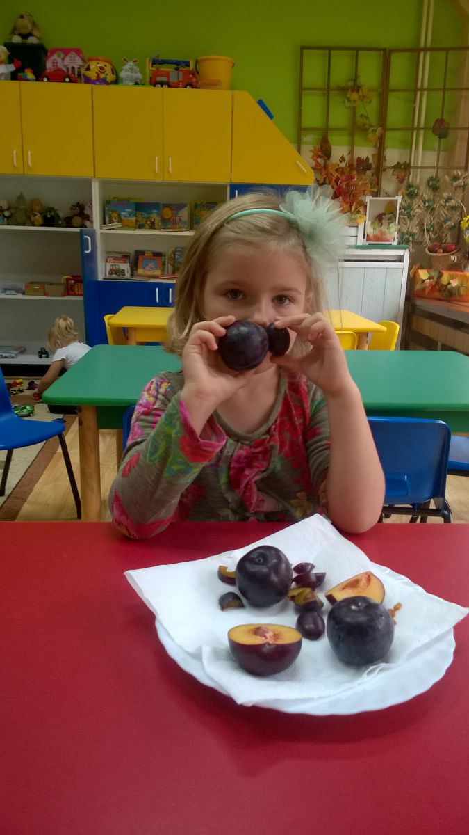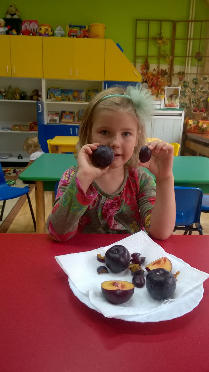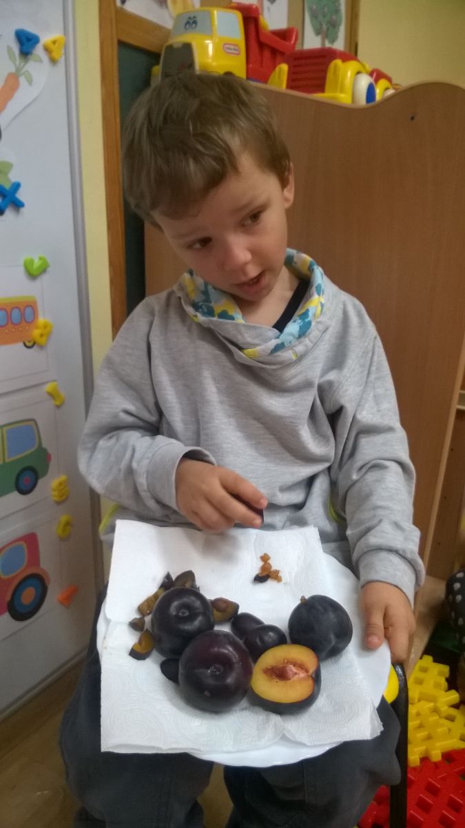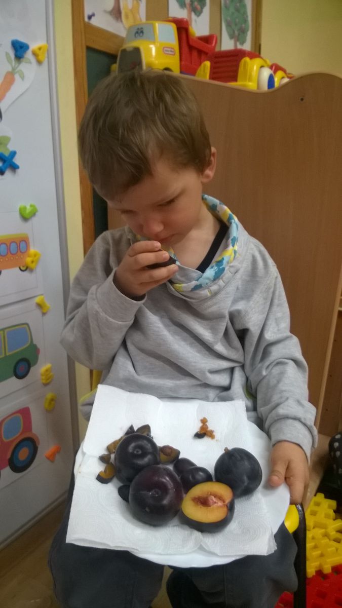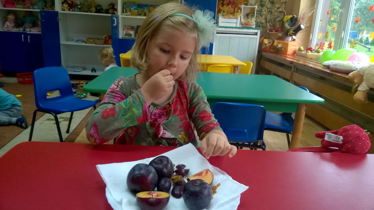Nadeszła jesień, czas zmieniającej się pogody, a wraz z nią bogactwo kolorów i wspaniałe Dary Jesieni. Jest to czas gdzie sady dają nam najwspanialsze owoce, które możemy degustować. Przedszkole stara się, aby w tym czasie dzieci uzyskały jak najwięcej wiadomości na temat dobrodziejstw, jakie daje nam „Matka Natura”. Dlatego też tematyka jesienna zainspirowała dzieci do przedstawienia części artystycznej podczas uroczystości z okazji Ogólnopolskiego Dnia Przedszkolaka, w formie piosenki, której motywem przewodnim była śliwka. Utwór,, Śliwka robaczywka ”z płyty z piosenkami pełnymi dobrych emocji dla dzieci pt. „Ogrody". Pomagają one docenić rzeczy proste, dostrzec piękno świata, wartość przyjaźni, więzi rodzinnych, a przede wszystkim miłości. Nie brakowało w nich dozy dobrego humoru. Dzieci poznawały także walory odżywcze śliwek. Poznawały je wielozmysłowo - po wyglądzie, kształcie i smaku. Zapraszamy do oglądania zdjęć