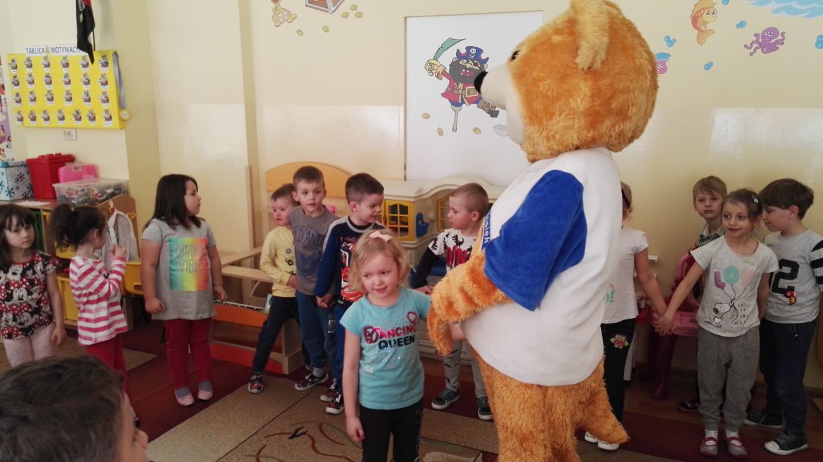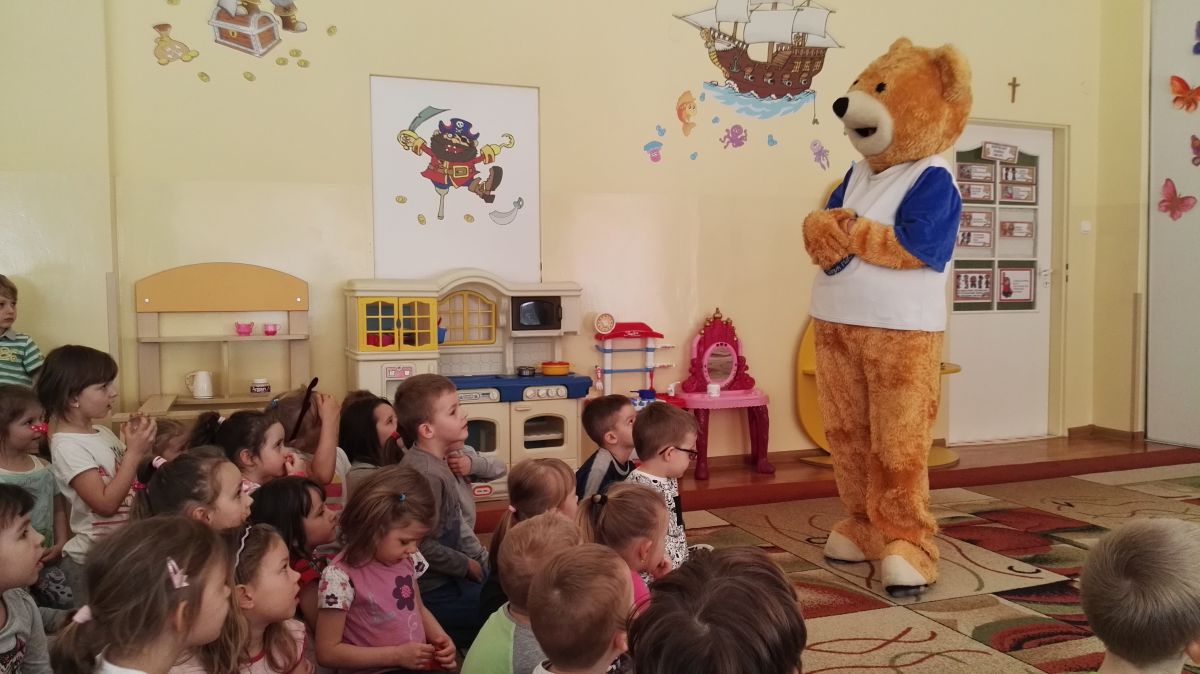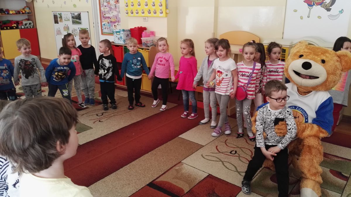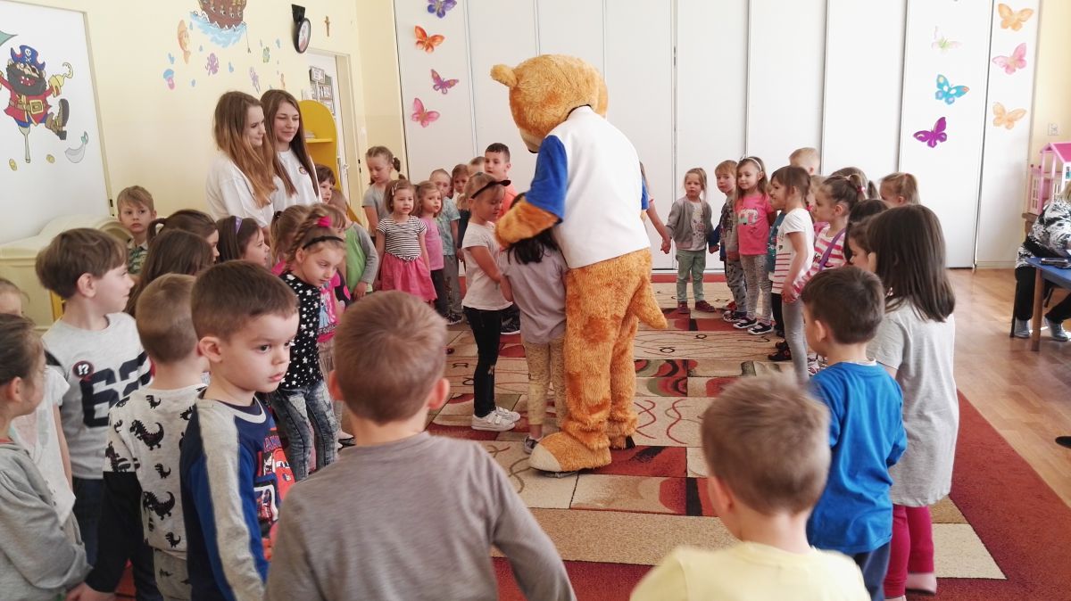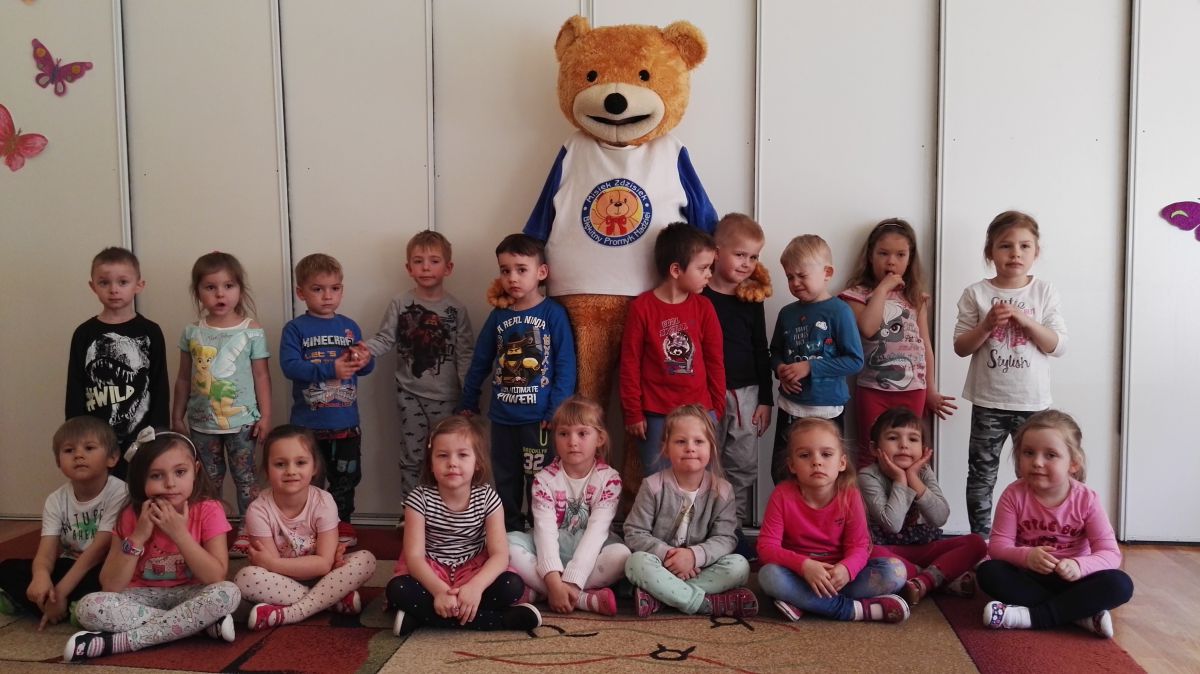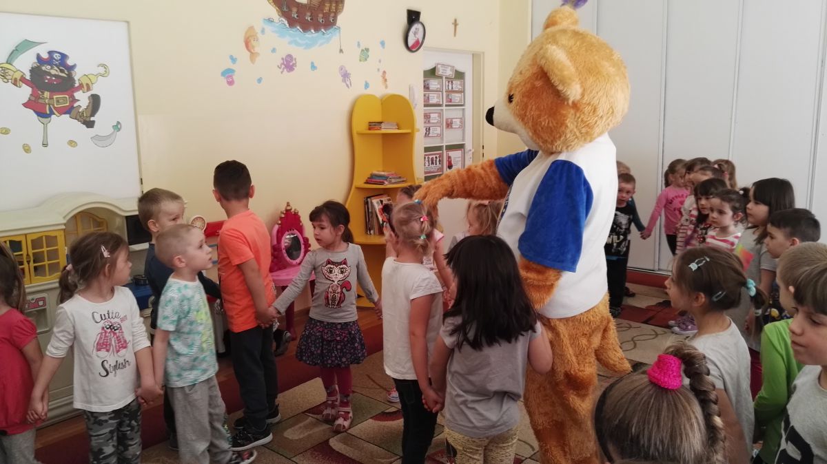 11 kwietnia nasze Przedszkole odwiedzili bardzo mili goście z Fundacji "Błękitny Promyk Nadziei", a wraz z nimi MISIEK ZDZISIEK, który szybka skradł serca naszych przedszkolaków. Miś opowiedział dzieciom, w jakim celu zbieramy nakrętki i co dzieje się z nimi później ( są przerabiane są na granulat, z którego powstają nowe zakrętki, rury PCV czy obudowy komputerów). Pracownicy Fundacji podziękowali dzieciom i ich bliskim za włączenie się w akcję charytatywną pod hasłem „Misiek Zdzisiek zbiera nakrętki” - nasze Przedszkole kolejny już rok wspiera tę inicjatywę. Zbieranie nakrętek jest działaniem proekologicznym, a we współpracy z Fundacją pozwala uzyskać środki finansowe na bieżące funkcjonowanie i dalsze niesienie pomocy osobom niepełnosprawnym z terenu województwa świętokrzyskiego. Podczas spotkania MISIEK bawił się i tańczył z dziećmi oraz pozował do zdjęć. Było bardzo wesoło. Po zabawach wszyscy zgodnie obiecaliśmy, że dalej będziemy pomagać :)