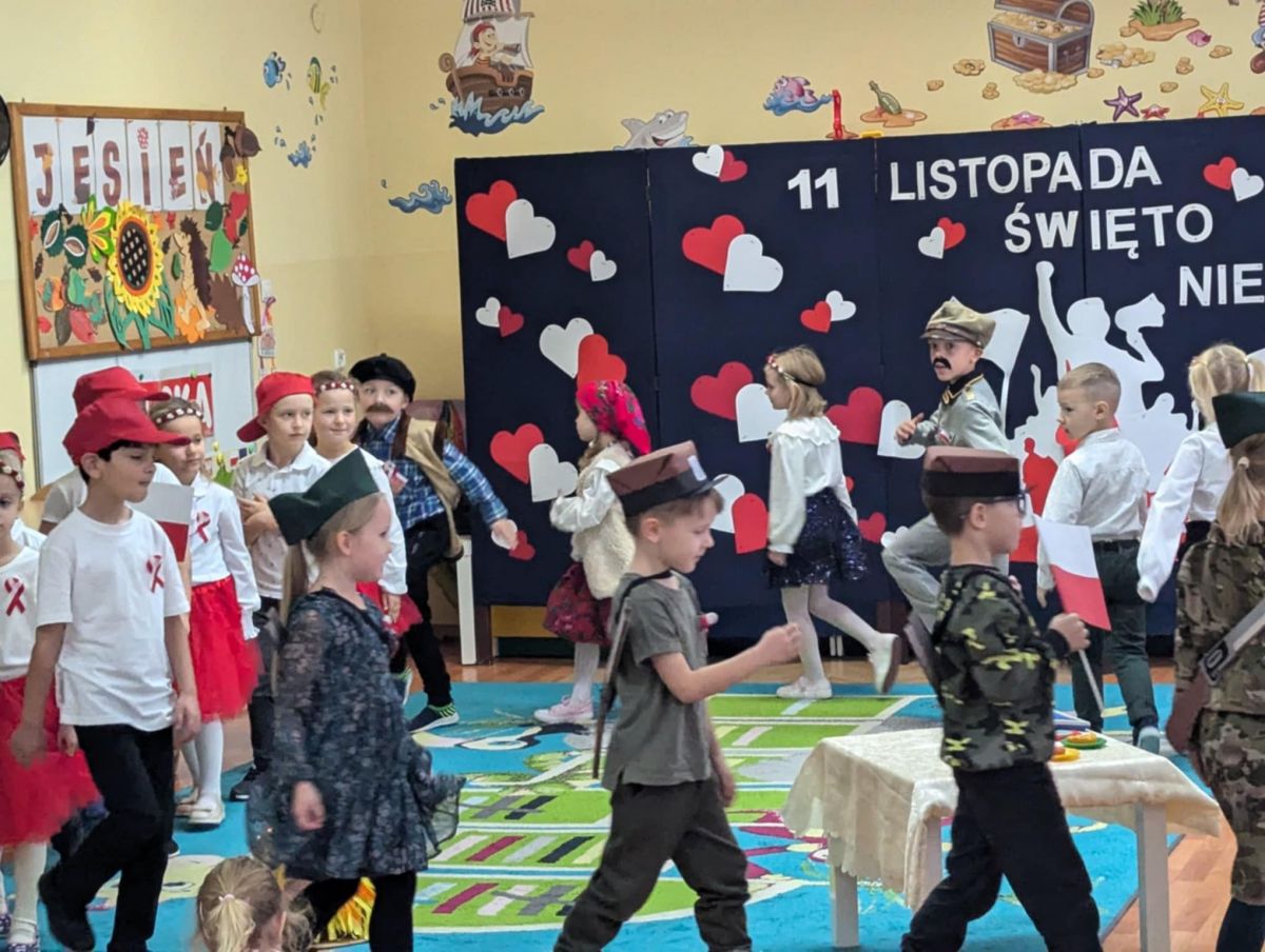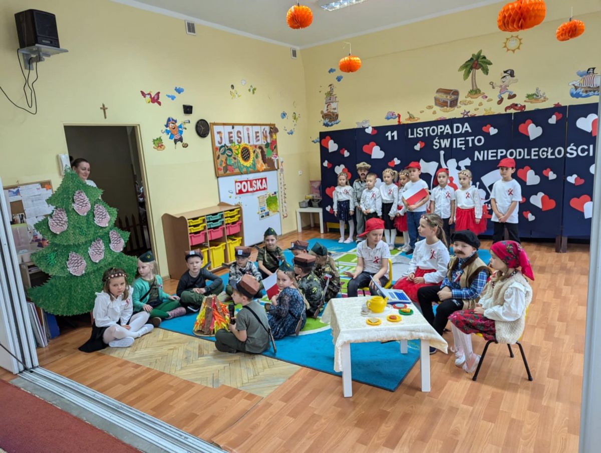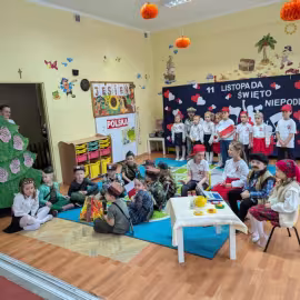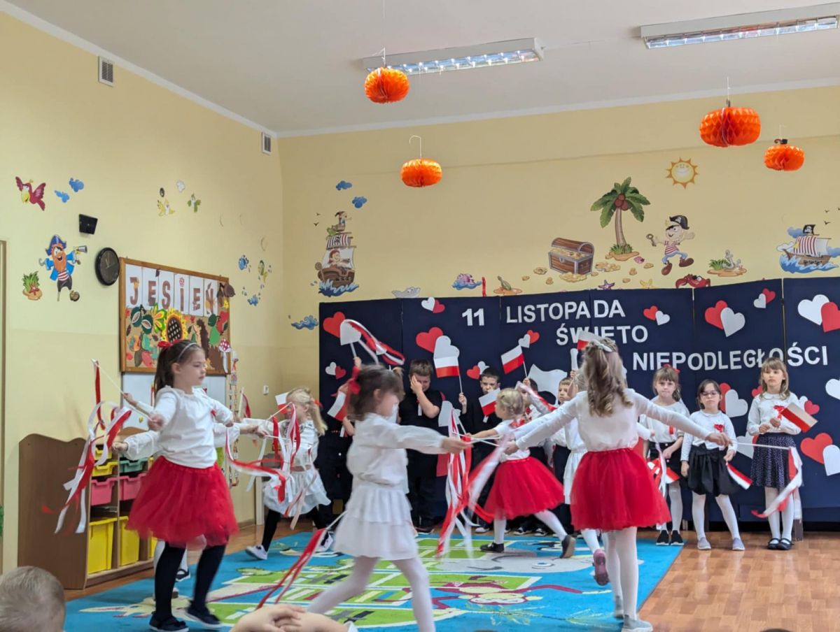 W ten sposób włączyliśmy całą przedszkolną społeczność we wspólne świętowanie kolejnej rocznicy odzyskania przez Polskę niepodległości. Z tej okazji grupy starsze przygotowały dla młodszych kolegów przedstawienie.