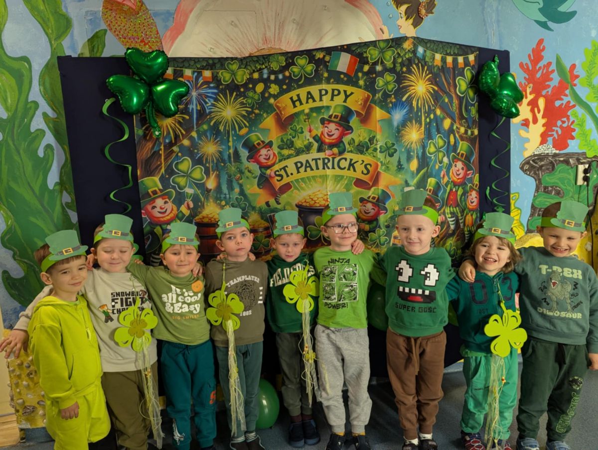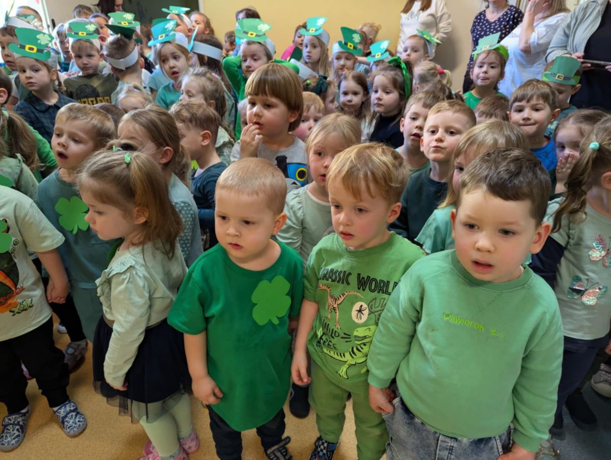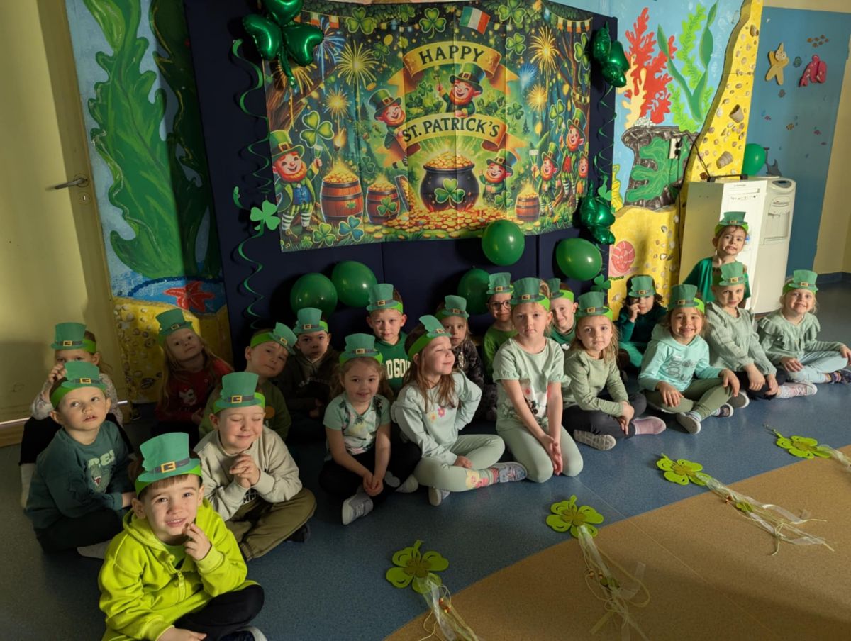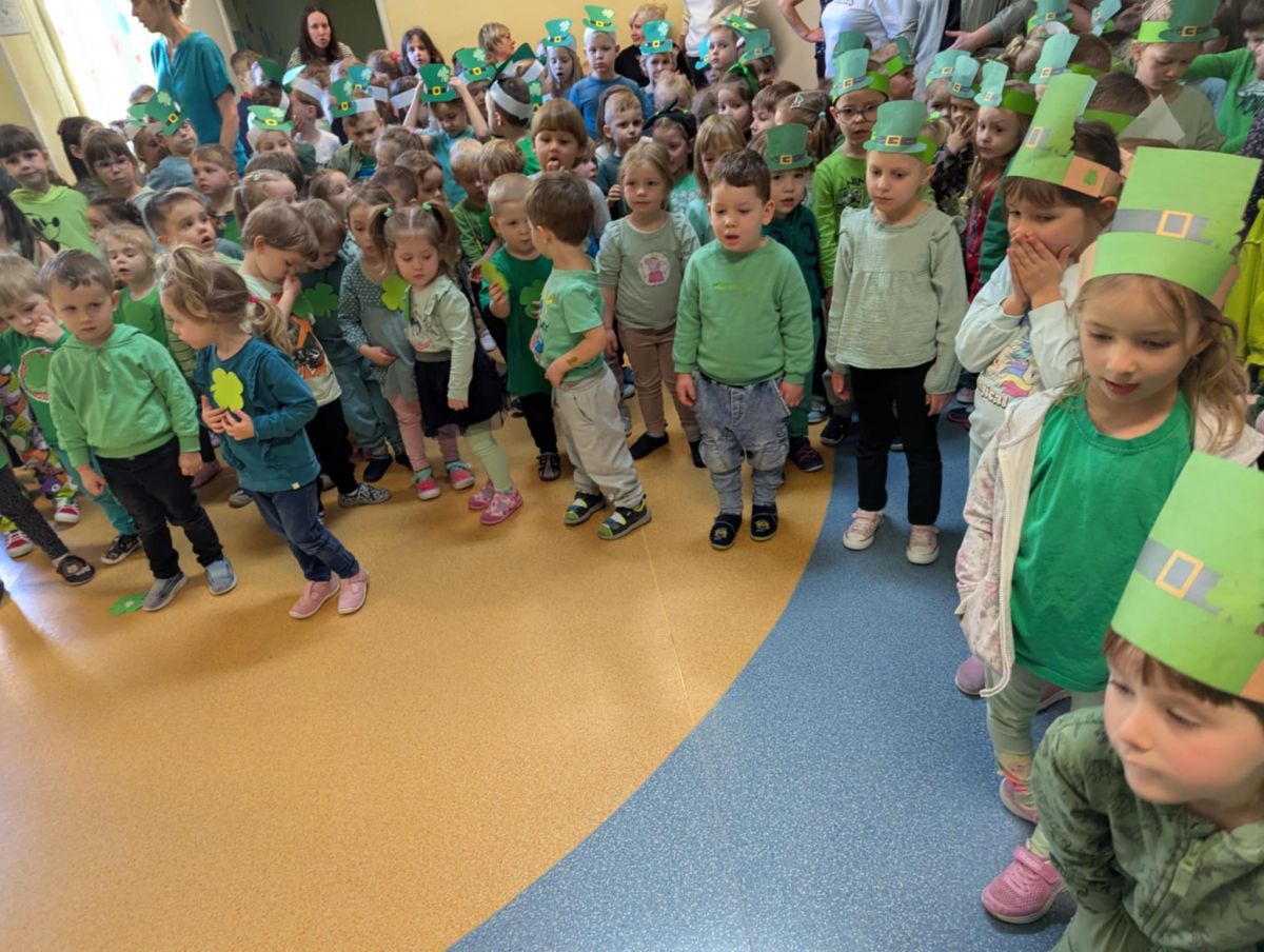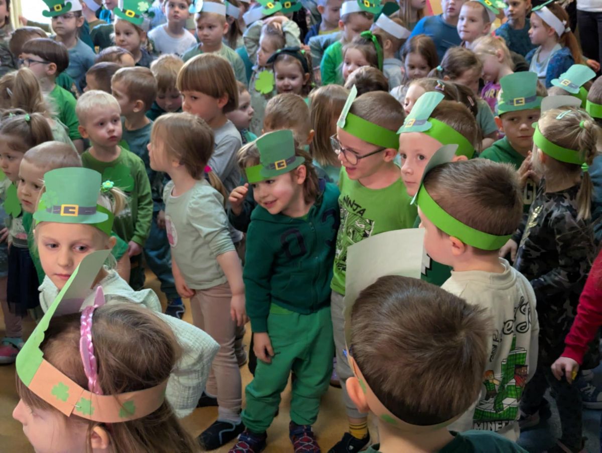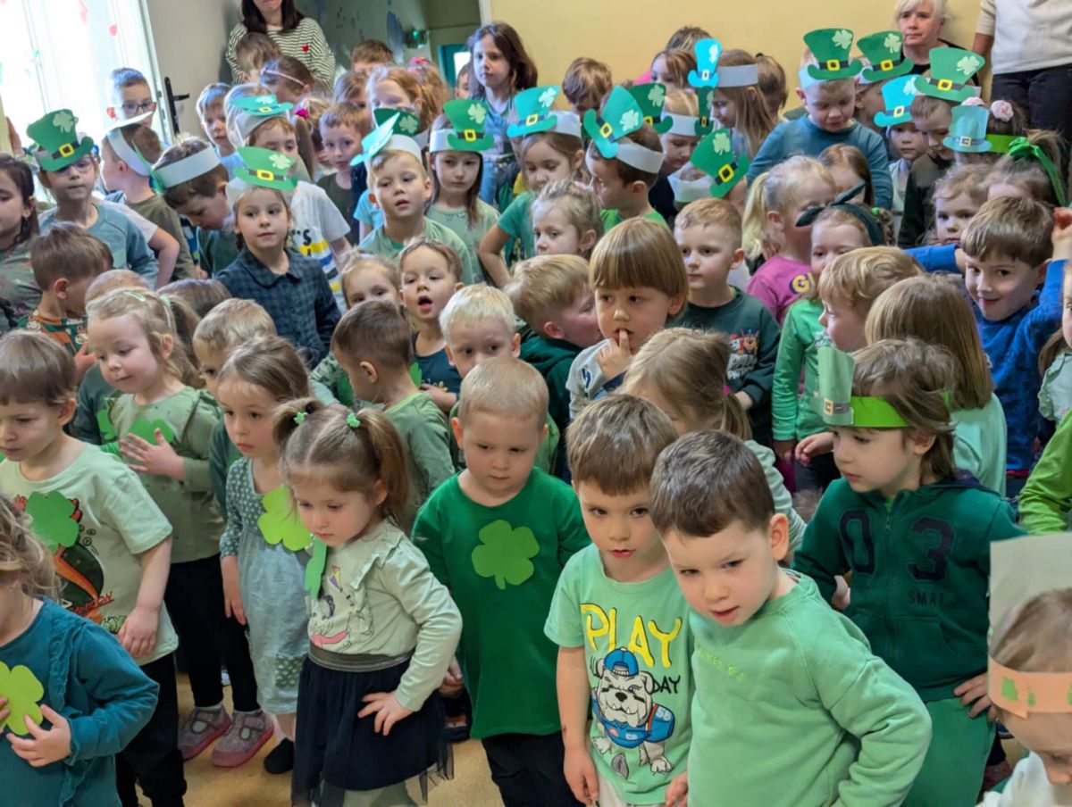 17 marca obchodziliśmy w przedszkolu Dzień Świętego Patryka. Z tej okazji wszystkie przedszkolaki przyszły ubrane w zielone barwy, aby wspólnie odtańczyć irlandzki taniec. Każda grupa przygotowała specjalne nakrycia głowy lub małe akcenty w ubiorze. Dzieci dowiedziały się kim był Św. Patryk oraz skrzat Leprechaun.