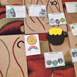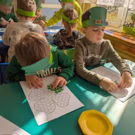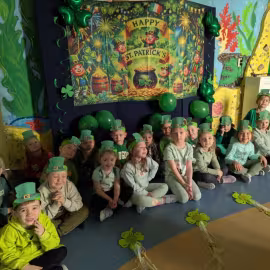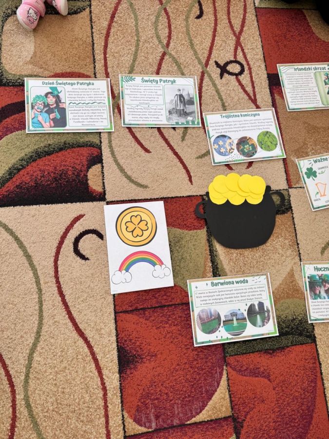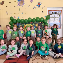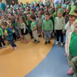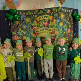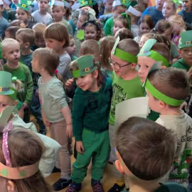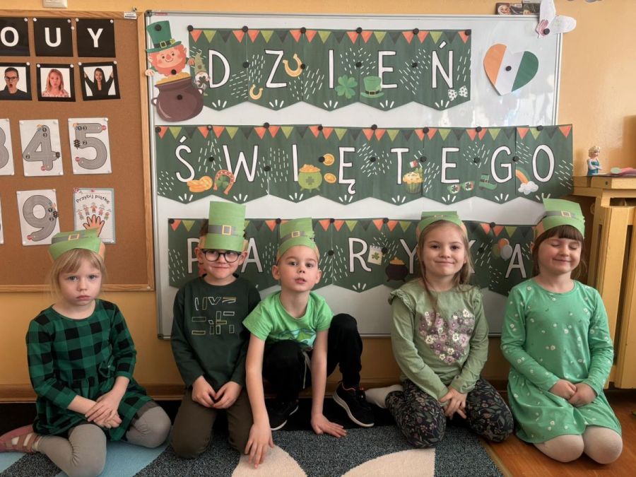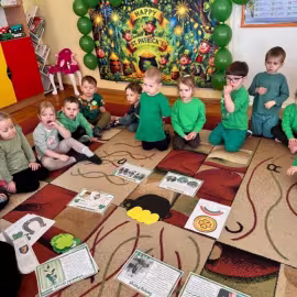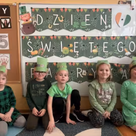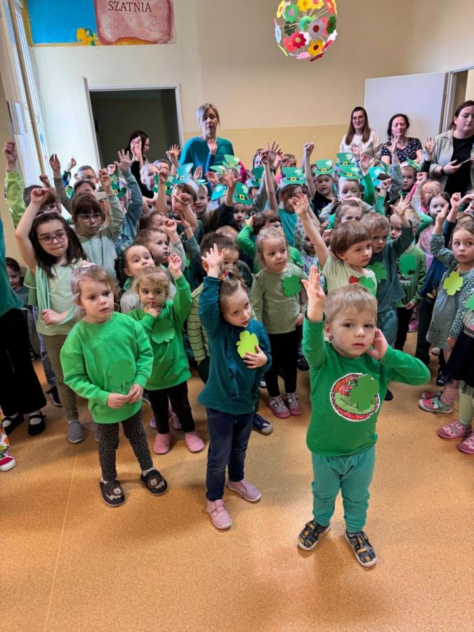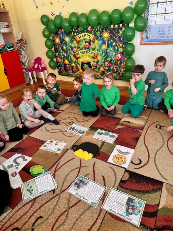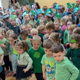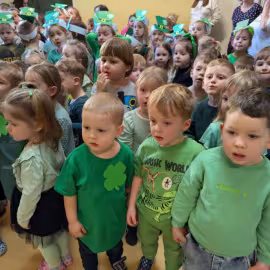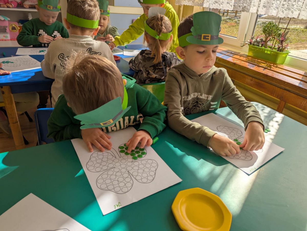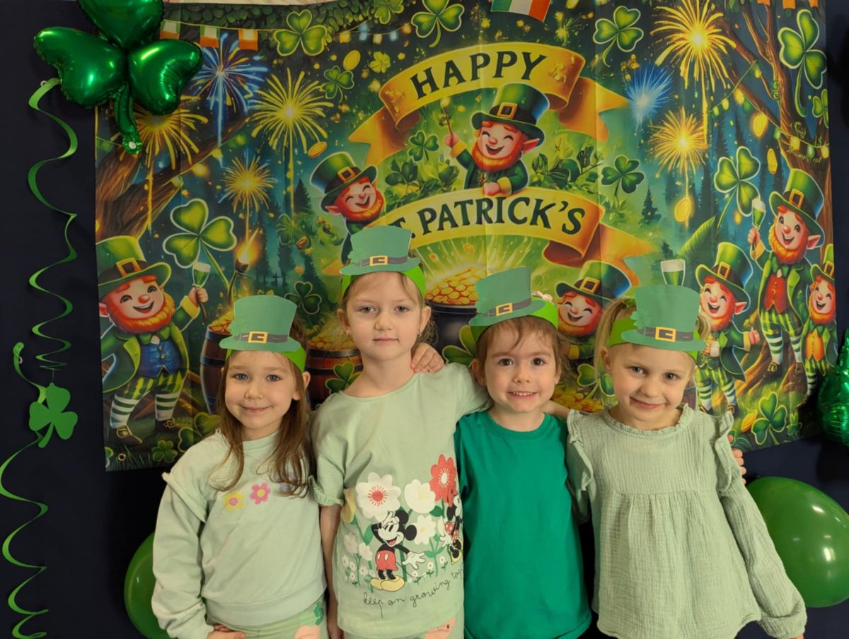17 marca obchodziliśmy w przedszkolu Dzień Świętego Patryka. Z tej okazji wszystkie przedszkolaki przyszły ubrane w zielone barwy, aby wspólnie odtańczyć irlandzki taniec. Każda grupa przygotowała specjalne nakrycia głowy lub małe akcenty w ubiorze. Dzieci dowiedziały się kim był Św. Patryk oraz skrzat Leprechaun.