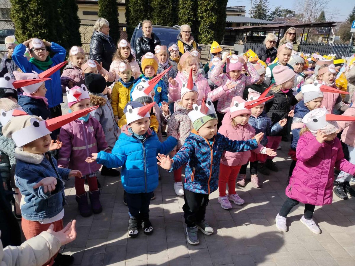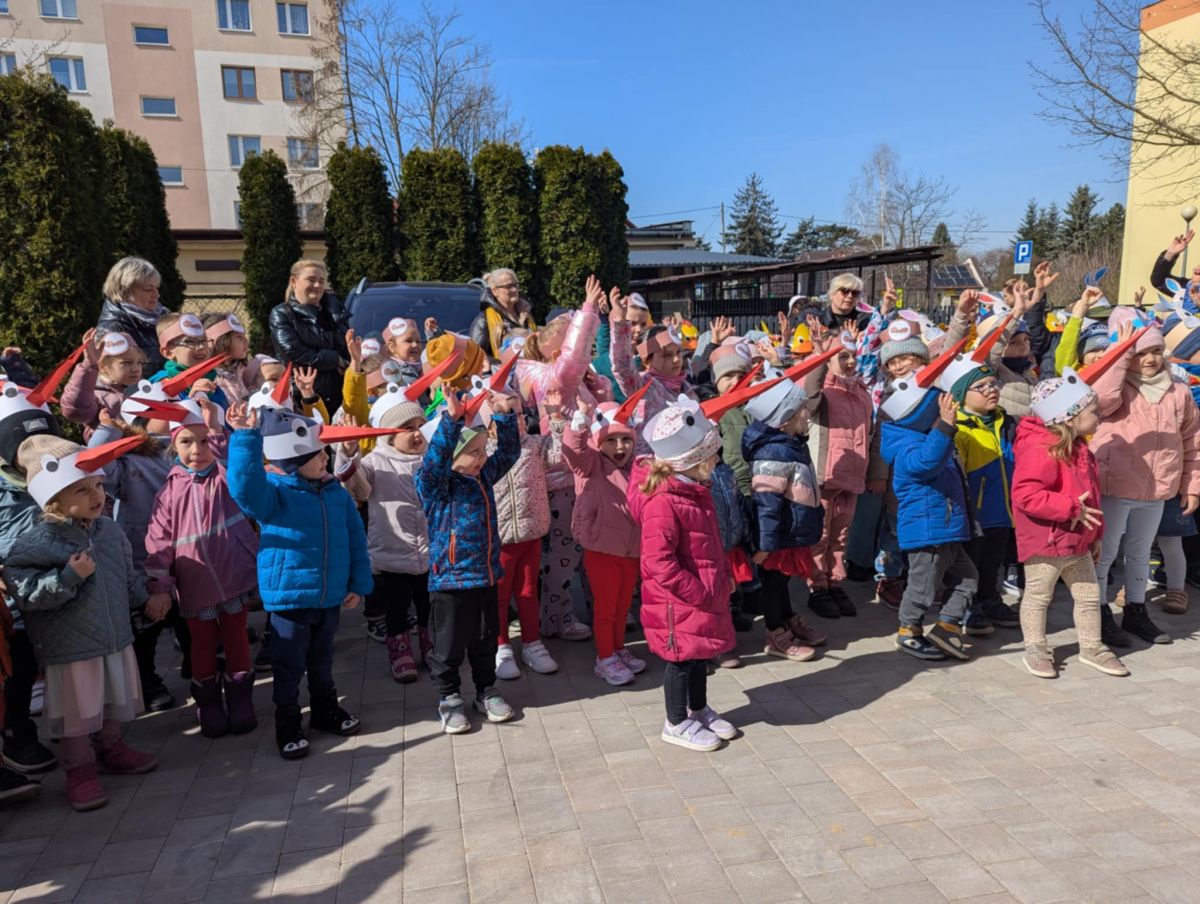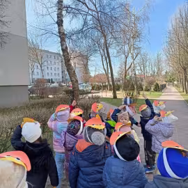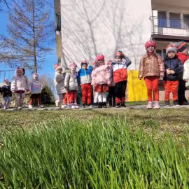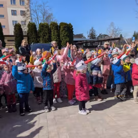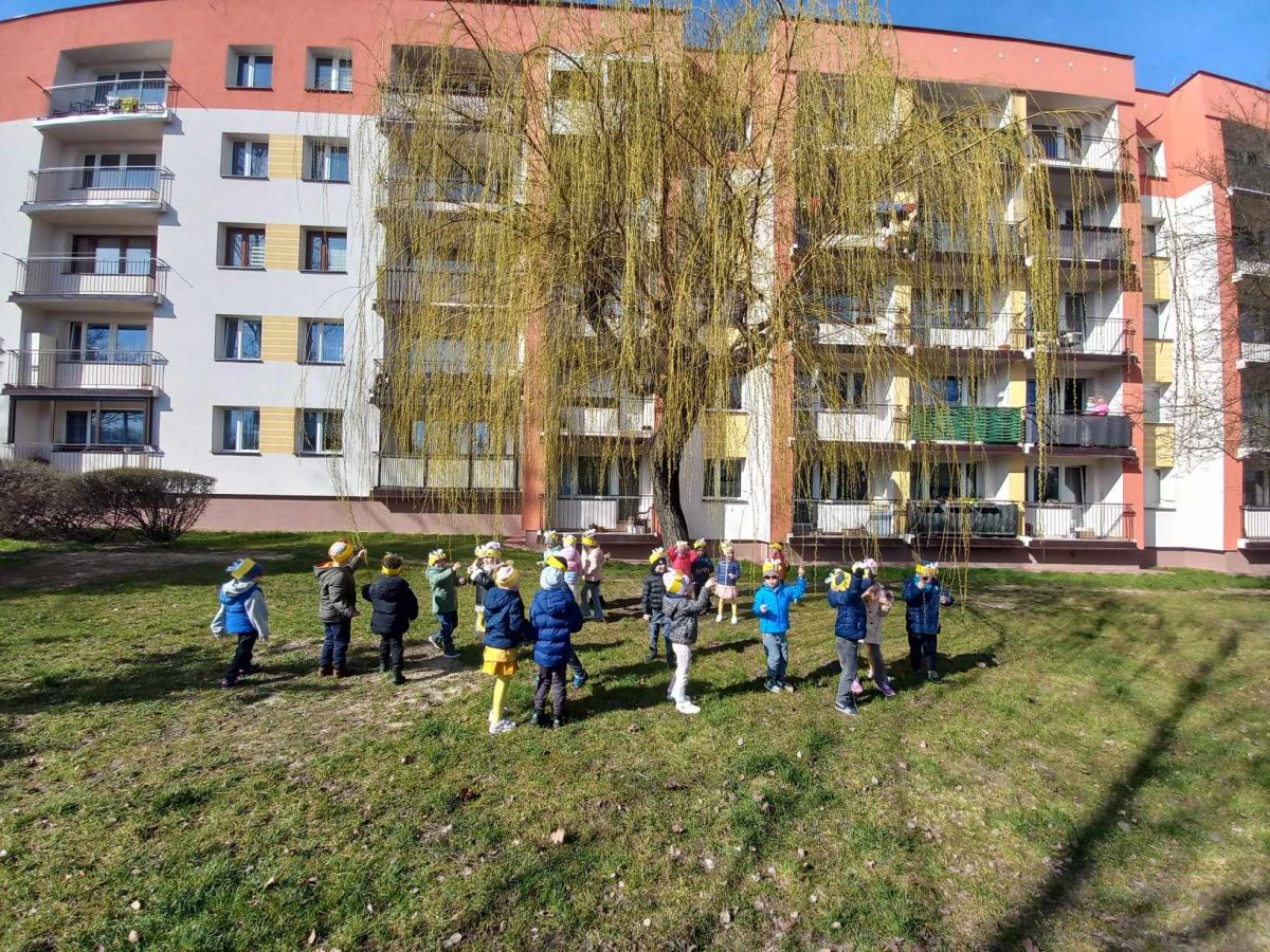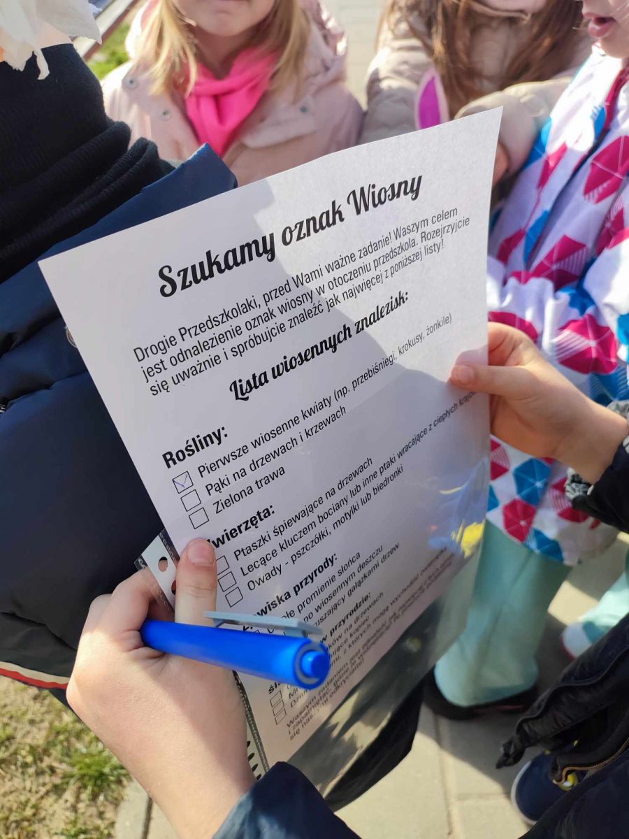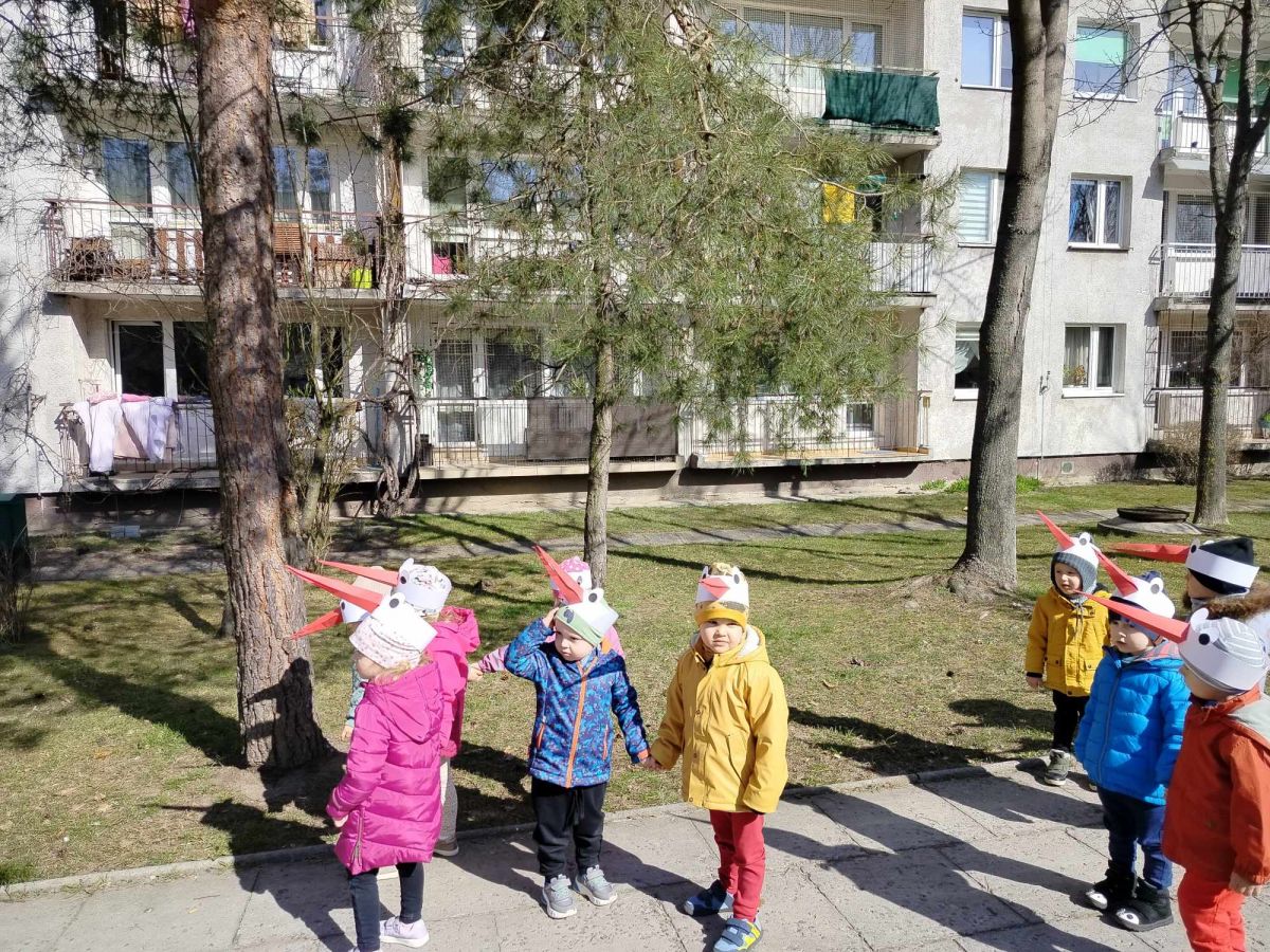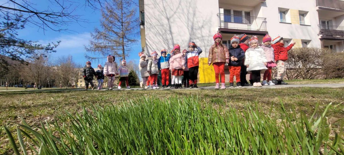 Cała nasza przedszkolna społeczność 21 marca ruszyła na wyprawę w poszukiwaniu WIOSNY. Dzieci w grupach otrzymały zadania, które odznaczały na specjalnej liście. Po wiosennej misji w terenie - uznaliśmy, że wszystkie znaki na ziemi i niebie świadczą o tym, że wiosna już jest z nami, więc przedszkolaki wesoło odśpiewały "wiosenny hymn".