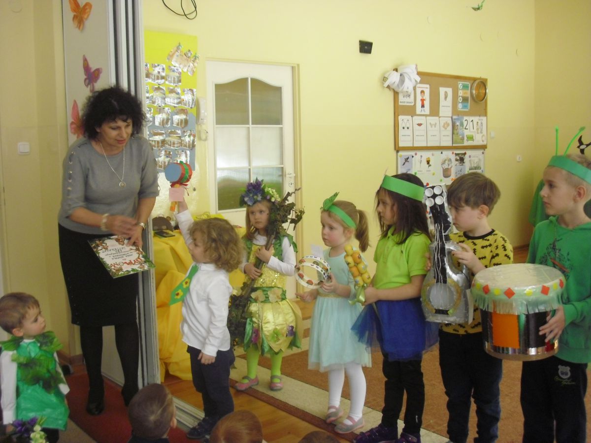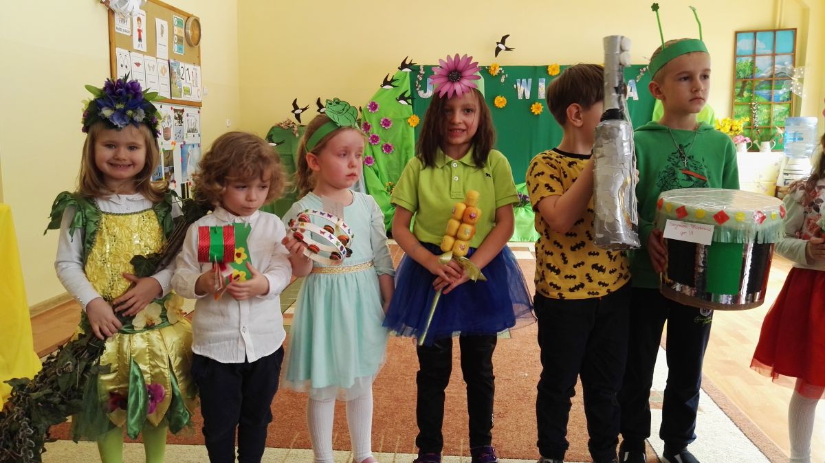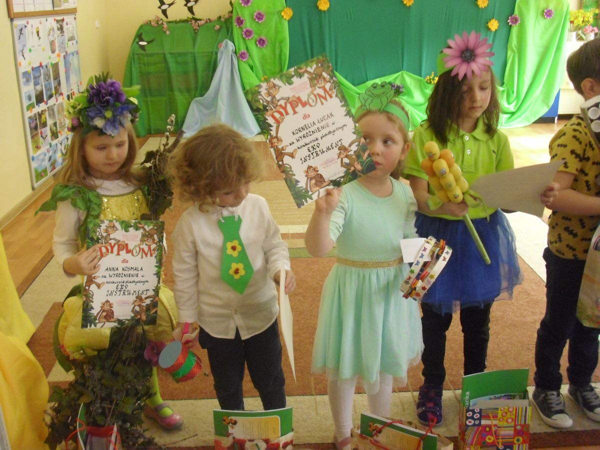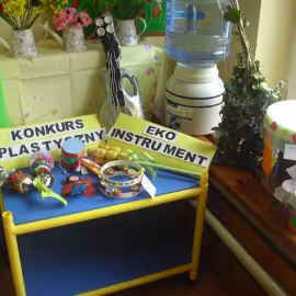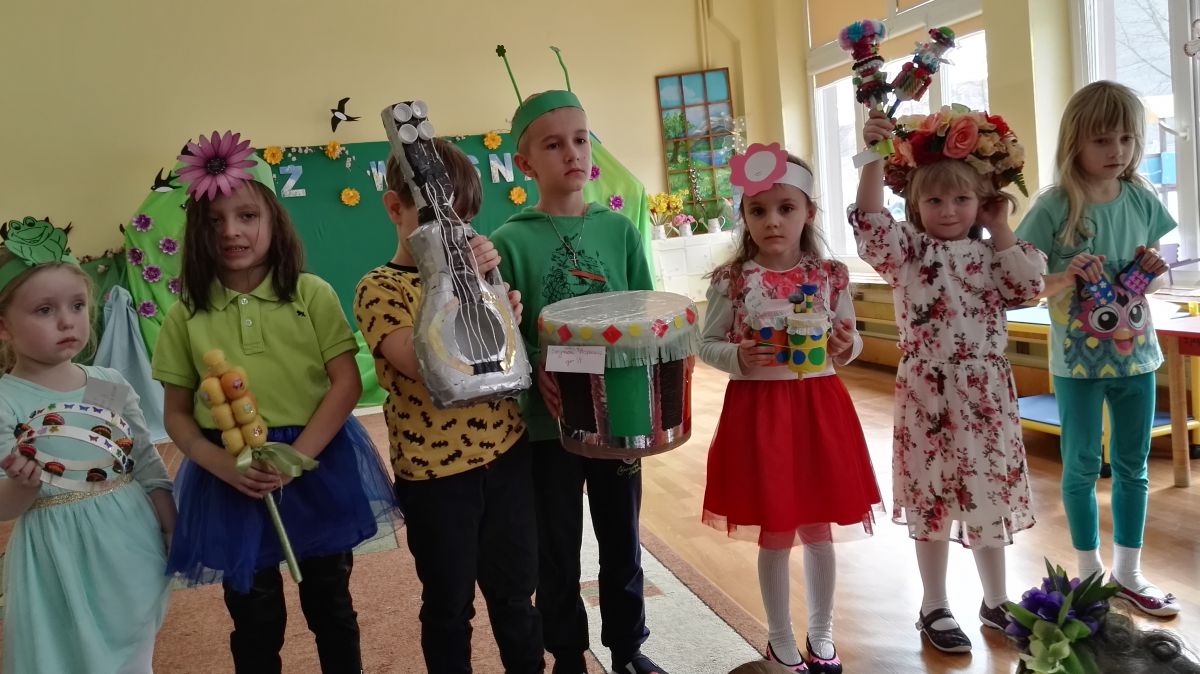 Podczas uroczystego powitania wiosny odbyło się rozstrzygnięcie konkursu plastycznego „Eko instrument”. Konkurs przeznaczony był dla dzieci uczęszczających do naszego przedszkola. Zadaniem konkursowym było wykonanie dowolną techniką plastyczną przestrzennego ekologicznego instrumentu. Każda grupa zgłosiła do konkursu 1 pracę wyłonioną spośród prac wykonanych w grupie.