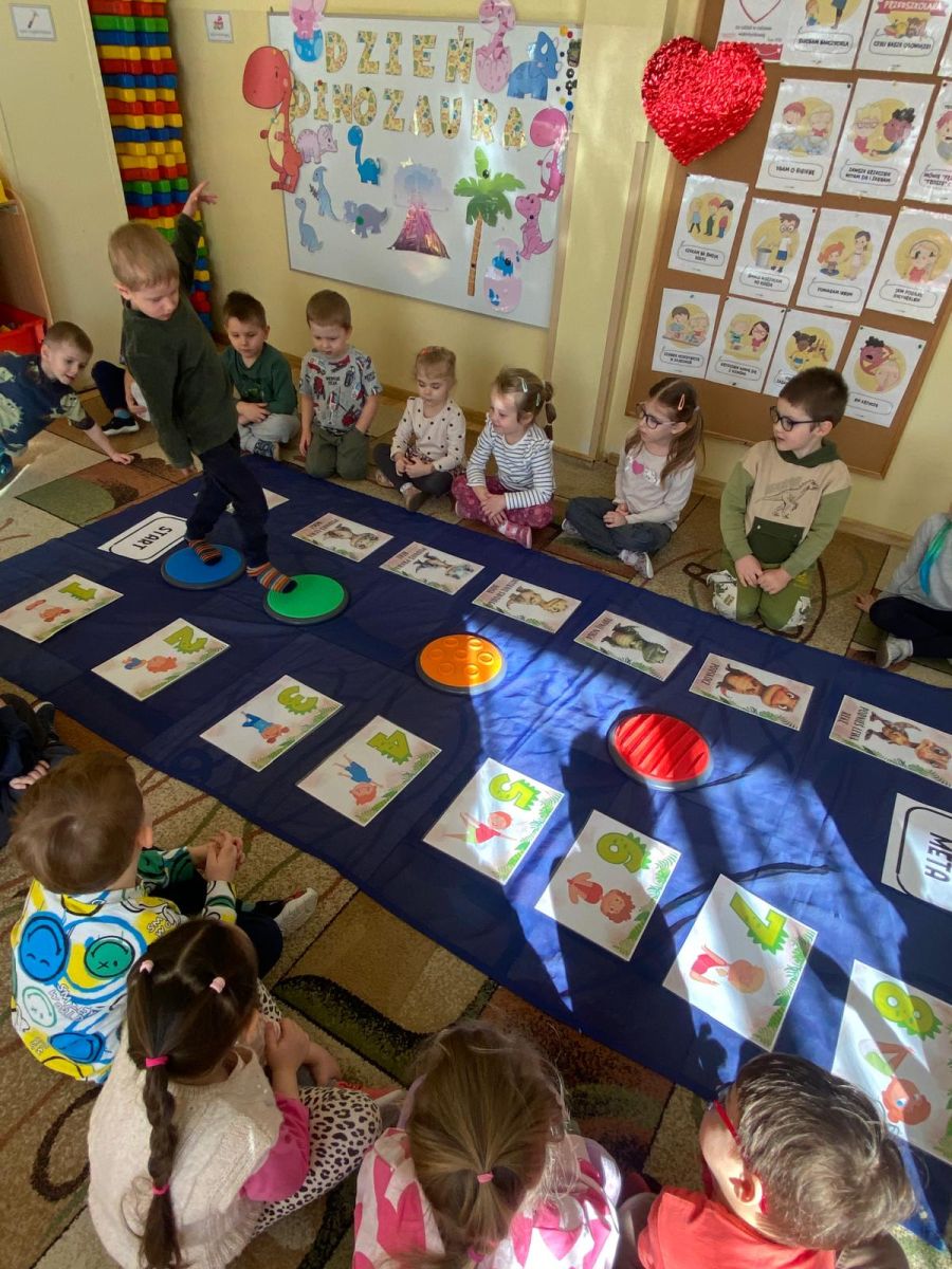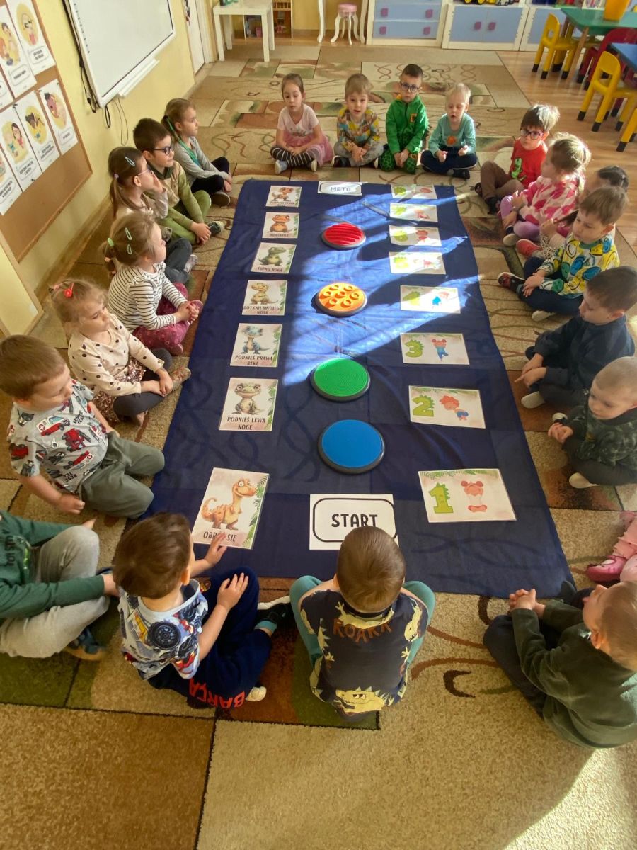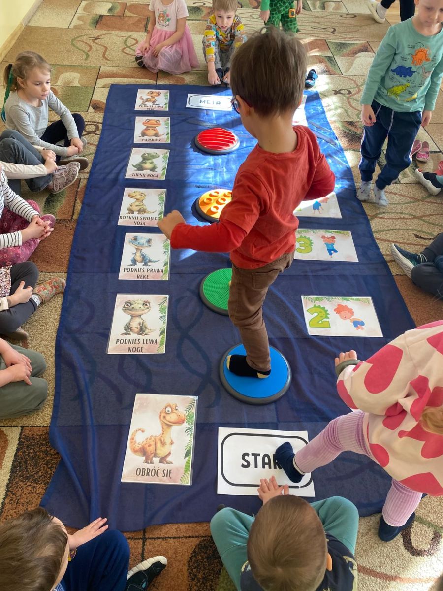 Z okazji Dnia Dinozaura dzieci odkrywały tajemnice dinozaurów poprzez różnorodne zabawy oraz liczne aktywności. Grupa „Tęczowe Rybki” bawiła się, przechodząc po kamieniach sensorycznych, ćwicząc równowagę i koordynację ruchową.
