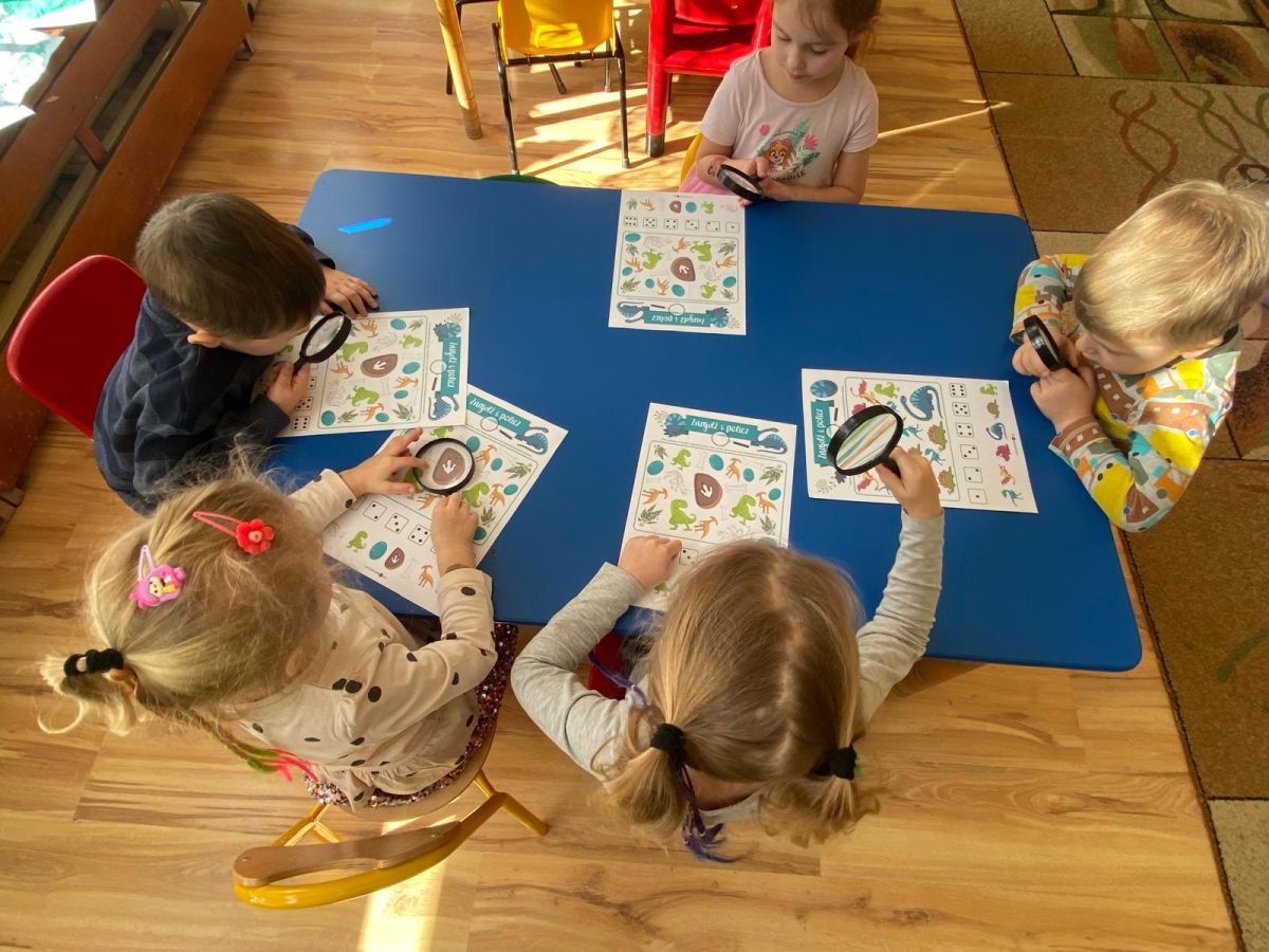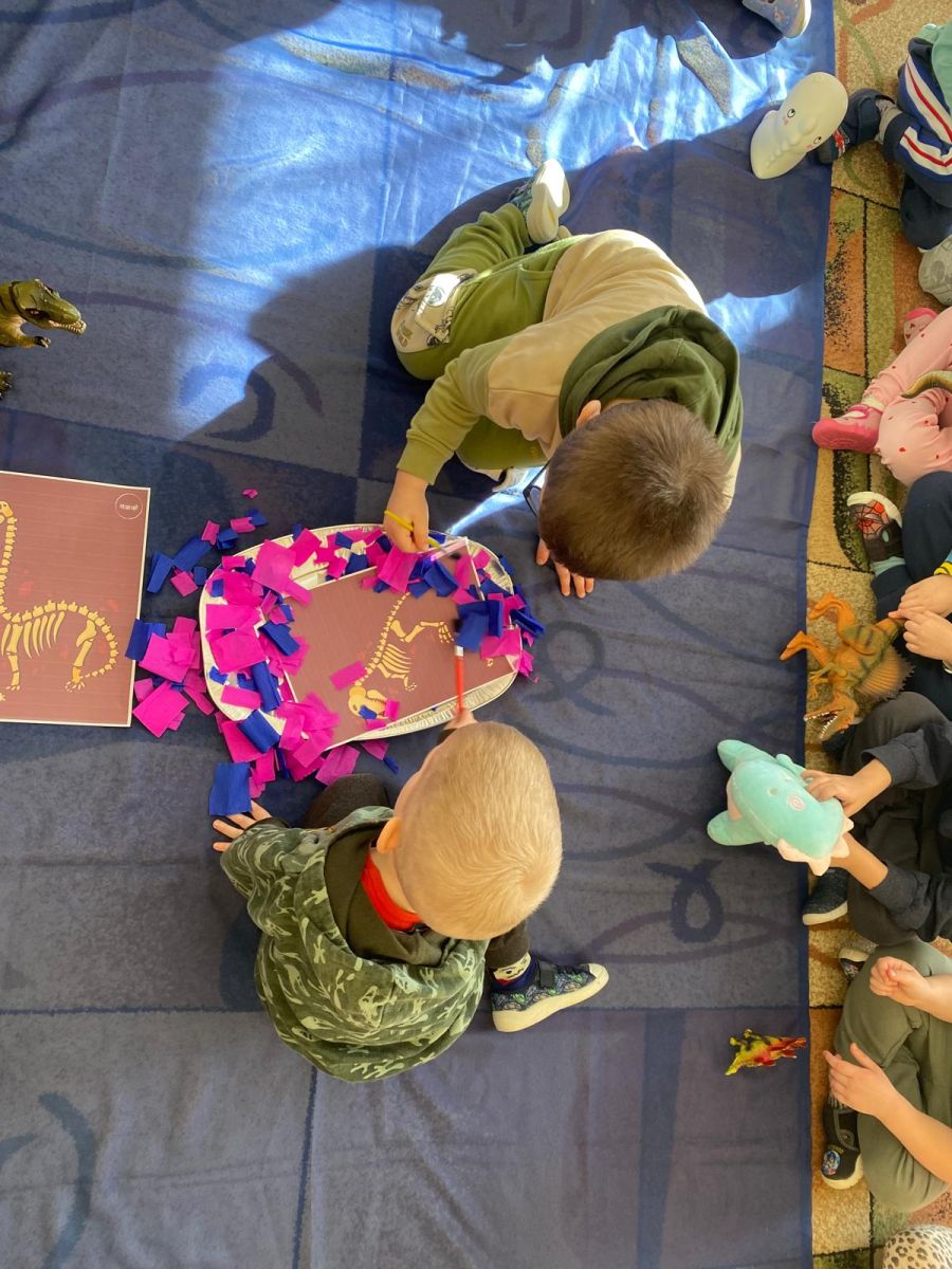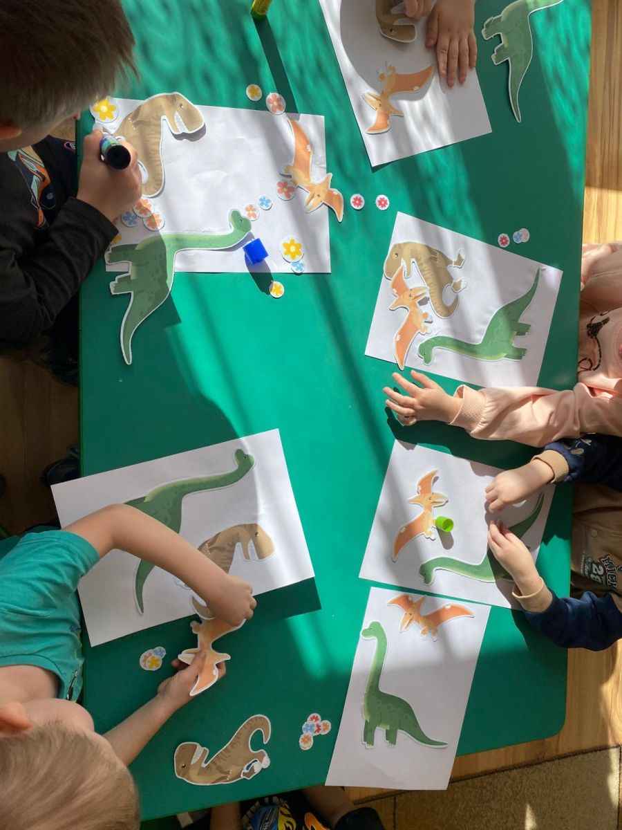Z okazji Dnia Dinozaura dzieci odkrywały tajemnice dinozaurów poprzez różnorodne zabawy oraz liczne aktywności. Grupa „Tęczowe Rybki” bawiła się, przechodząc po kamieniach sensorycznych, ćwicząc równowagę i koordynację ruchową.