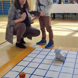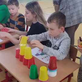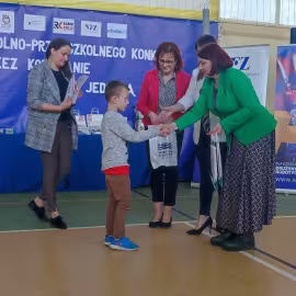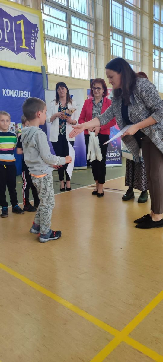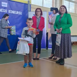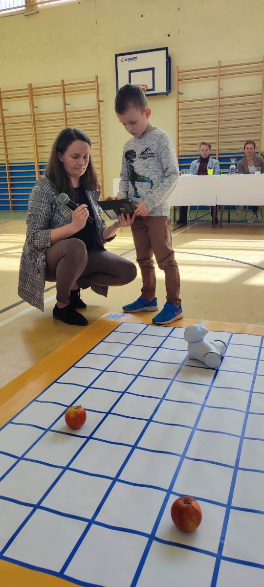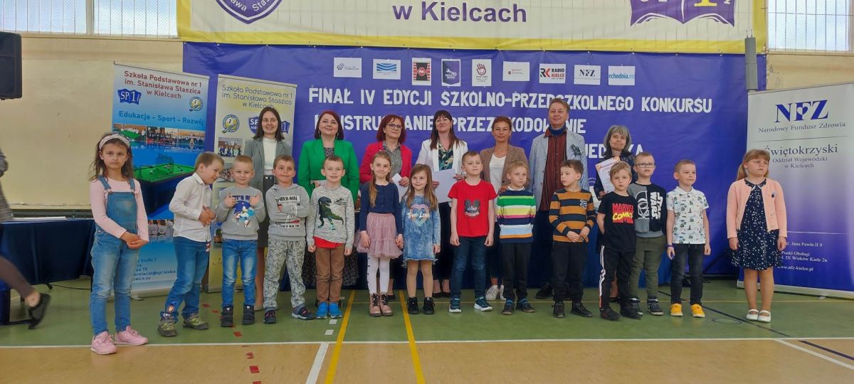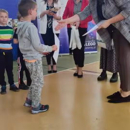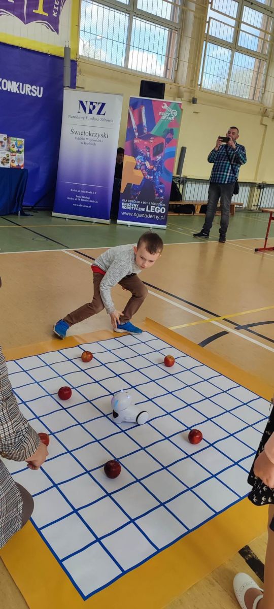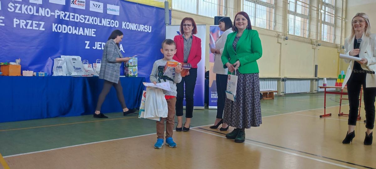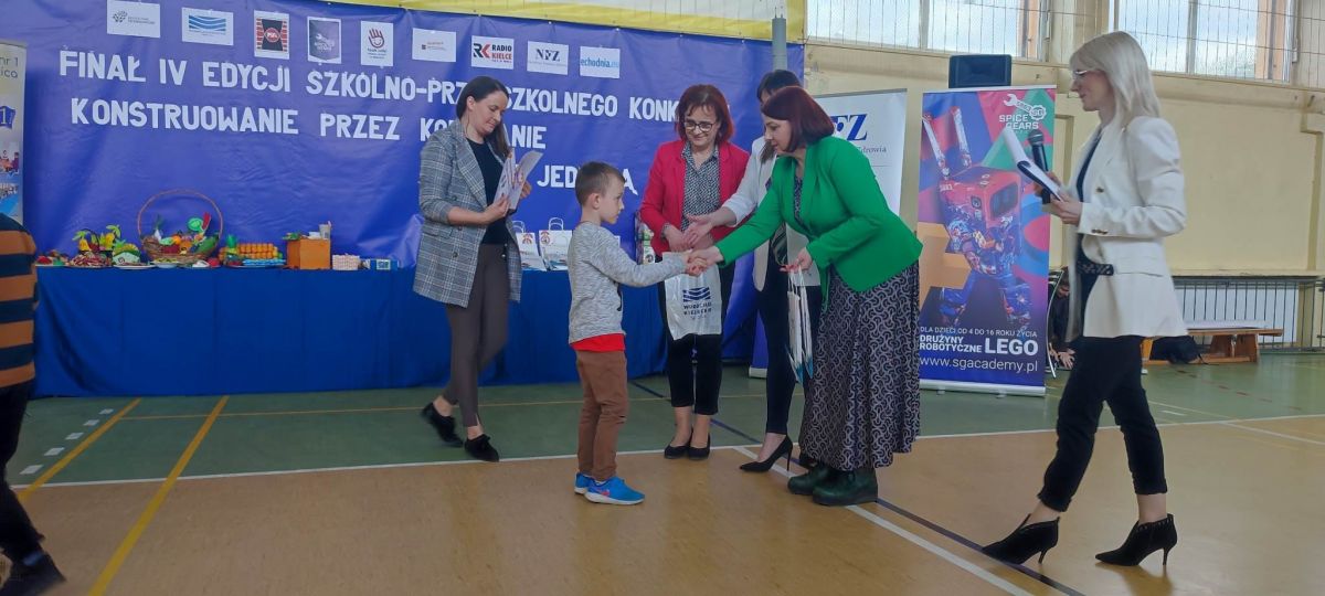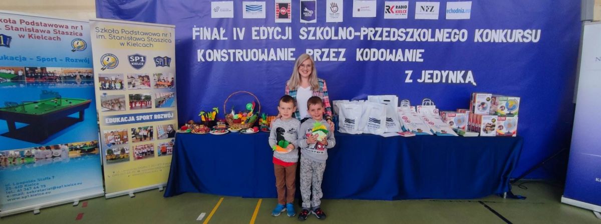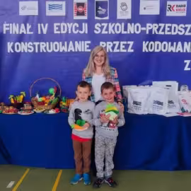 Dziś odbył się finał IV edycji Szkolno-Przedszkolnego Konkursu Techniczno-Informatycznego "Konstruowanie przez Kodowanie z Jedynką" organizowany przez Szkołę Podstawową nr 1 w Kielcach. Naszą placówkę reprezentowali Filip S. oraz Wojtek J. z grupy VII. Zadaniem konkursowym było skonstruowanie zdrowej przekąski na poprawę humoru. Chłopcy wykazali się ogromną wyobraźnią, jednak do finału Jury wybrało tylko pracę Filipka. Tutaj przed nim stanęły 3 zadania do wykonania - kodowanie drogi, programowanie robota do wyznaczonego miejsca oraz kodowanie za pomocą kubeczków. We wszystkich konkurencjach Filip poradził sobie wyśmienicie. Obaj chłopcy otrzymali wspaniałe nagrody, które pomogą w rozwijaniu ich zainteresowań.
