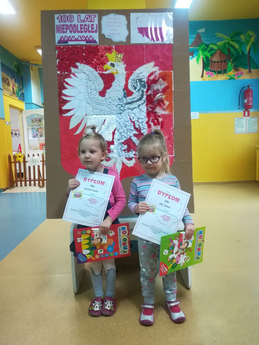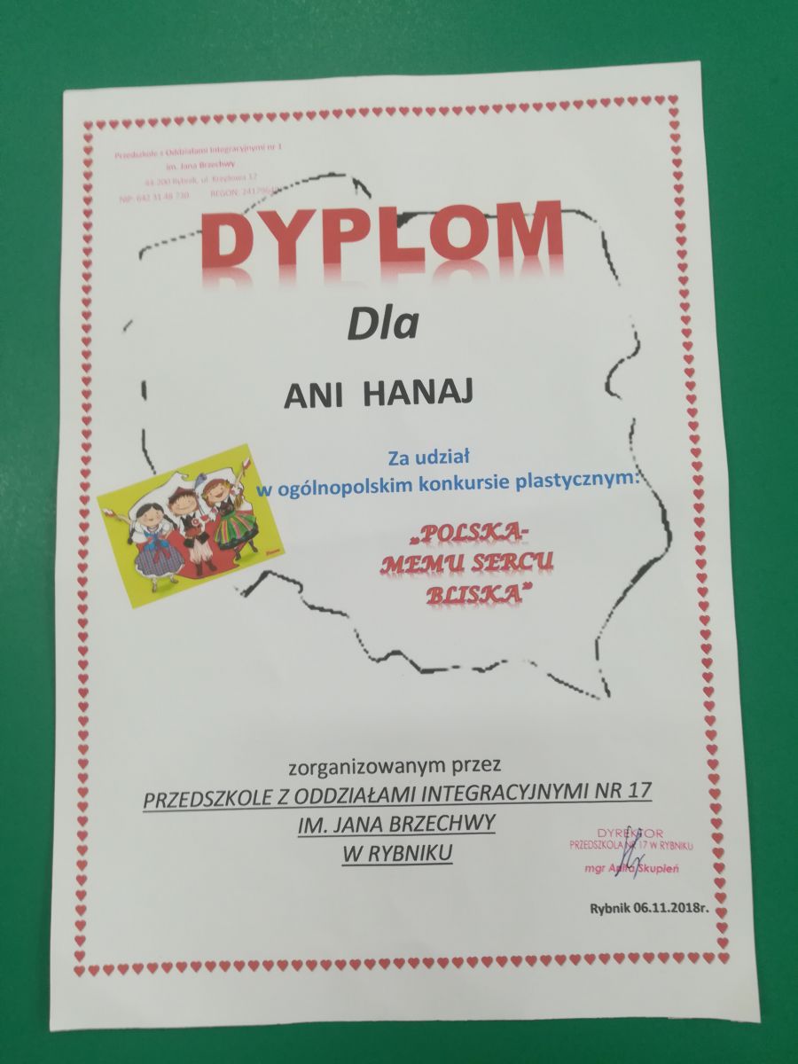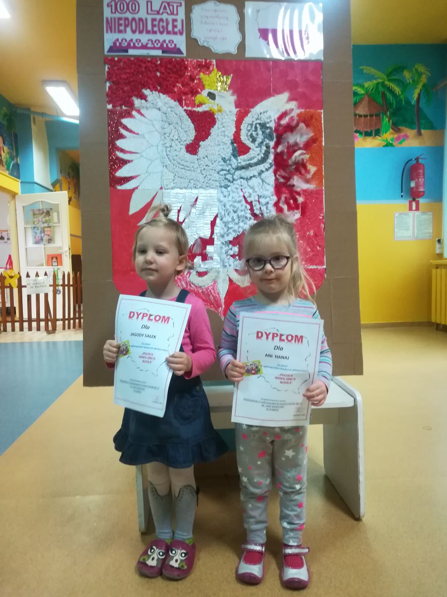 Ania Hanaj z grupy I „Papugi” i Jagoda Sałek z grupy III „Poszukiwacze skarbów” jako reprezentantki maluszków z naszego przedszkola po raz pierwszy wzięły udział w Ogólnopolskim Konkursie Plastycznym pt. „Polska memu sercu bliska” organizowanym przez Przedszkole z Oddziałami Integracyjnymi nr 17 w Rybniku. Celem konkursu było kształtowanie uczuć patriotycznych i uwrażliwienie na piękno naszej Ojczyzny. Wykonując swoje prace plastyczne dziewczynki wykazały się dużą wyobraźnią i kreatywnością.