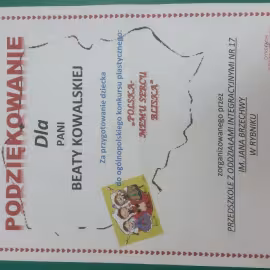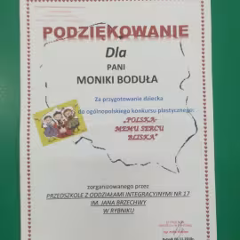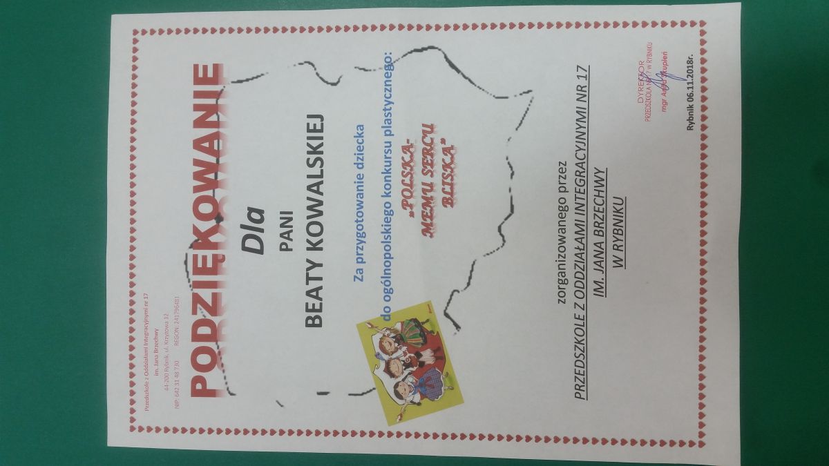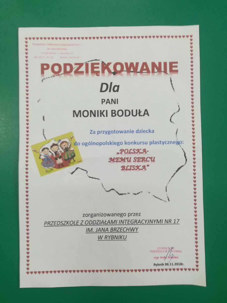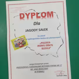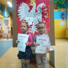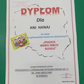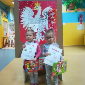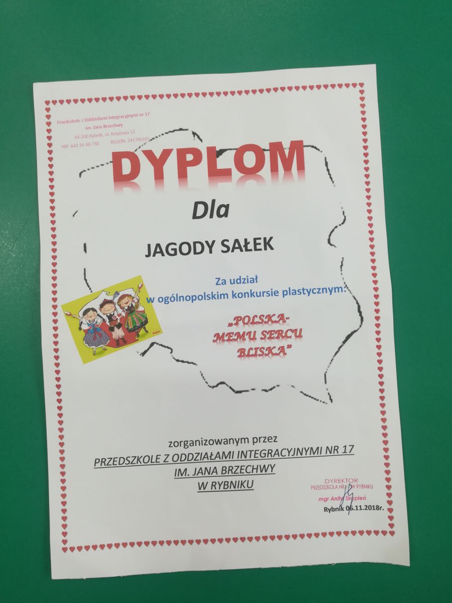 Ania Hanaj z grupy I „Papugi” i Jagoda Sałek z grupy III „Poszukiwacze skarbów” jako reprezentantki maluszków z naszego przedszkola po raz pierwszy wzięły udział w Ogólnopolskim Konkursie Plastycznym pt. „Polska memu sercu bliska” organizowanym przez Przedszkole z Oddziałami Integracyjnymi nr 17 w Rybniku. Celem konkursu było kształtowanie uczuć patriotycznych i uwrażliwienie na piękno naszej Ojczyzny. Wykonując swoje prace plastyczne dziewczynki wykazały się dużą wyobraźnią i kreatywnością.