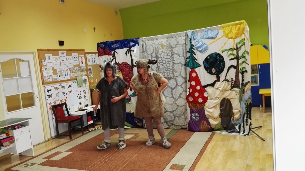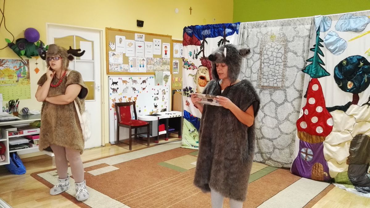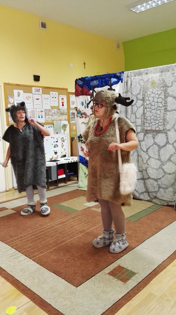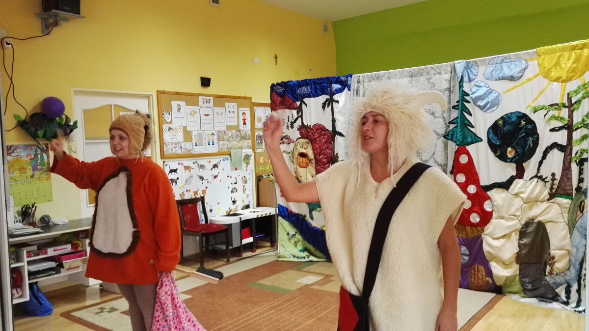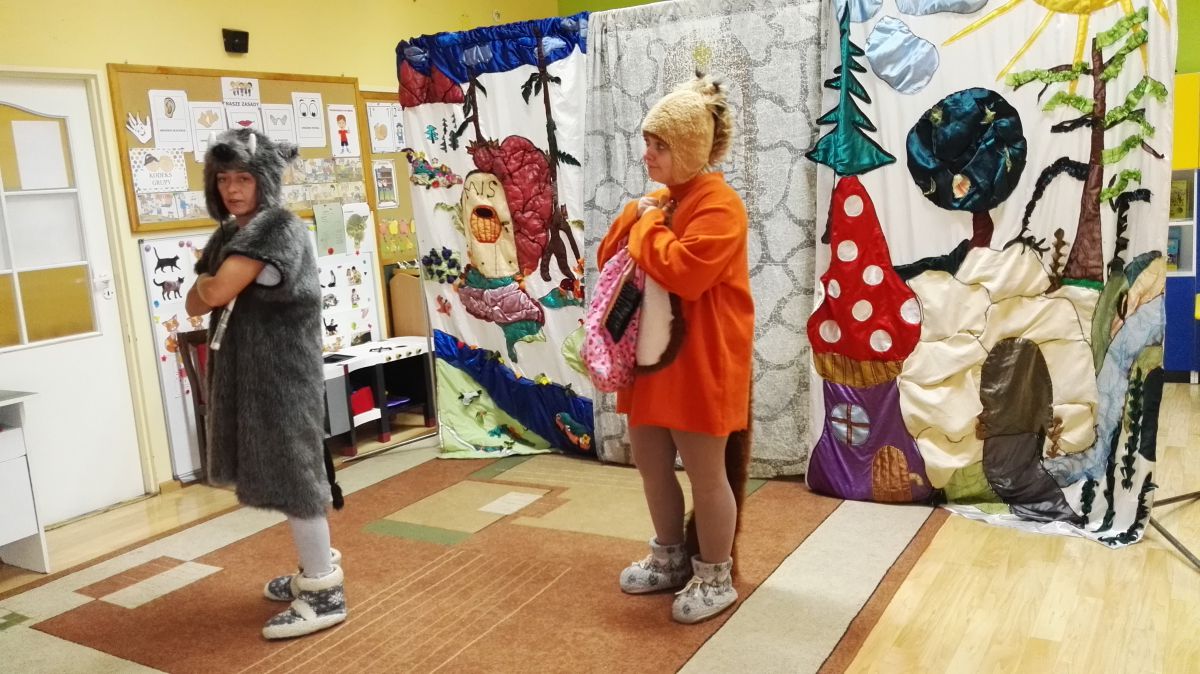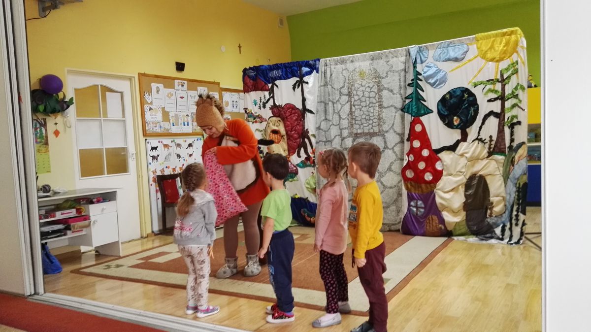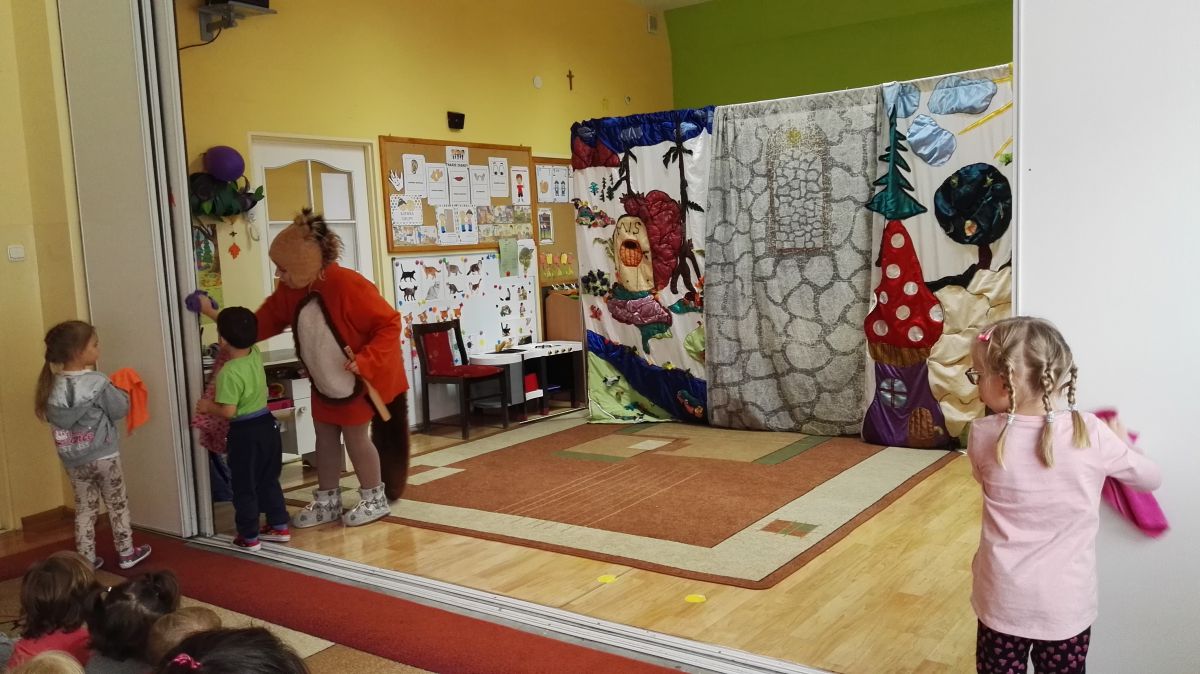 W październiku nasze przedszkole odwiedzili aktorzy Agencji Artystycznej „Kanon” z Krakowa. Dzieci obejrzały z ich udziałem teatrzyk: „Jesień na polanie”. Spotkanie przybliżyło dzieciom wiadomości o sposobach przygotowania się zwierząt do zimy. Przesłaniem sztuki była nauka systematyczności, odpowiedzialności i niesienia pomocy. Wesołe teksty, taniec i włączenie dzieci do wspólnej zabawy sprawiło, że przedszkolaki z zainteresowaniem śledziły losy głównych bohaterów: dzika, wiewiórki, łosia oraz koziołka.