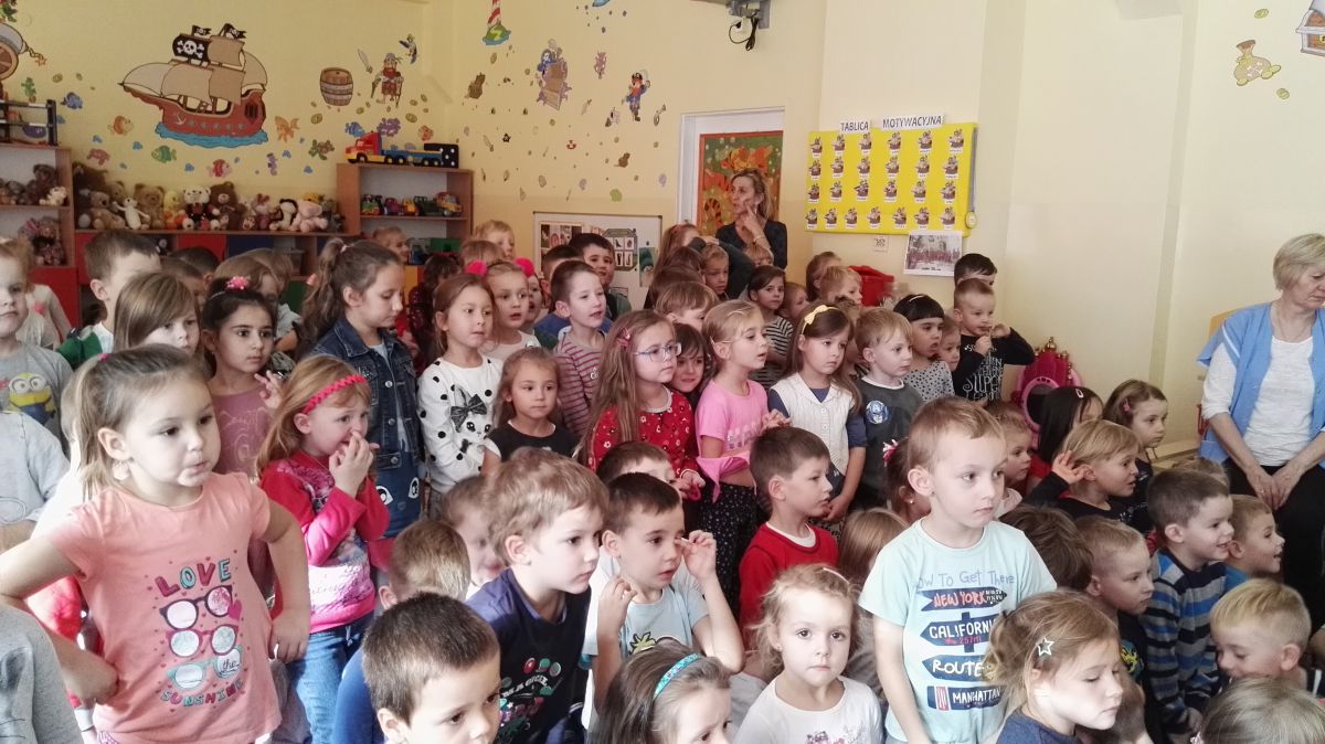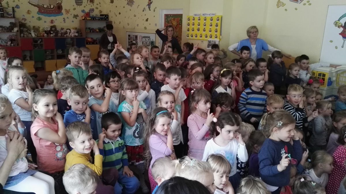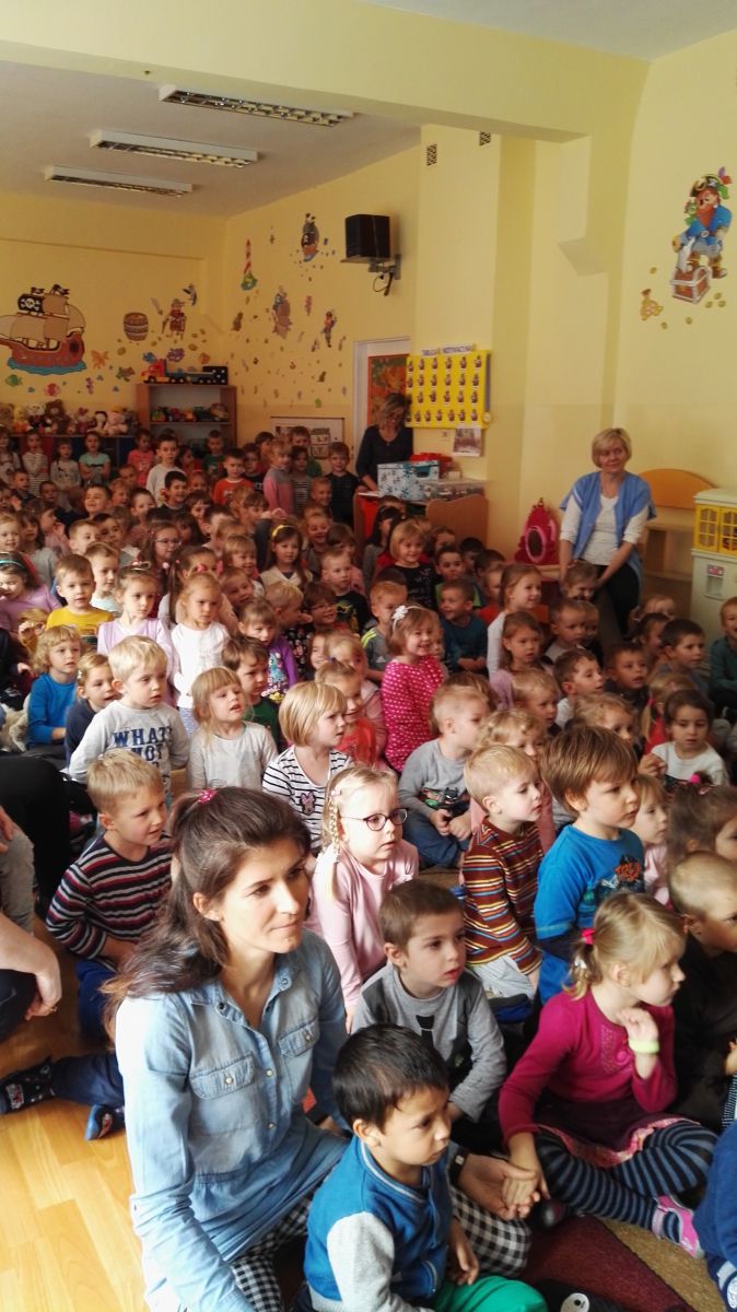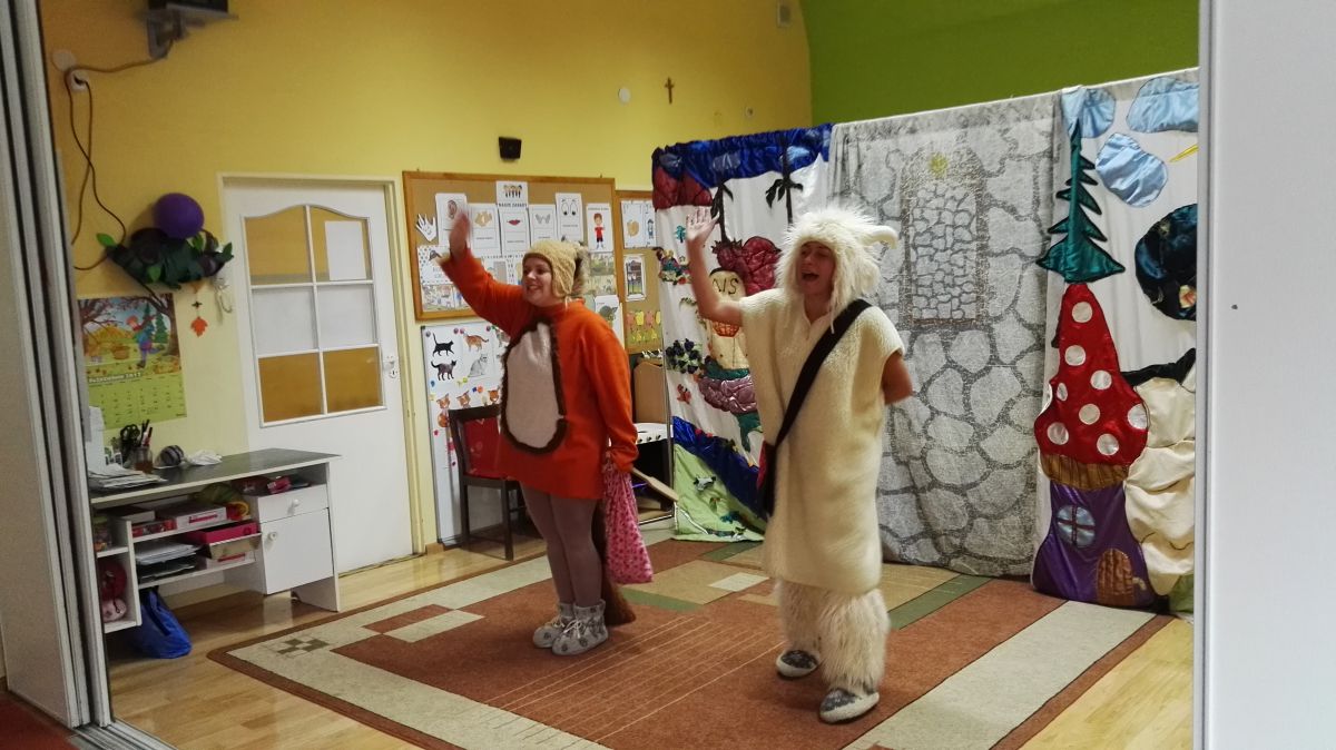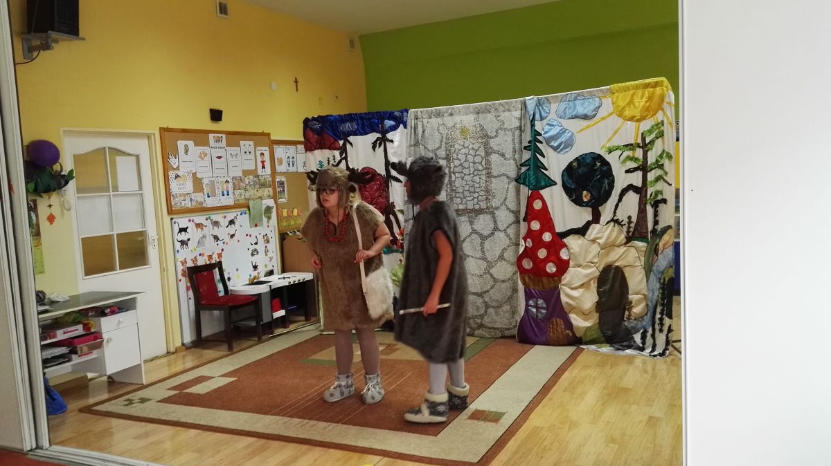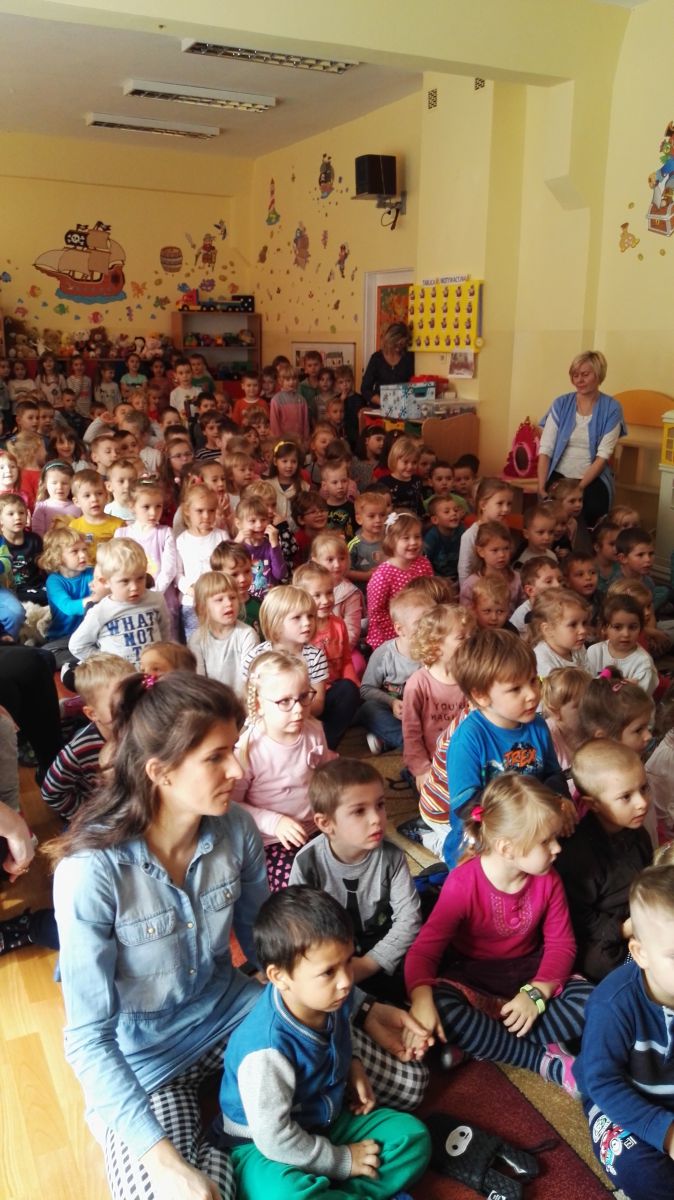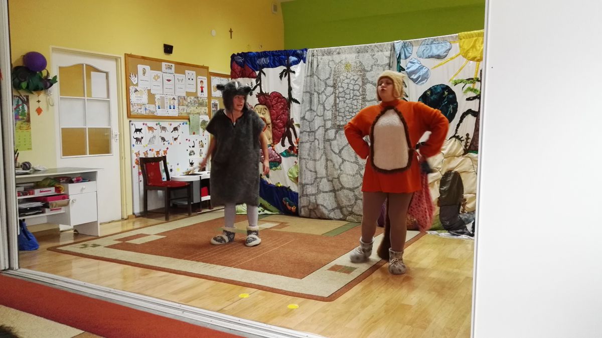 W październiku nasze przedszkole odwiedzili aktorzy Agencji Artystycznej „Kanon” z Krakowa. Dzieci obejrzały z ich udziałem teatrzyk: „Jesień na polanie”. Spotkanie przybliżyło dzieciom wiadomości o sposobach przygotowania się zwierząt do zimy. Przesłaniem sztuki była nauka systematyczności, odpowiedzialności i niesienia pomocy. Wesołe teksty, taniec i włączenie dzieci do wspólnej zabawy sprawiło, że przedszkolaki z zainteresowaniem śledziły losy głównych bohaterów: dzika, wiewiórki, łosia oraz koziołka.