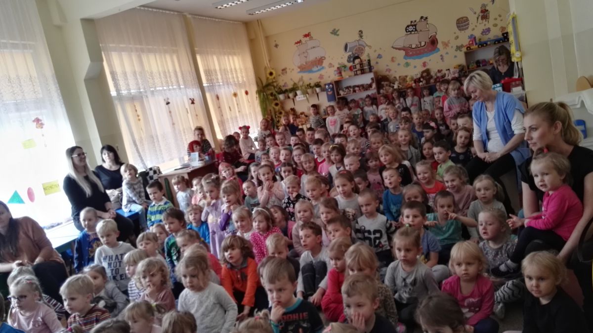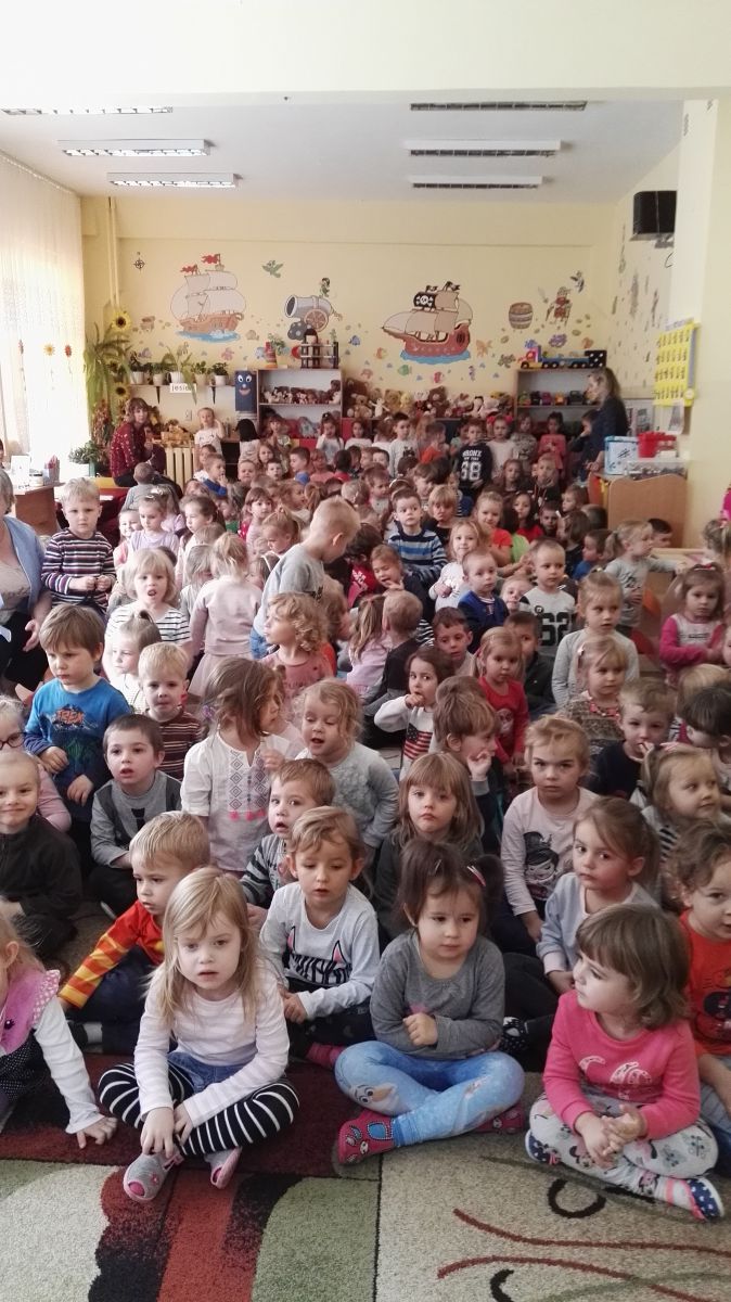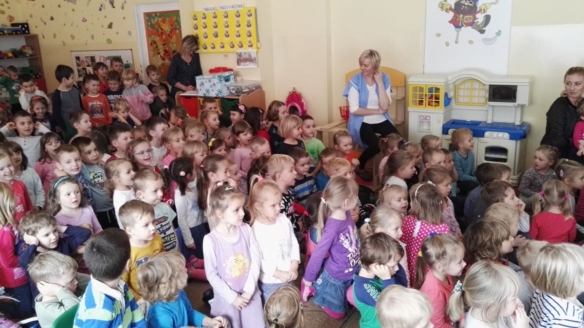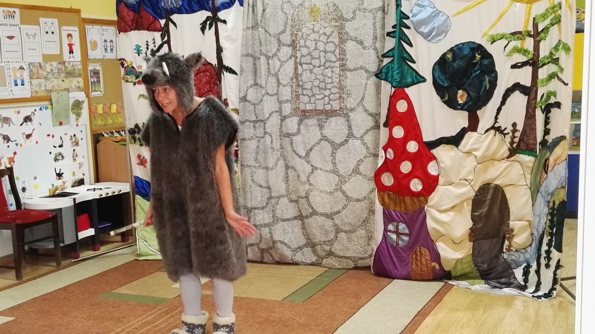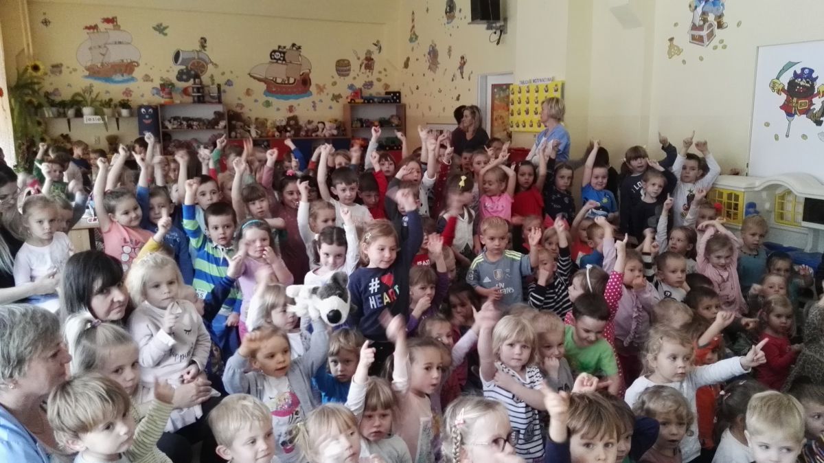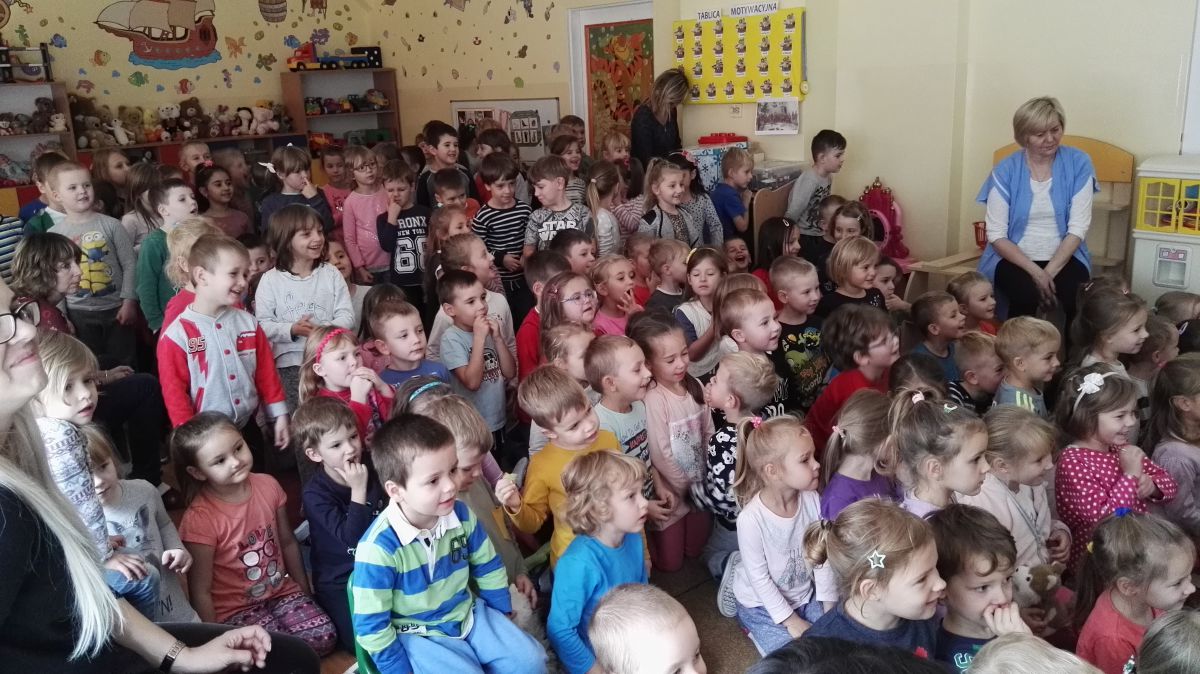 W październiku nasze przedszkole odwiedzili aktorzy Agencji Artystycznej „Kanon” z Krakowa. Dzieci obejrzały z ich udziałem teatrzyk: „Jesień na polanie”. Spotkanie przybliżyło dzieciom wiadomości o sposobach przygotowania się zwierząt do zimy. Przesłaniem sztuki była nauka systematyczności, odpowiedzialności i niesienia pomocy. Wesołe teksty, taniec i włączenie dzieci do wspólnej zabawy sprawiło, że przedszkolaki z zainteresowaniem śledziły losy głównych bohaterów: dzika, wiewiórki, łosia oraz koziołka.