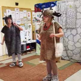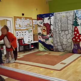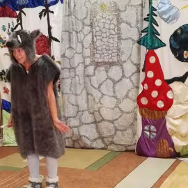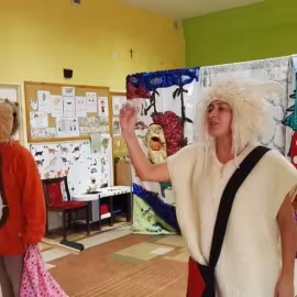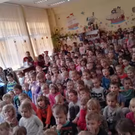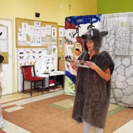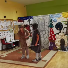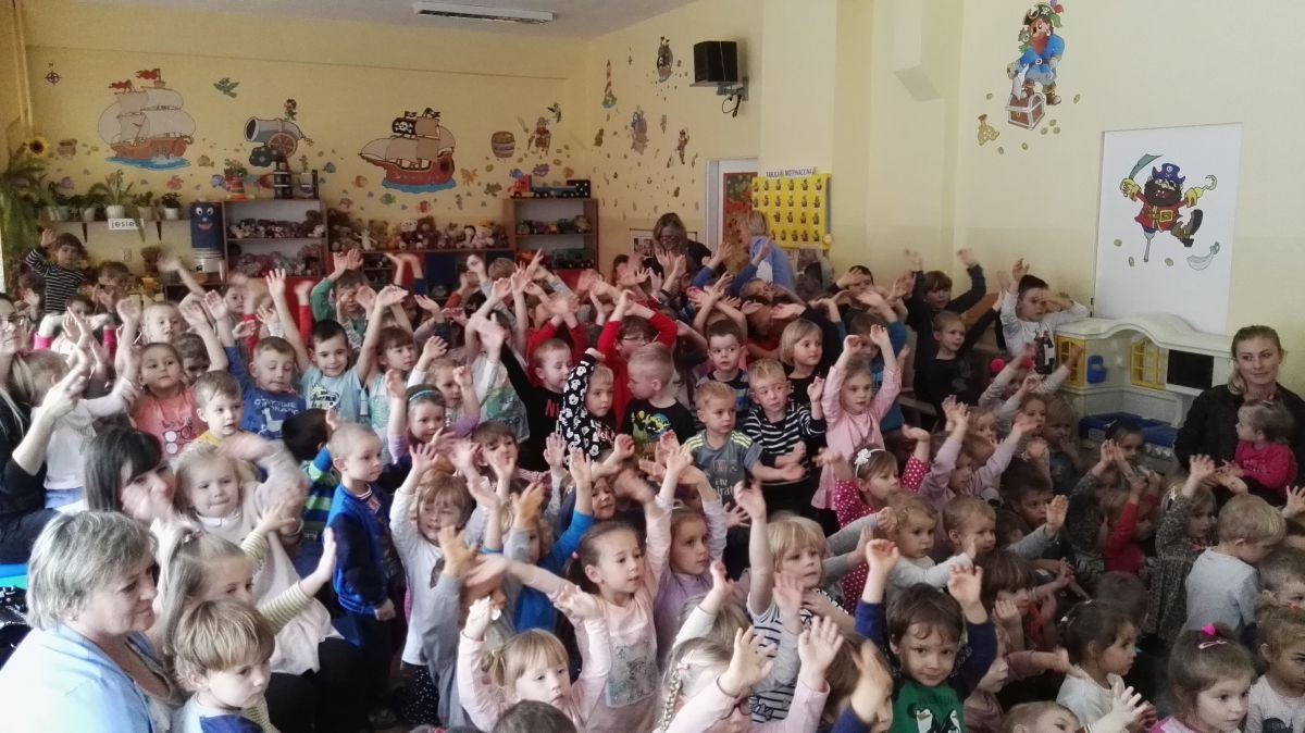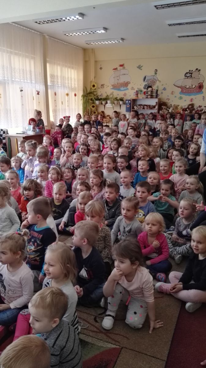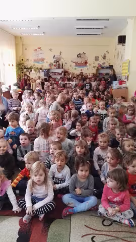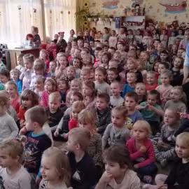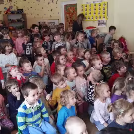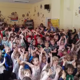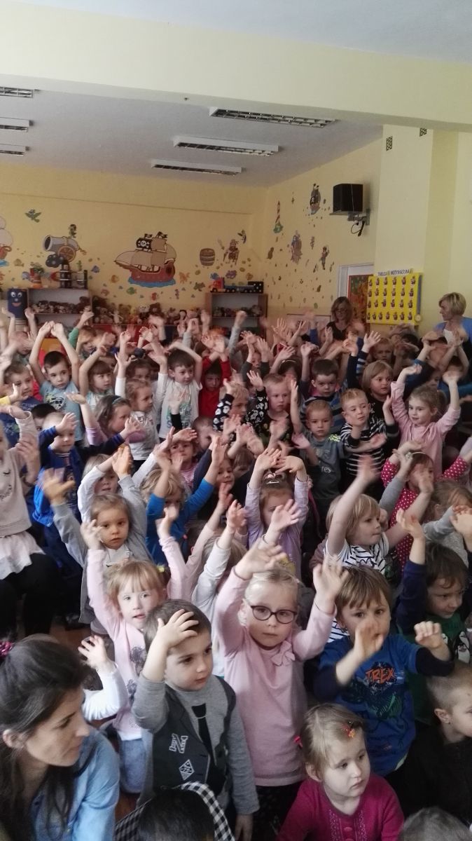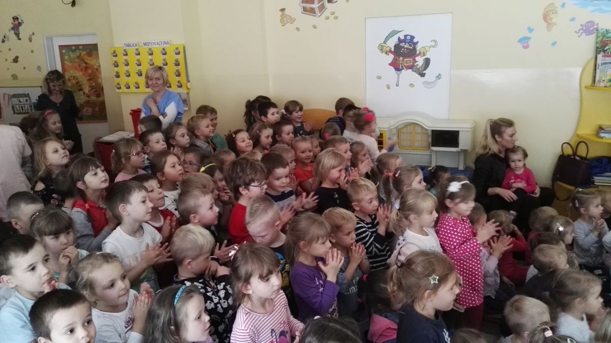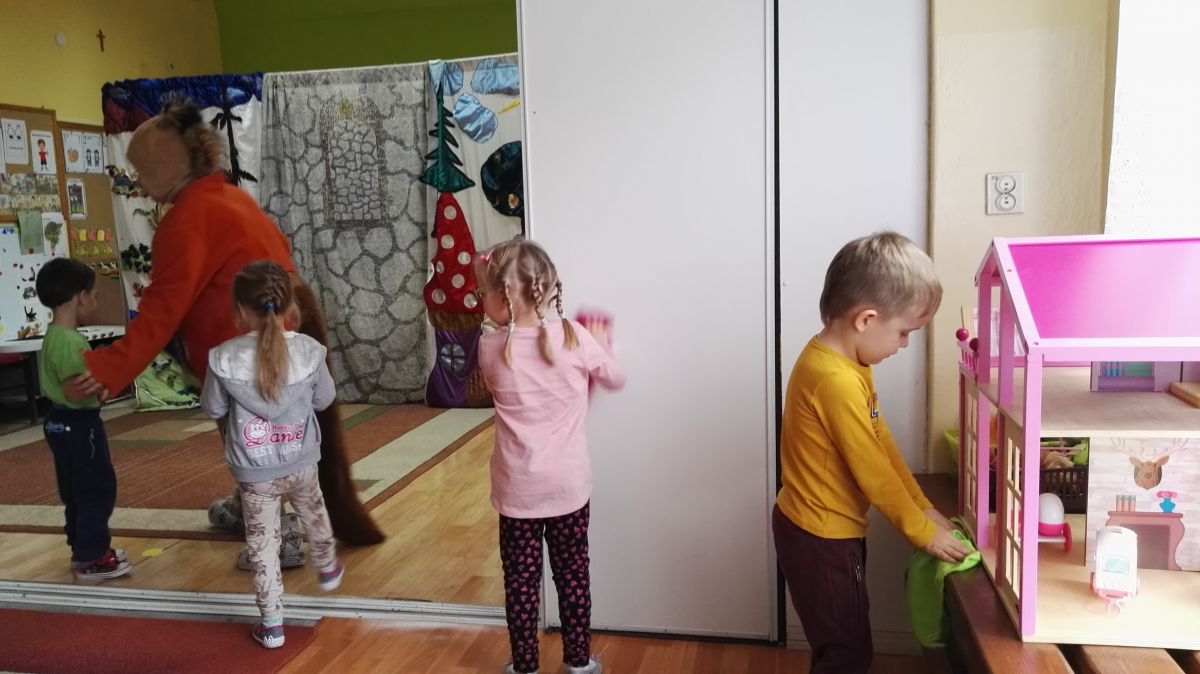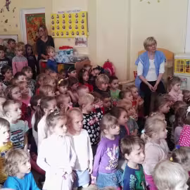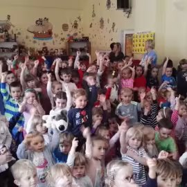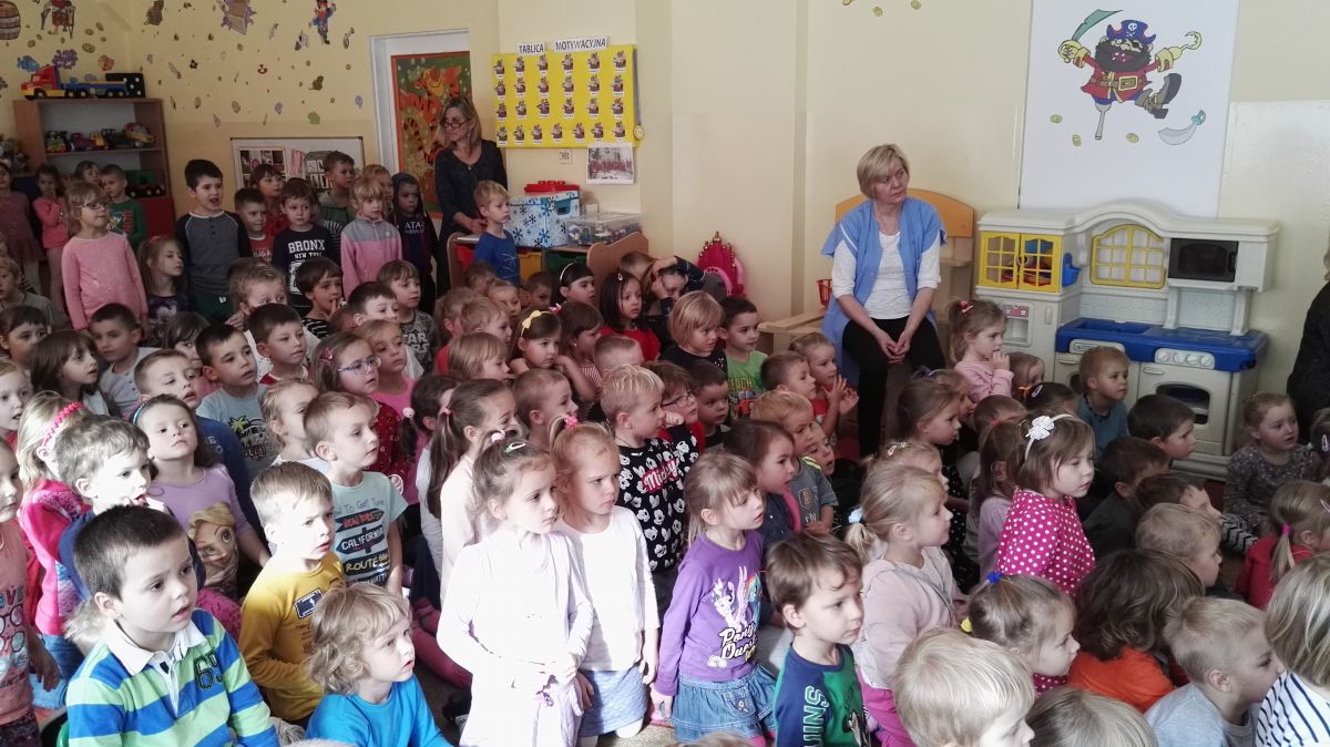 W październiku nasze przedszkole odwiedzili aktorzy Agencji Artystycznej „Kanon” z Krakowa. Dzieci obejrzały z ich udziałem teatrzyk: „Jesień na polanie”. Spotkanie przybliżyło dzieciom wiadomości o sposobach przygotowania się zwierząt do zimy. Przesłaniem sztuki była nauka systematyczności, odpowiedzialności i niesienia pomocy. Wesołe teksty, taniec i włączenie dzieci do wspólnej zabawy sprawiło, że przedszkolaki z zainteresowaniem śledziły losy głównych bohaterów: dzika, wiewiórki, łosia oraz koziołka.